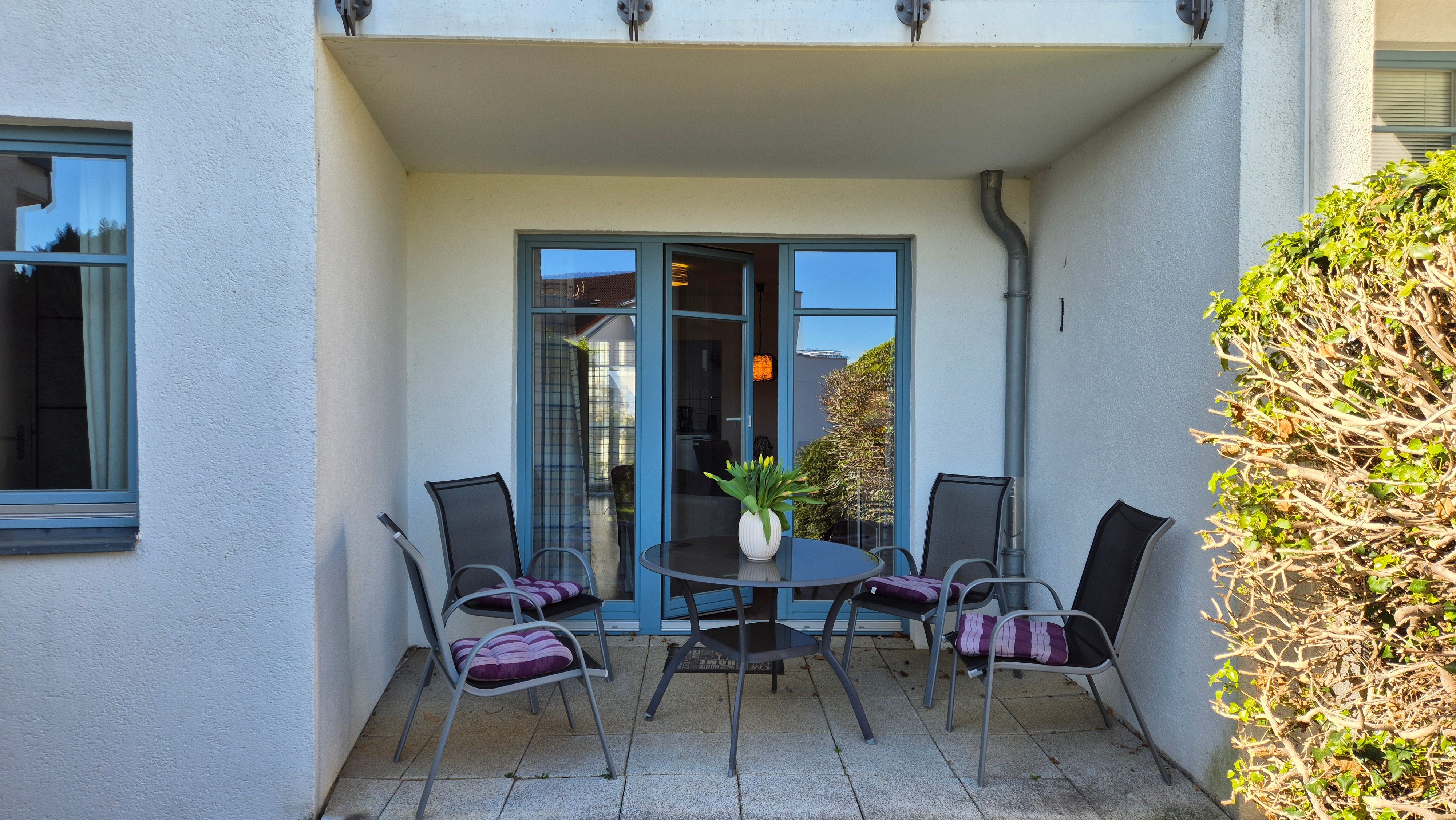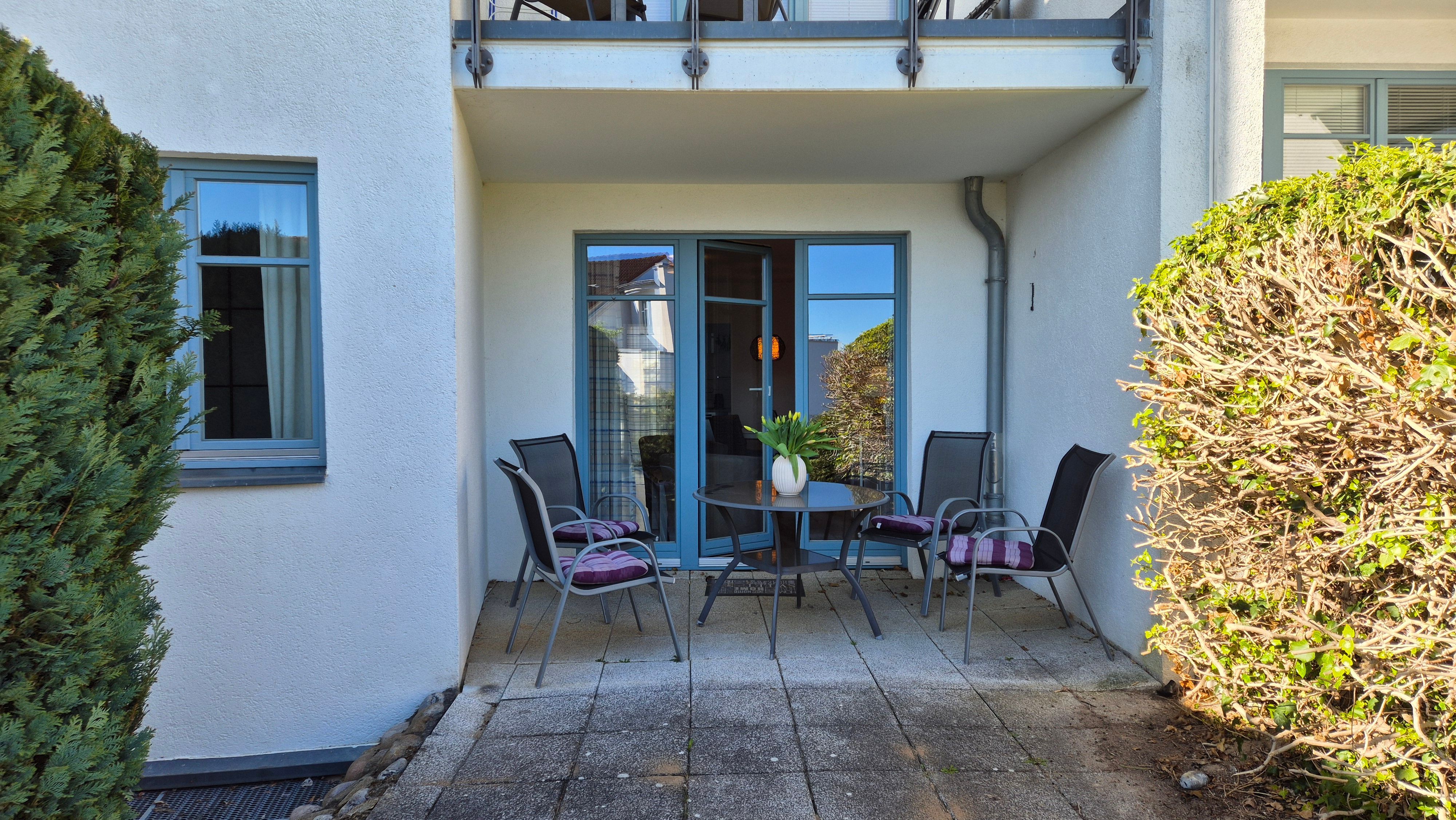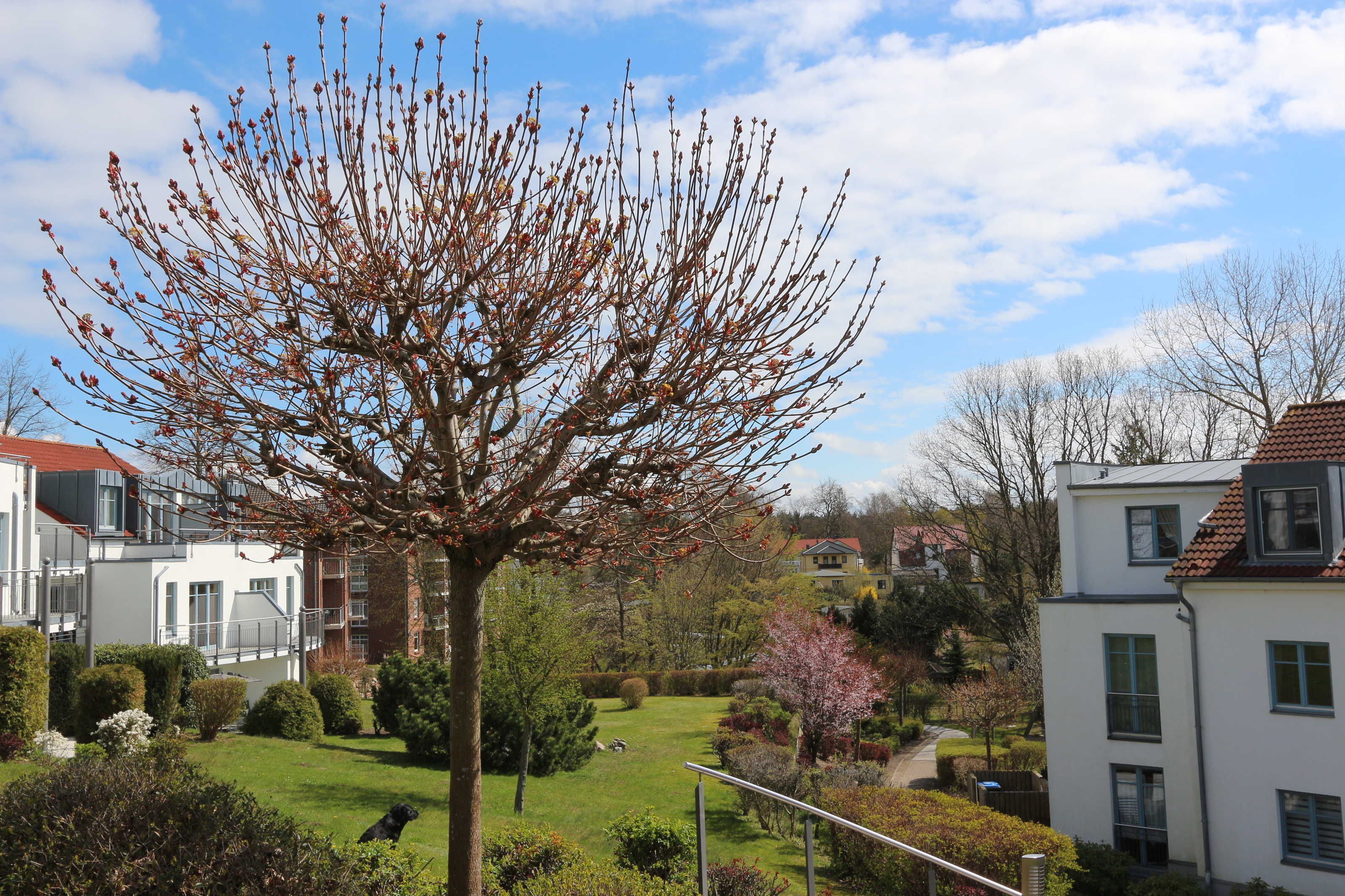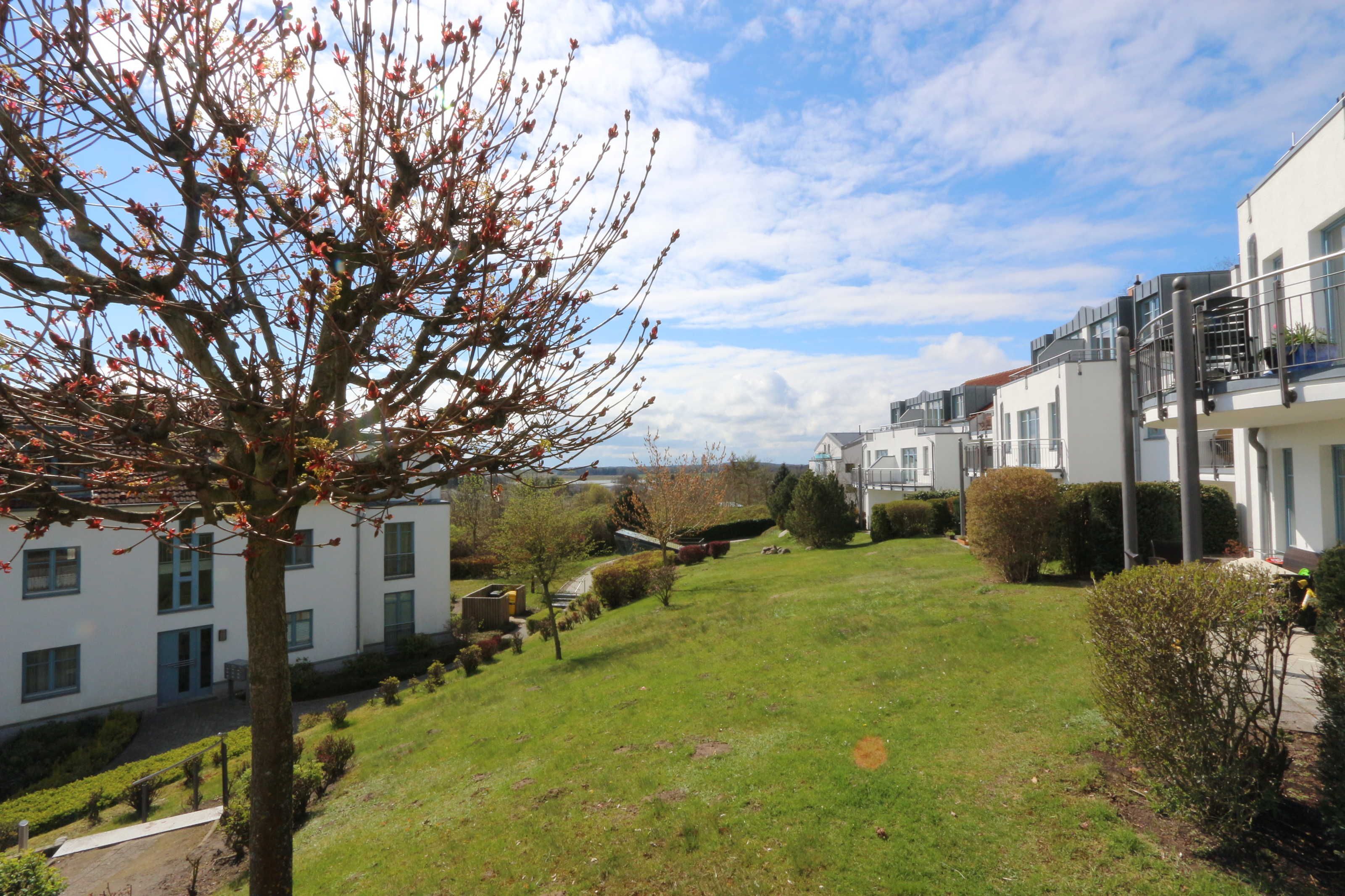 Die komfortable 2-Zimmer-Ferienwohnung (Wohnung 33) befindet sich im Erdgeschoss der Residenz Bellevue in 17454 Zinnowitz, Heimweg 11 und bietet einen schönen Blicke auf das Umfeld und die Landschaft, mit Wald und Achterwasser.
