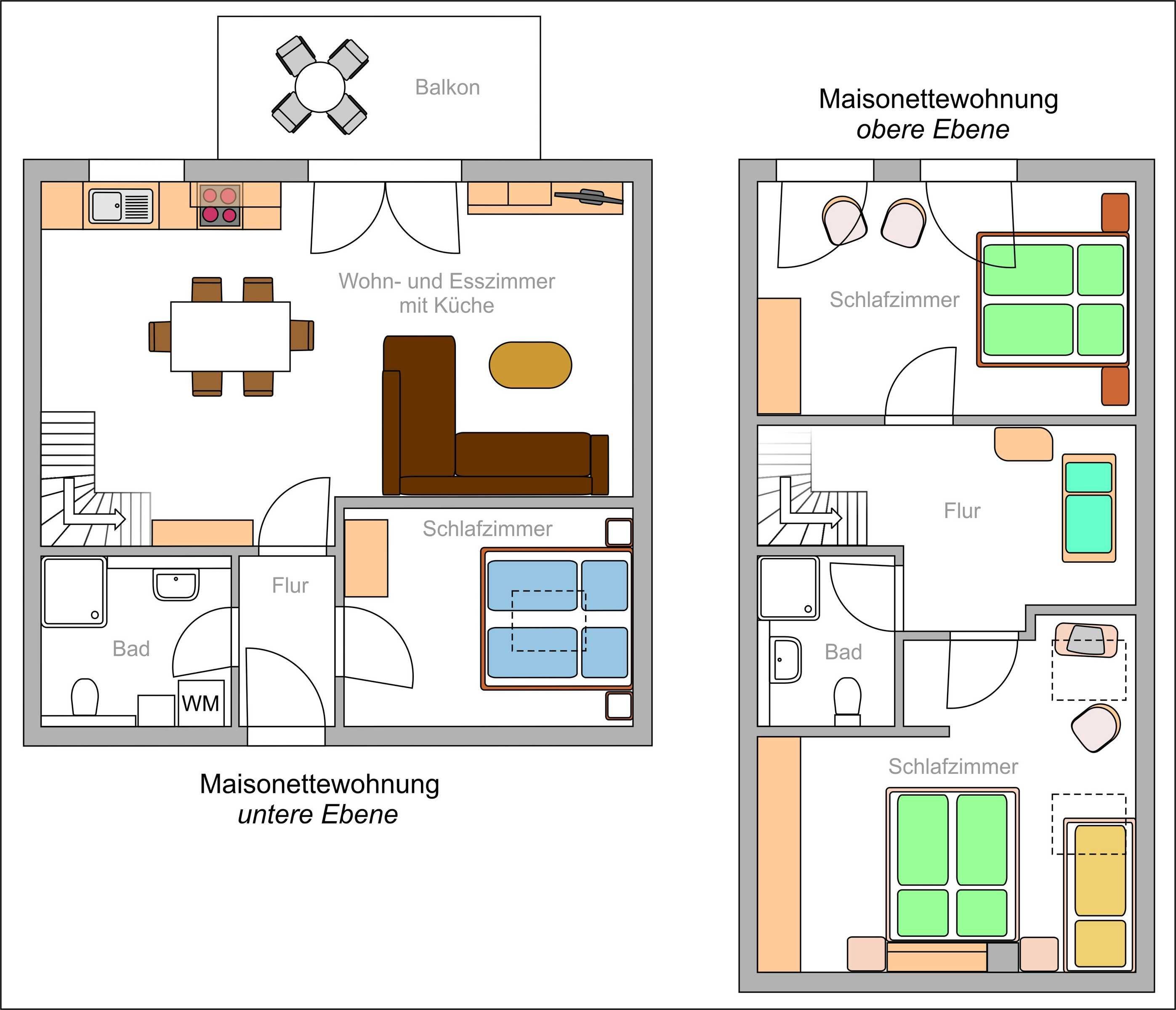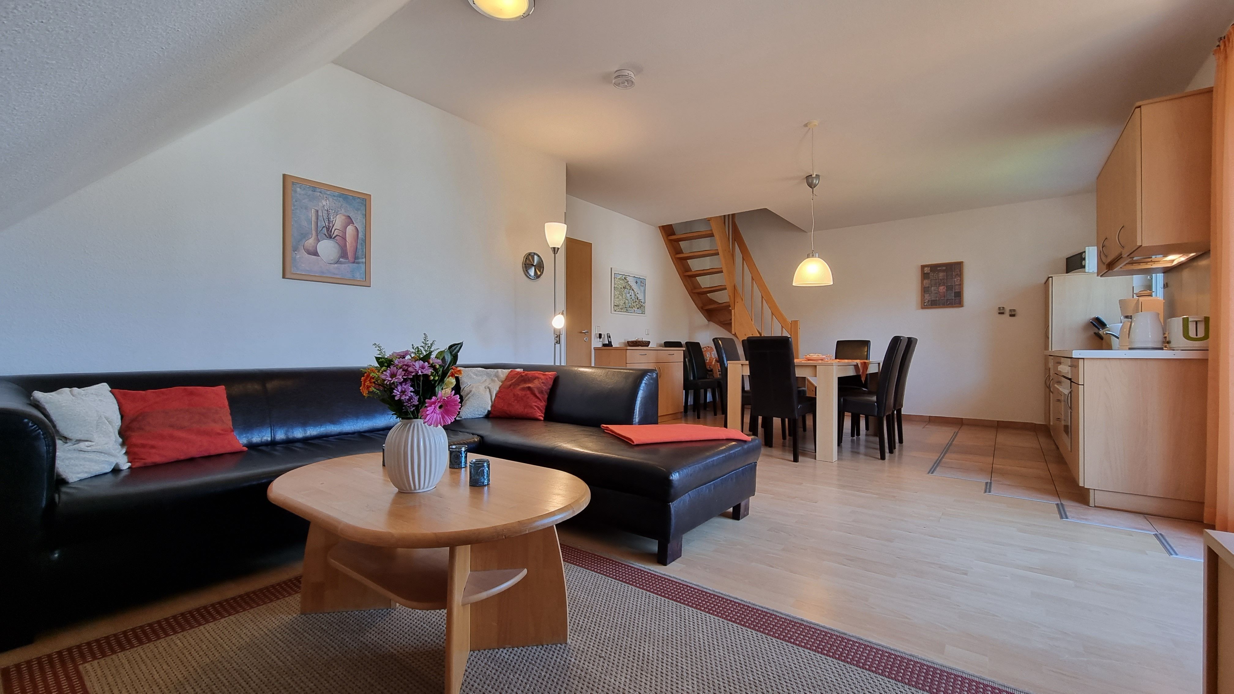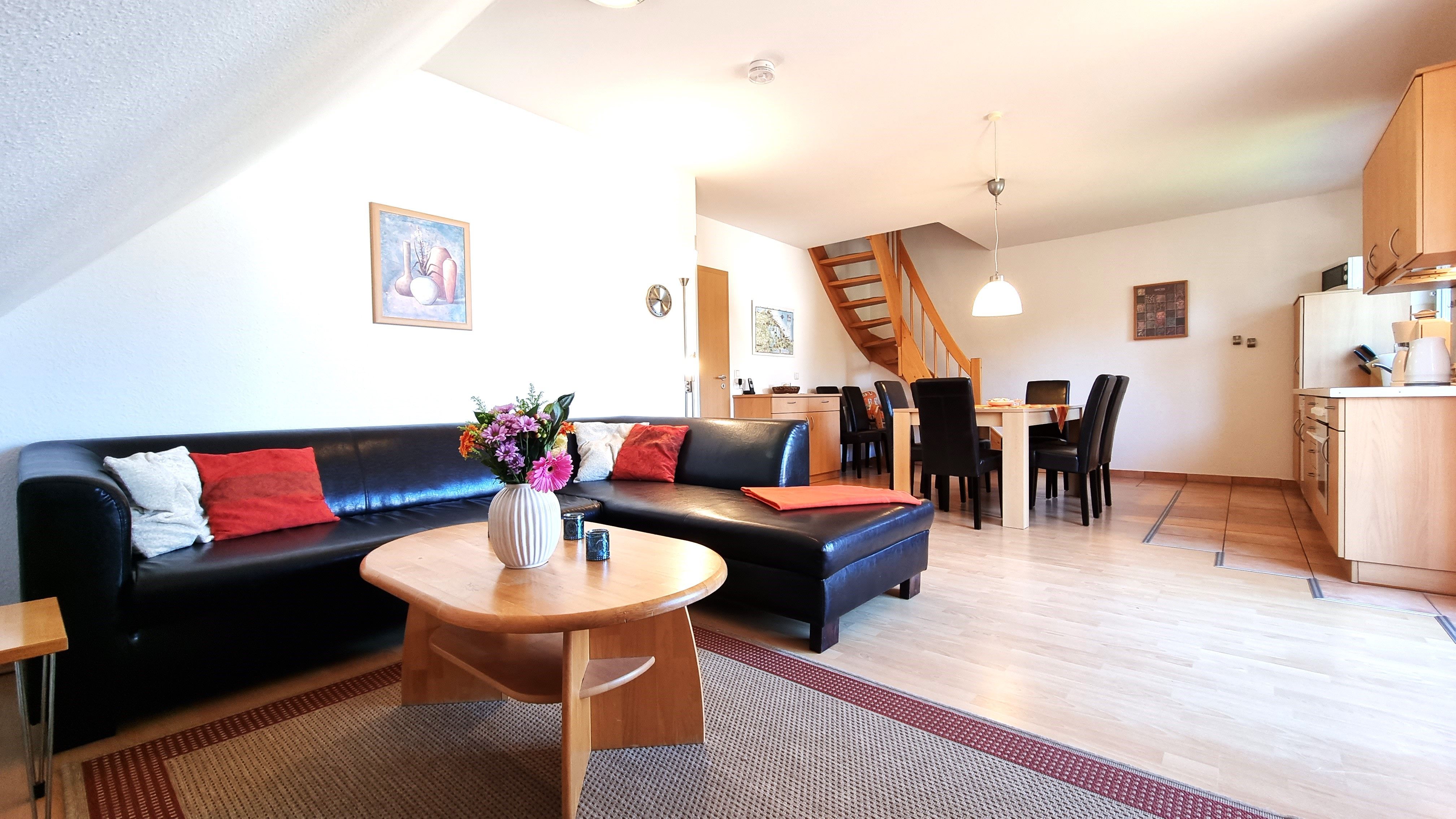 Die 4-Zimmer-Ferienwohnung hat ihren Eingang im 1. Obergeschoss und verfügt über insgesamt 2 Etagen.