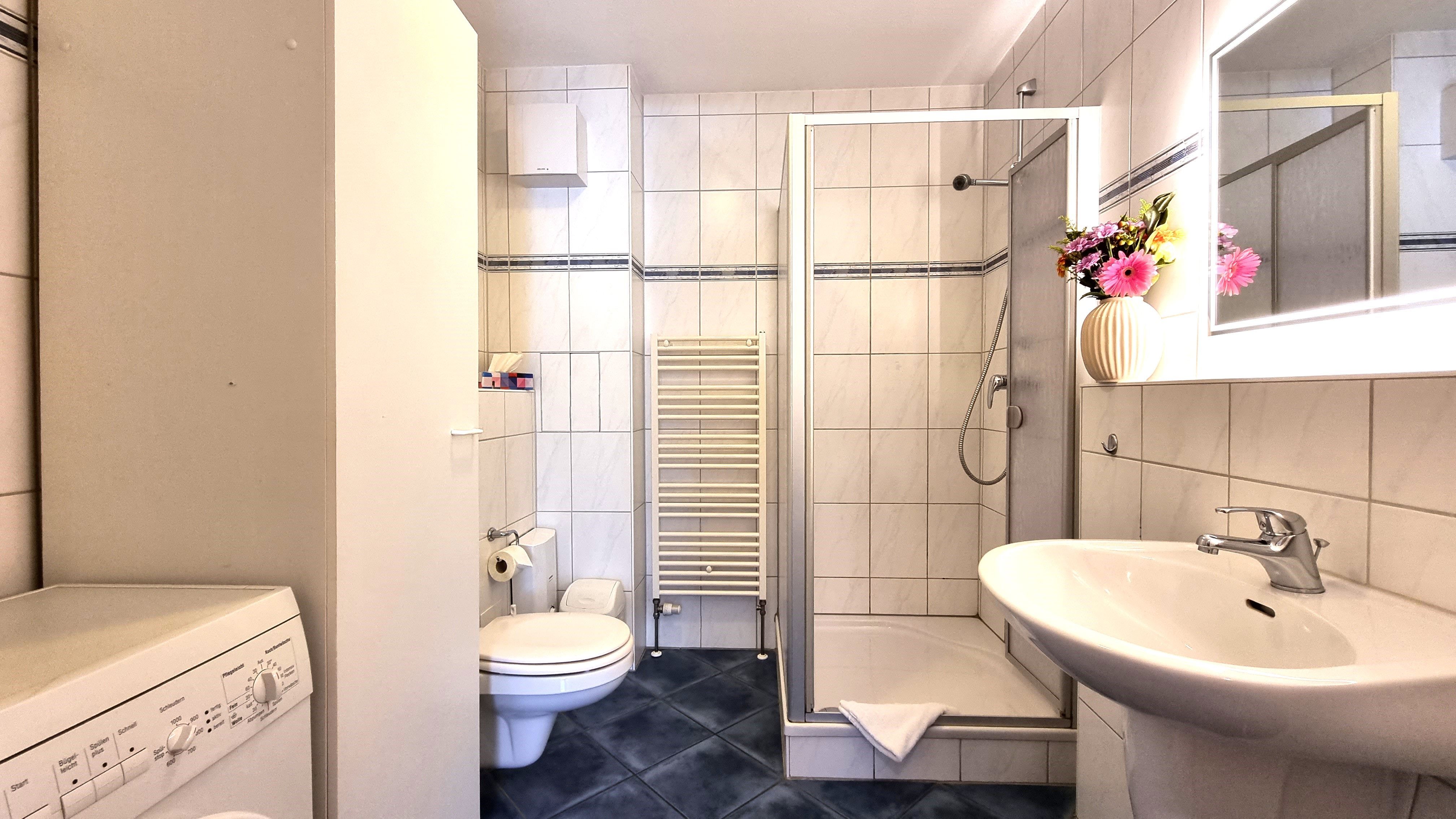 • 1 Bad mit Dusche, Waschbecken, WC, Handtuchtrockner-Heizkörper, Münzwaschmaschine