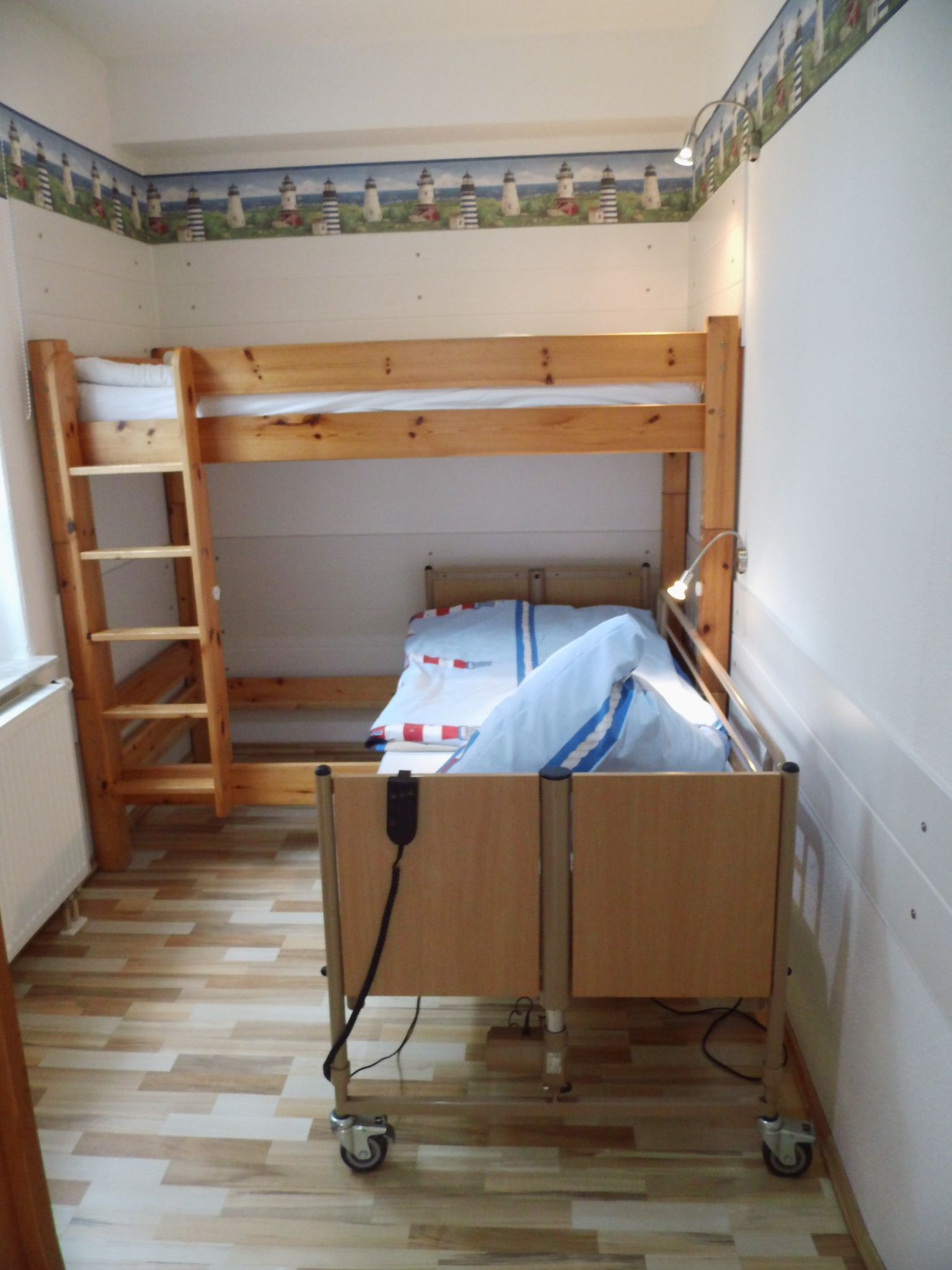 Dieser Schlafraum ist ausgestattet mit einem Etagenbett (195cm x 90cm), Leselampen & Bücherregalen (& Büchern :-) !) und einem Kleiderschrank.