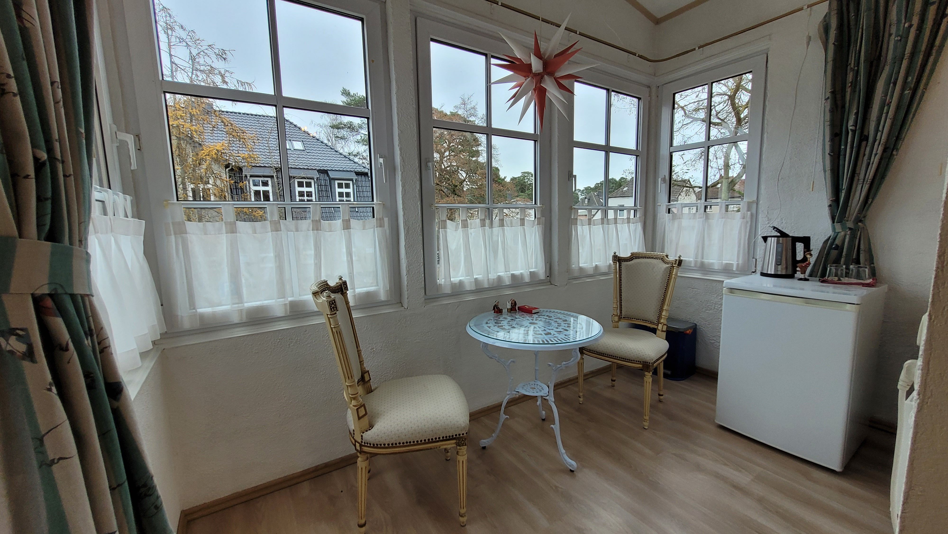 Komfortables Doppelzimmer mit Wintergarten. Ausgestattet mit Dusche/WC, Kabel-TV, Radio, Bettwäsche und Handtücher. Es wird alle 3 Tage gereinigt. Haustiere erlaubt. Gerne kann dieses Zimmer auch als Einzelzimmer genutzt werden! Waschmaschine, Trockner neben dem Frühstücksraum. Die Terrasse & der Spielplatz neben der Villa stehen all unseren Gästen zur freien Nutzung. Ein hauseigener Parkplatz befindet sich hinter dem Haus.