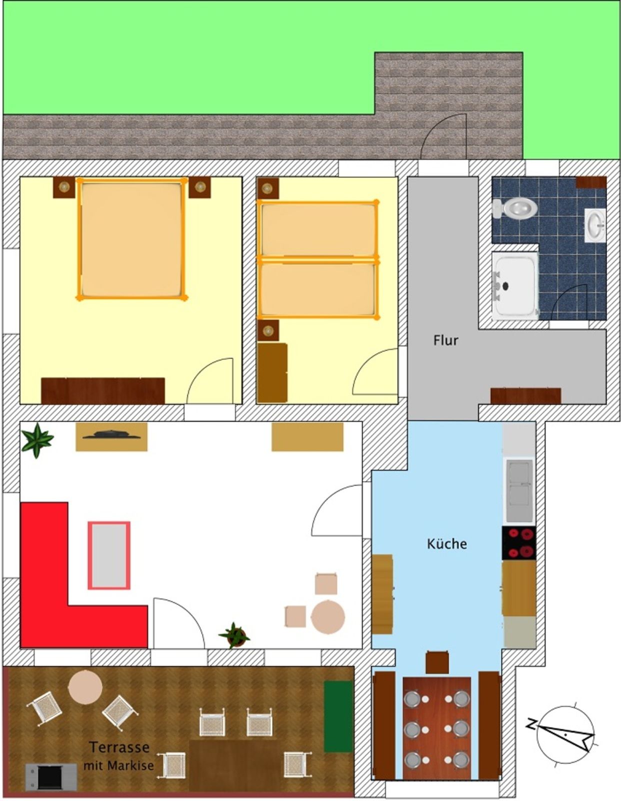 Unsere Ferienwohung 01, (80 qm, mit WLAN) befindet sich im Erdgeschoß und ist für maximal 6 Gäste eingerichtet. Sie ist modern ausgestattet und verfügt über einen Wohnraum mit Schlafcouch, TV und DVD-Player. Die Küche ist komplett ausgestattet mit Herd, Backofen, Kühlschrank, Mikrowelle, Kaffeemaschine, Toaster, Wasserkocher sowie einem Esstisch mit Stühlen. Im ersten Schlafraum steht ein Doppelbett mit Nachtschränken und Leselampen. Im zweiten Schlafraum sind zwei Einzelbetten ebenfalls mit Nachtischen und Leselampen vorhanden. Das moderne Bad verfügt über Dusche, Waschtisch und WC. In der Ferienwohung kann zusätzlich auch ein kleines Kinderreisebett sowie ein Hochstuhl bereit gestellt werden. Eine Erstaustattung von Bettwäsche und Handtücher kann gegen Aufpreis dazu gebucht werden.