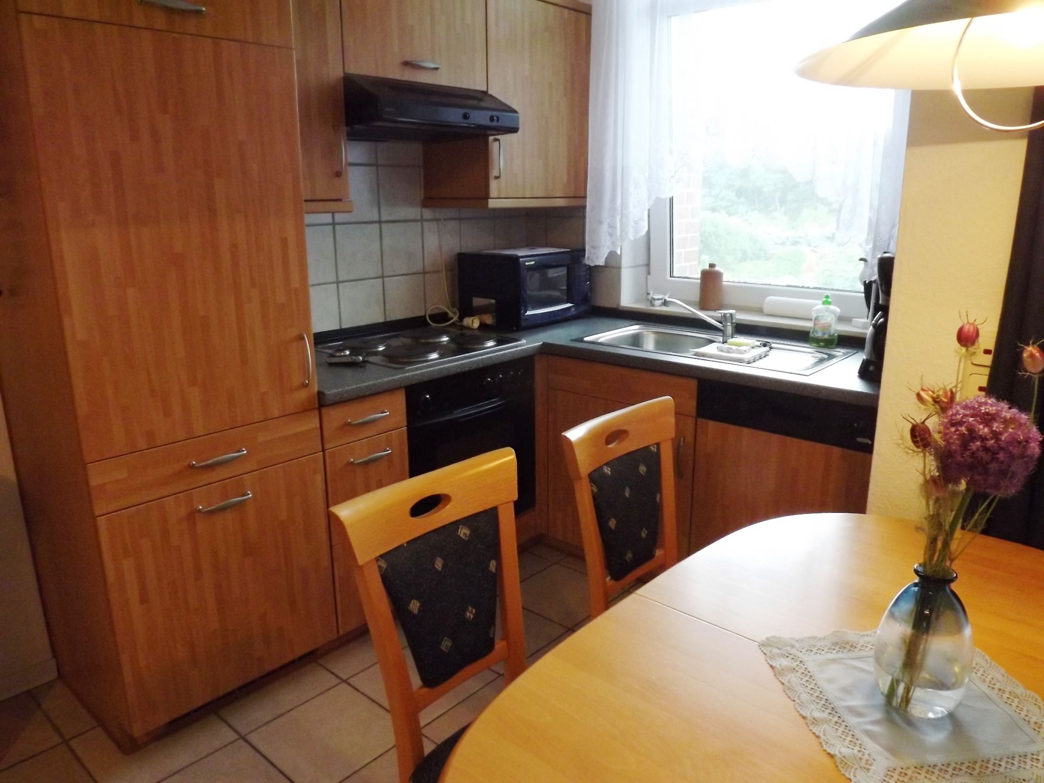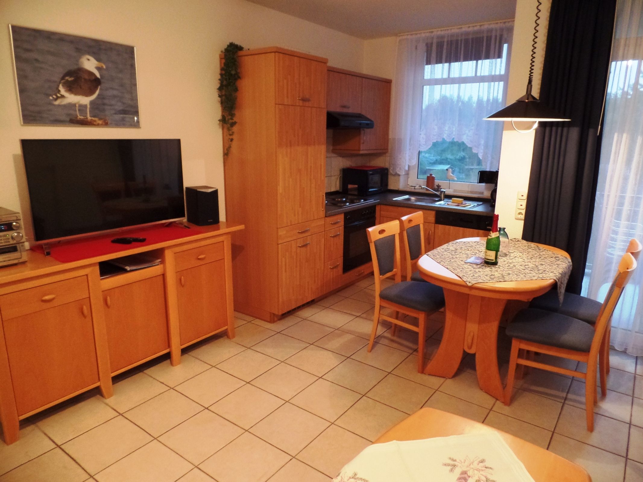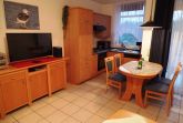Die helle, ca. 38qm große Ferienwohnung ist ideal für 2 -3 Personen geeignet und verfügt über einen möblierten Balkon. Der kombinierte Wohn-Essbereich ist mit einem bequemen Sofa (Aufbettungsmöglichkeit für 3. Person Liegefläche 1,40x2,00m), einem Sessel, großem Flat-TV, CD-Player und Sideboard ausgestattet. Die offene Küche erwartet Sie mit einem 4-Platten-Herd, Backofen, Geschirrspüler, Kühlschrank mit Gefrierfach, Kaffeemaschine, Wasserkocher und Toaster. Das separate Schlafzimmer ist mit zwei Kastenbetten (je 90x200cm), Nachttischen sowie einem Kleiderschrank eingerichtet. Das Badezimmer verfügt über Dusche/WC, Waschbecken sowie einen Haartrockner.
