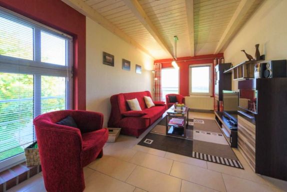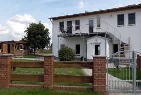 Die Ferienwohnung befindet sich im 1. Obergeschoss (links) des Hauses und ist über eine Außentreppe erreichbar. Genießen Sie, vom Balkon aus, einen herrlichen Blick über das Haff oder lassen Sie, bei einem schönen Sonnenuntergang, die Seele baumeln.