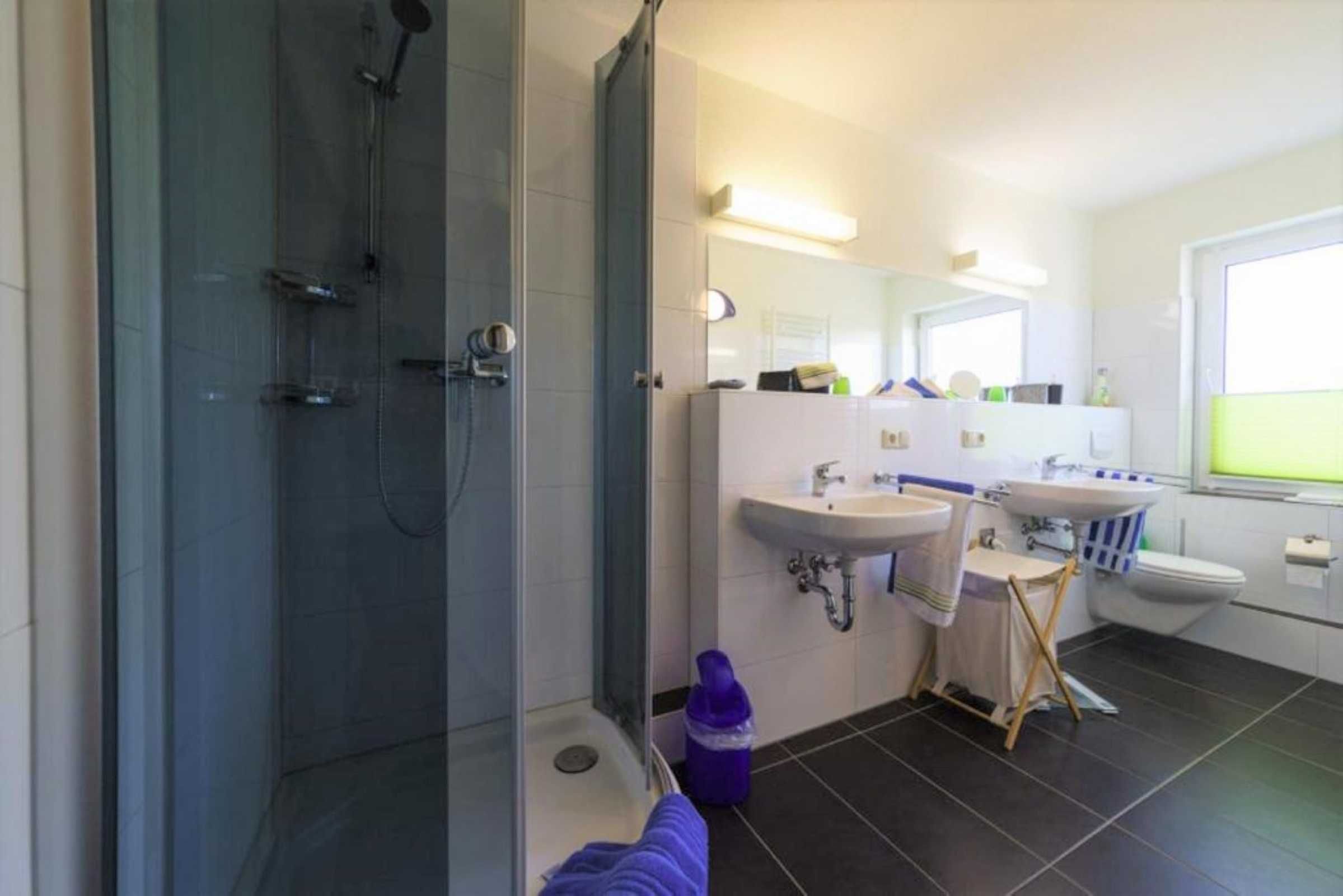 Das großzügige Bad verfügt über eine Badewanne mit Duschabgrenzung, WC und einem Haarföhn sowie zwei Waschbecken.