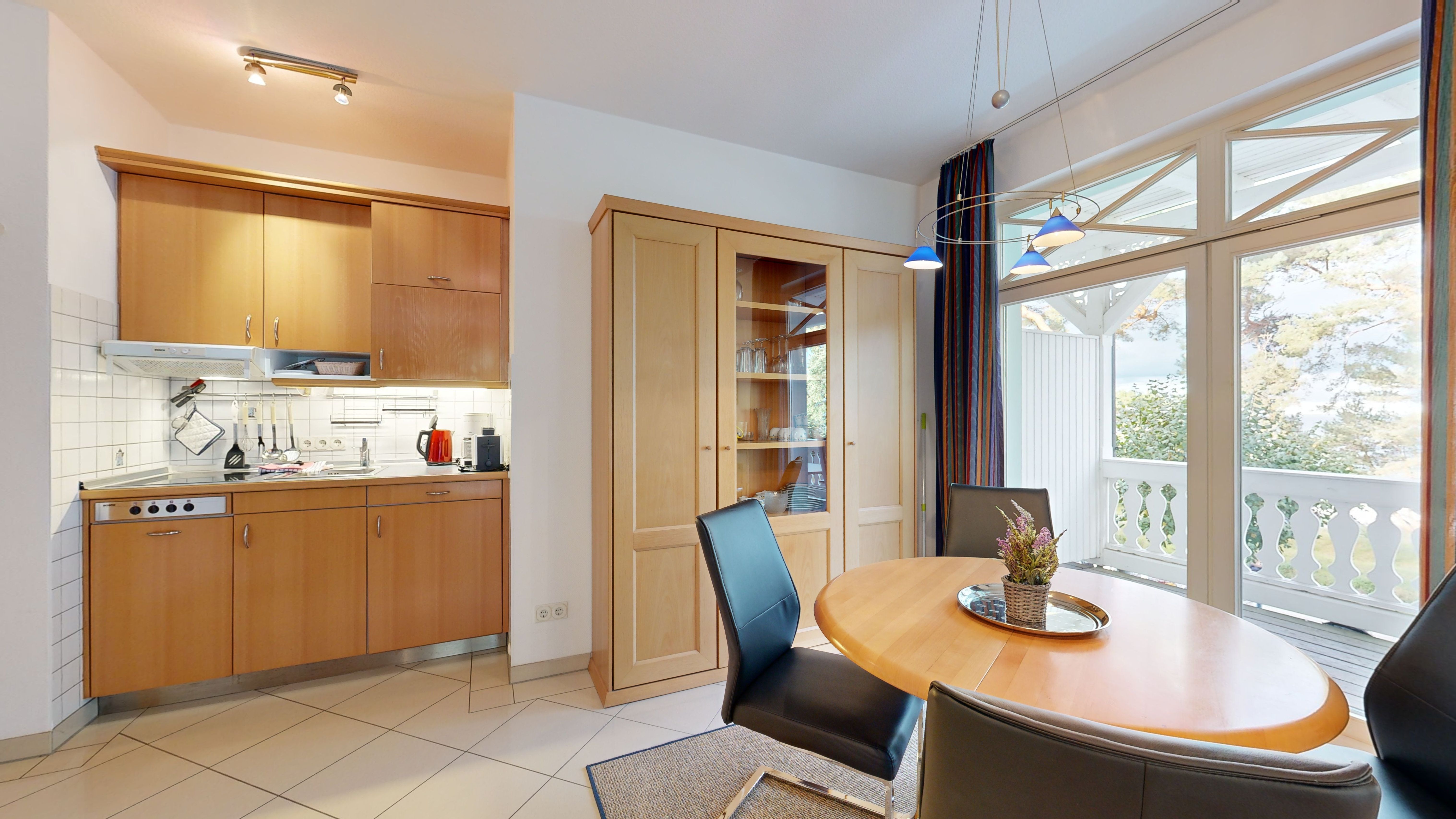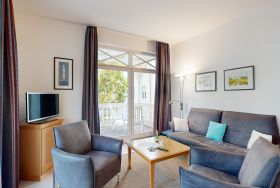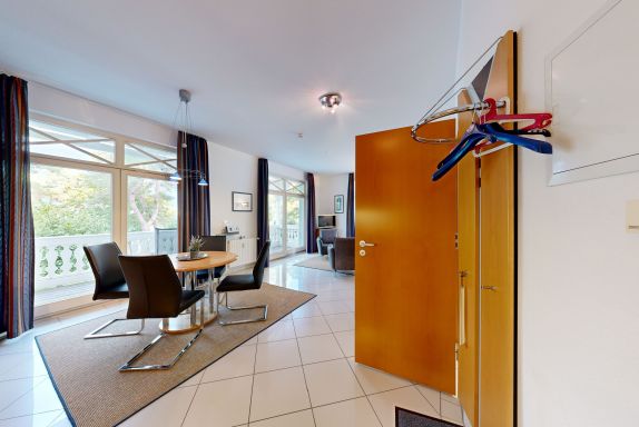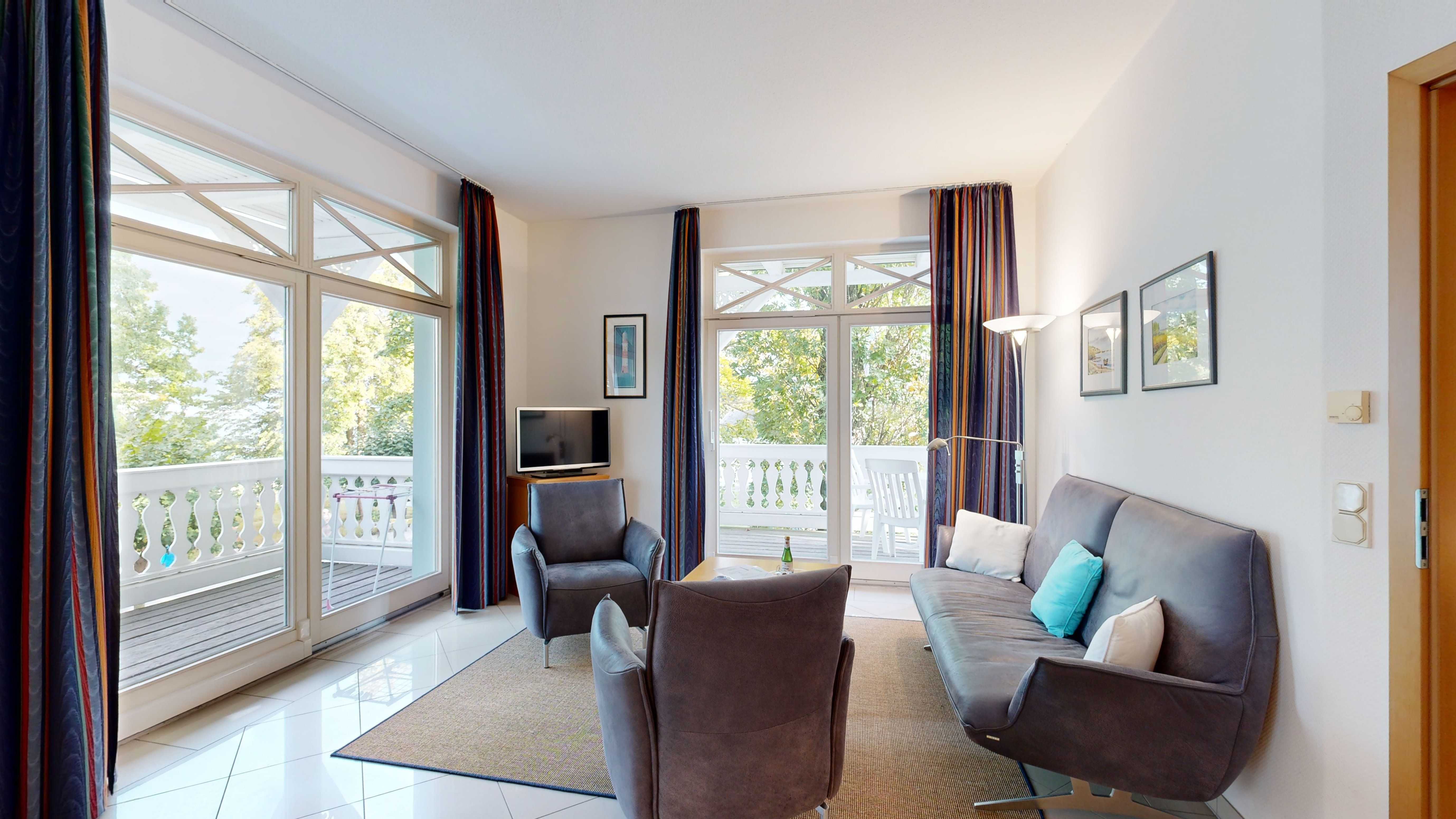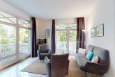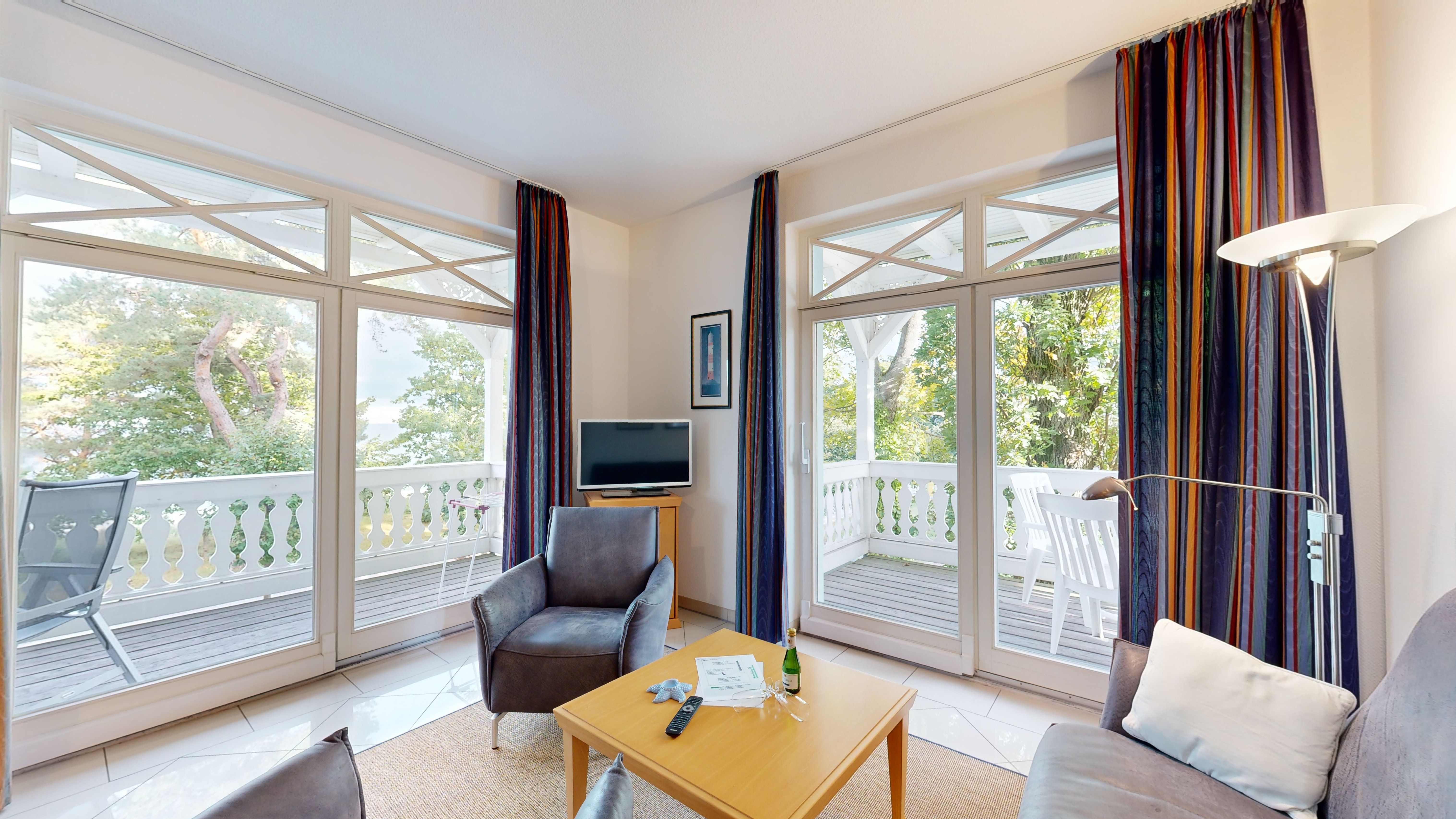 4-Sterne-Ferienwohnung in der Villa Strandburg im 1. OG (2 Zimmer / 58 m²) mit 2 großen Balkone mit herrlichem Ostseeblick, Seebrücke und Kreidefelsen.