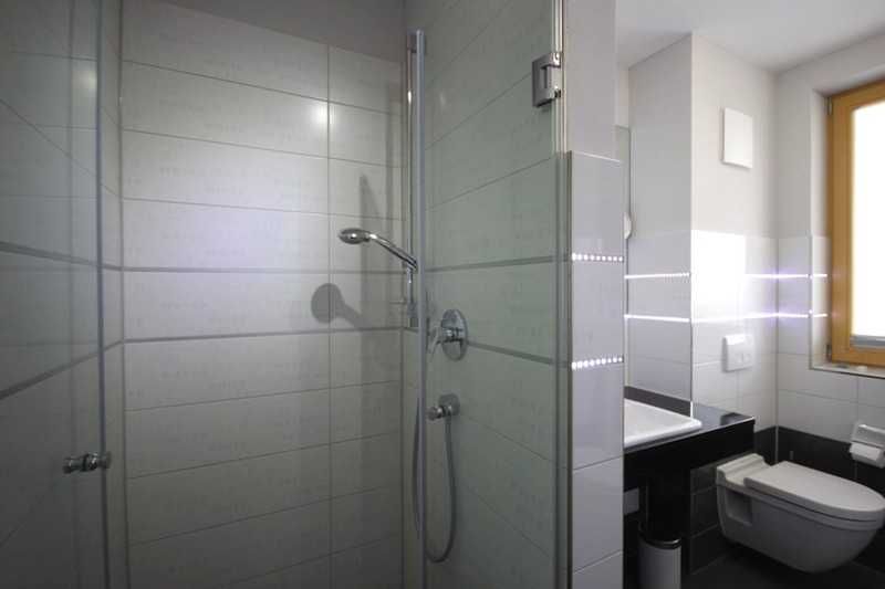 Das großzügige moderne Badezimmer mit Fenster verfügt über eine bodengleiche Dusche, Fön, beleuchteten Kosmetikspiegel und Badhocker. Die besonders gestalteten Fliesenwände mit LED-Licht machen aus dem Bad eine Wohlfühloase.