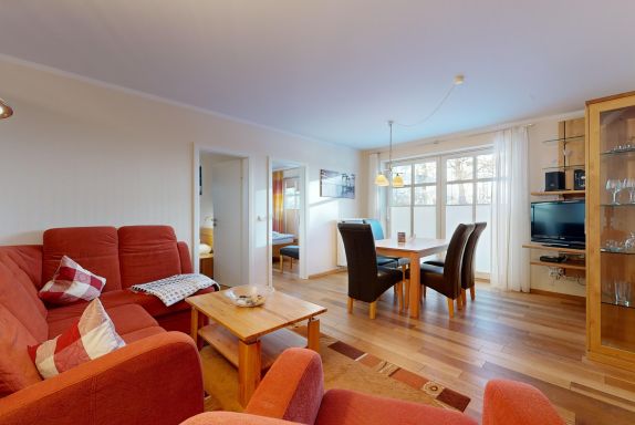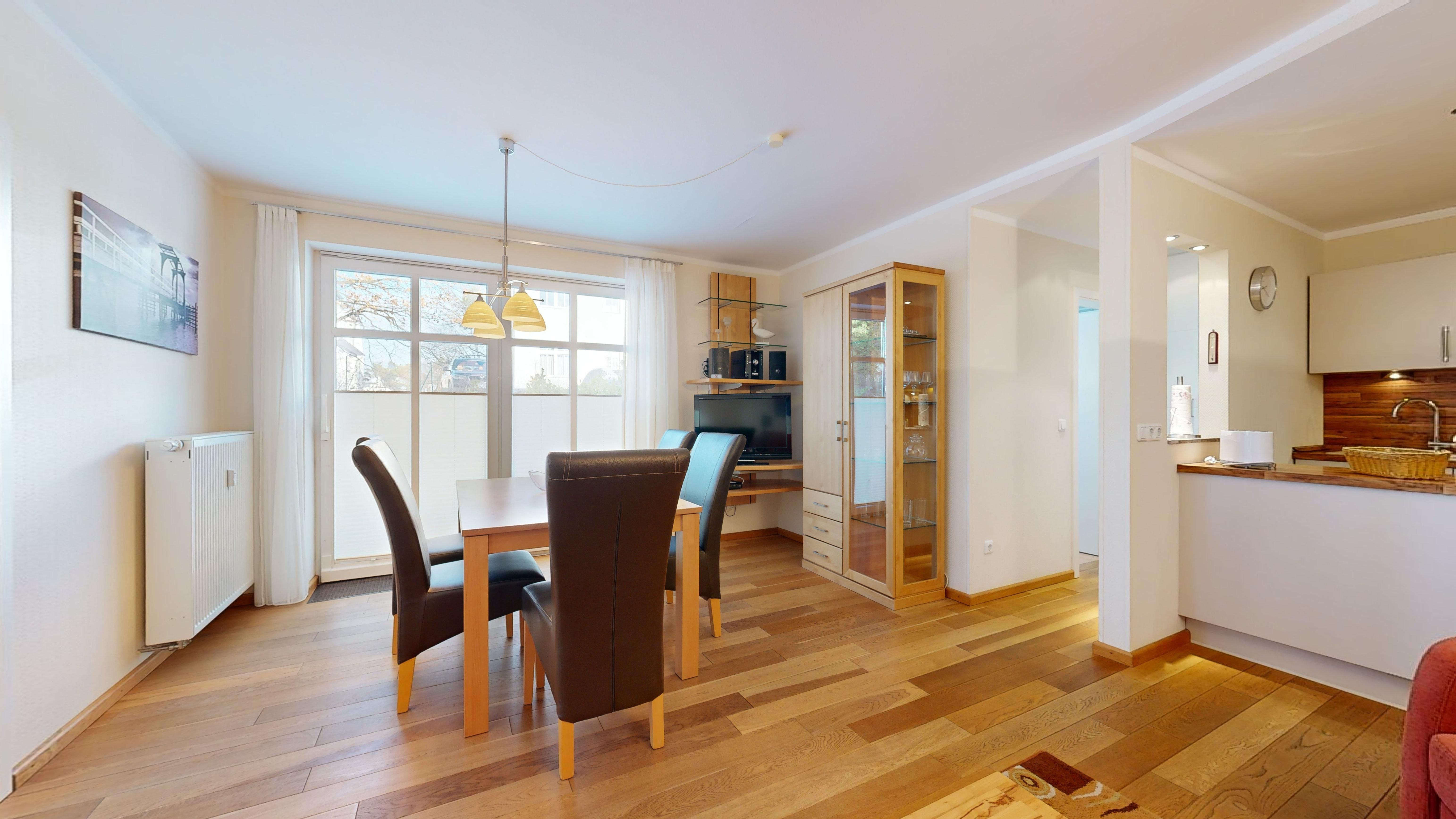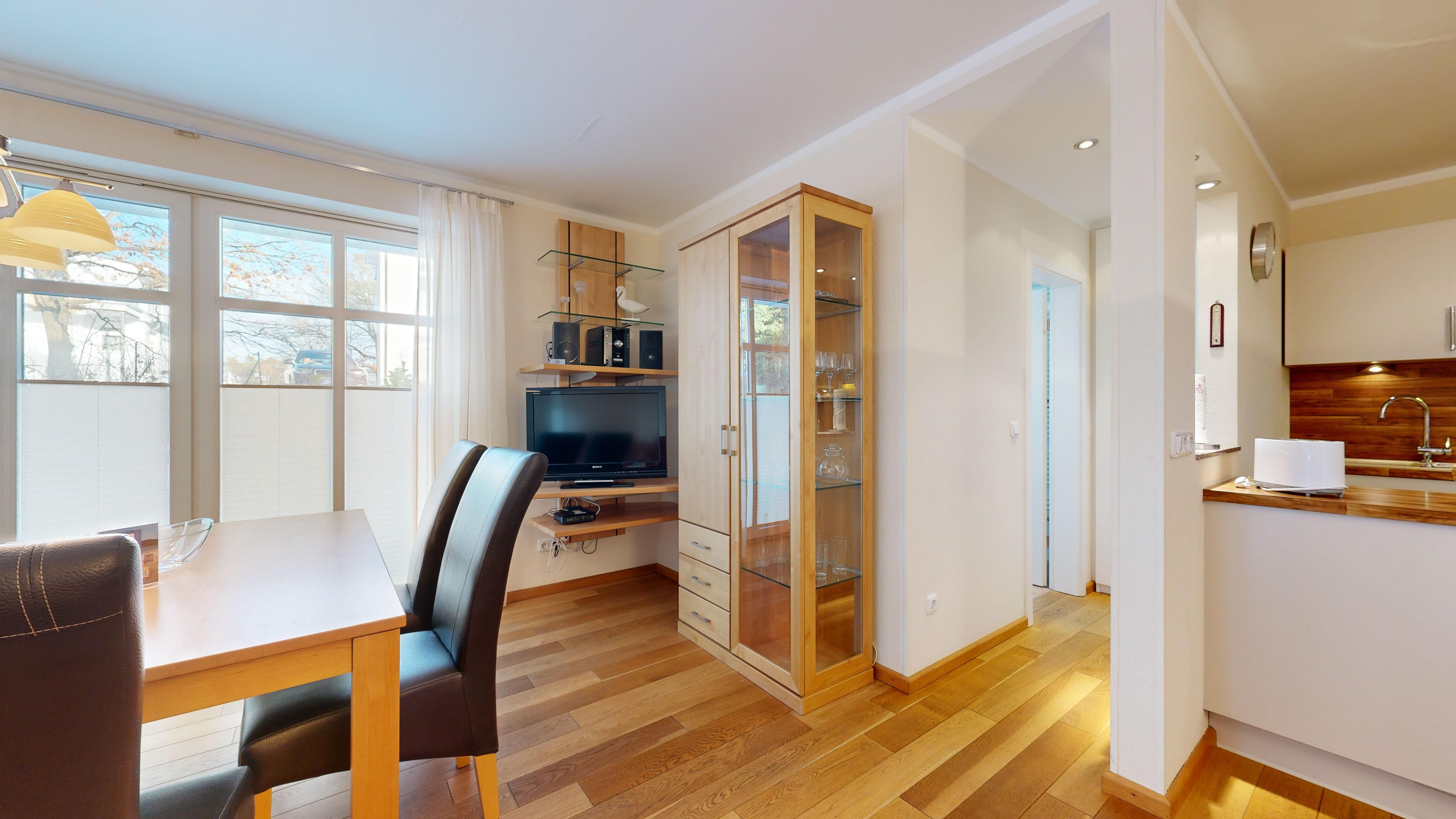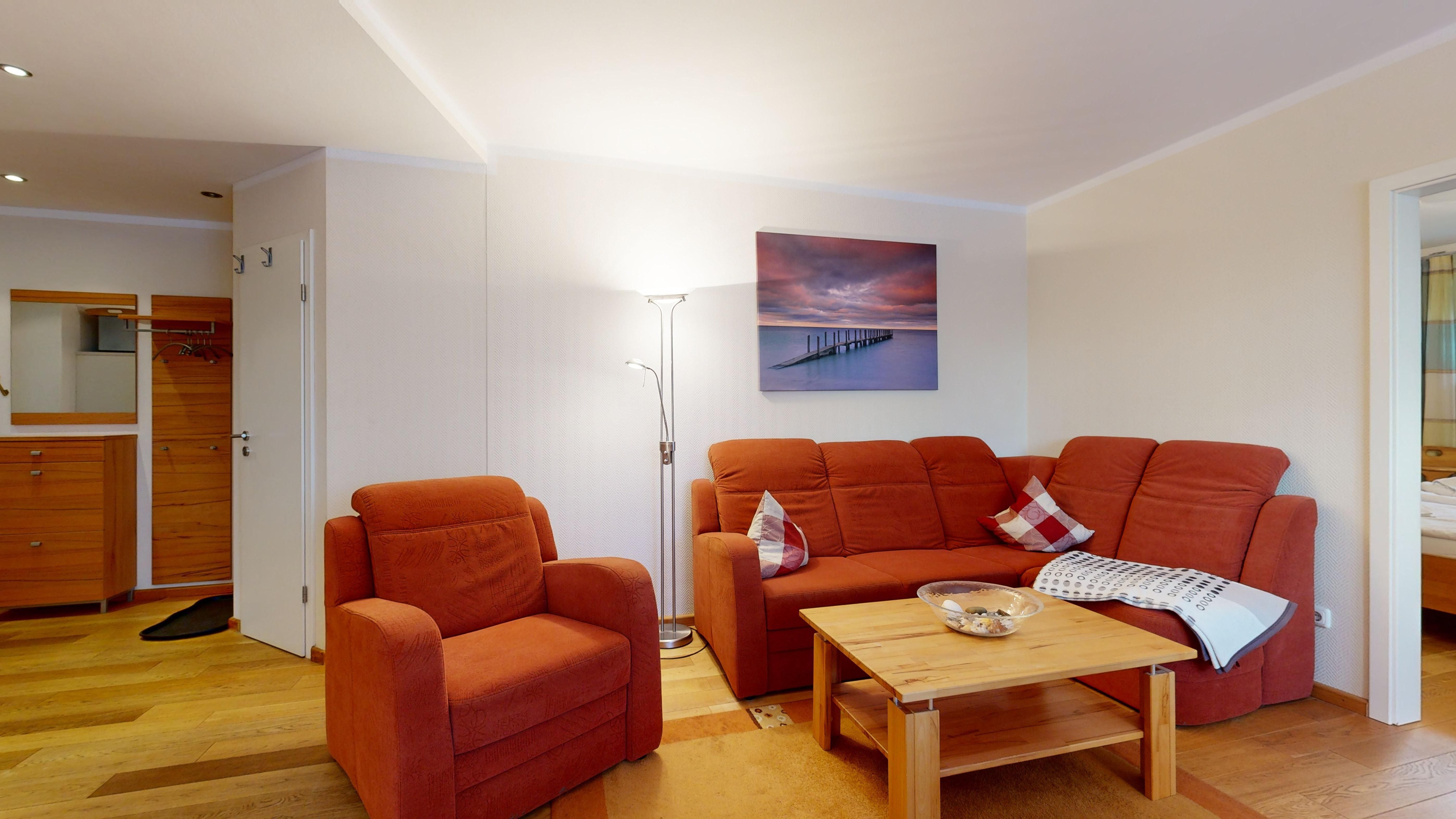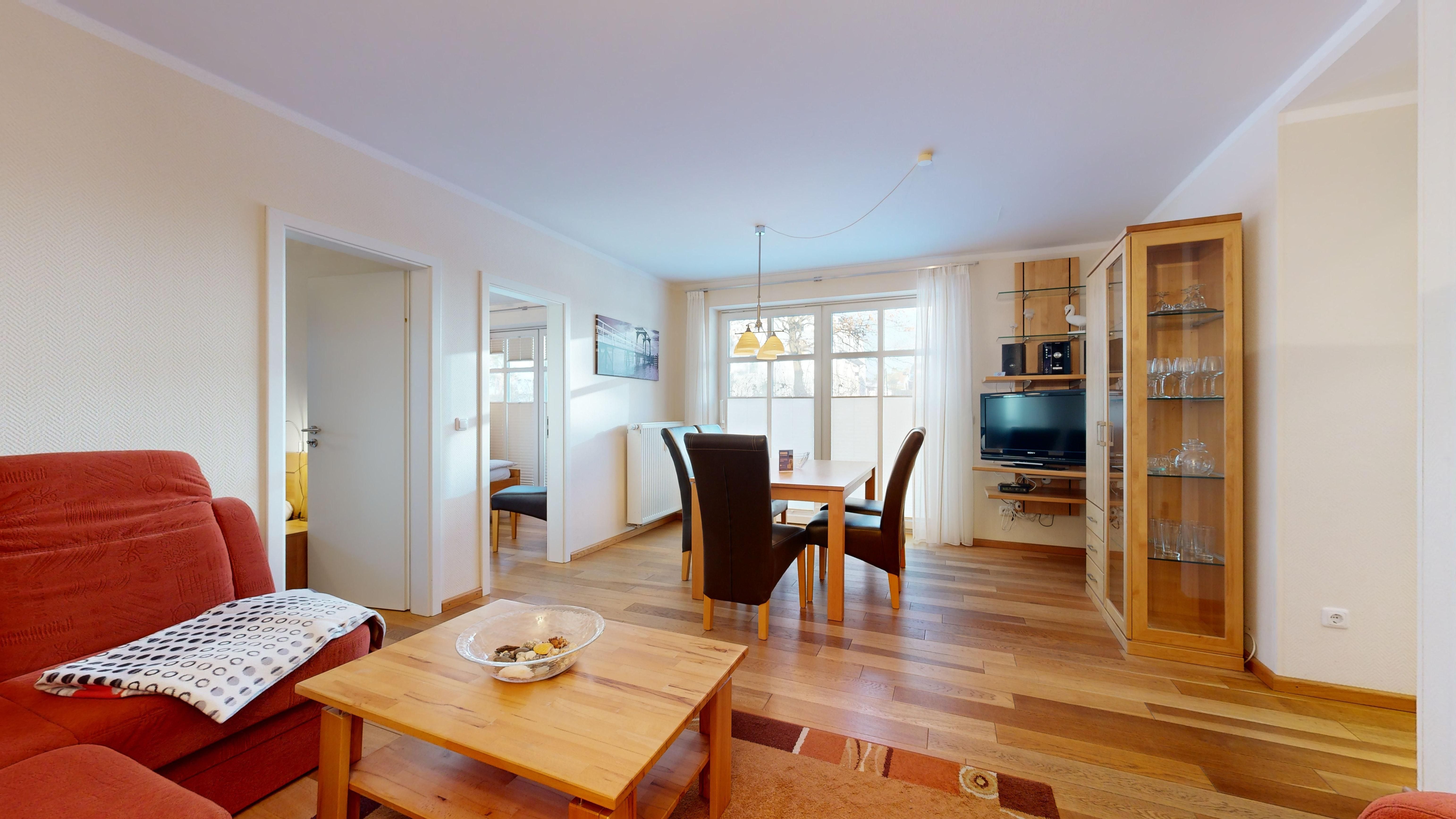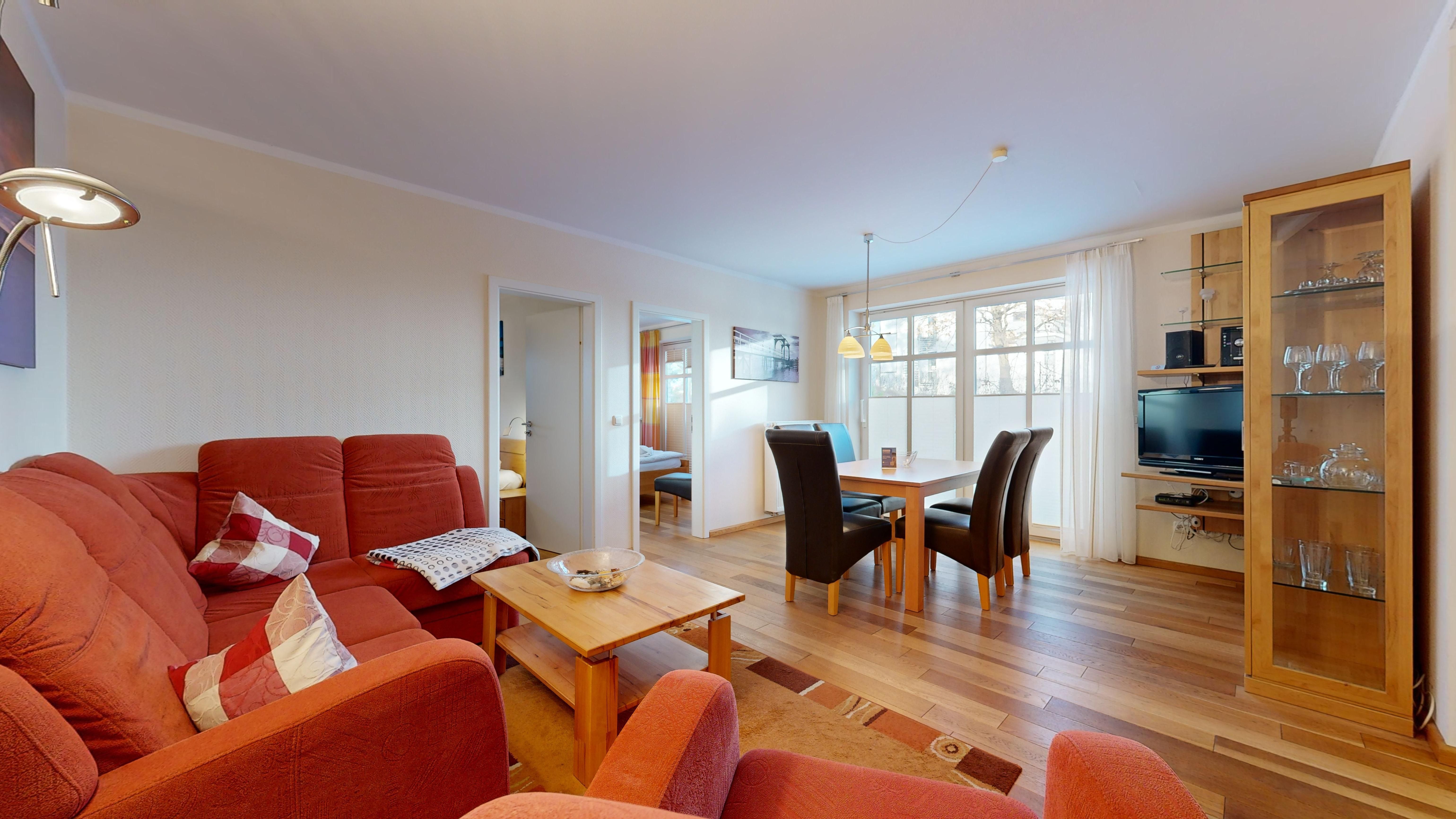 Wohnzimmer: Echtholzparkett-Böden, Couchgarnitur, Kabel-TV, CD-Player, W-LAN-Internetanschluss, Essplatz