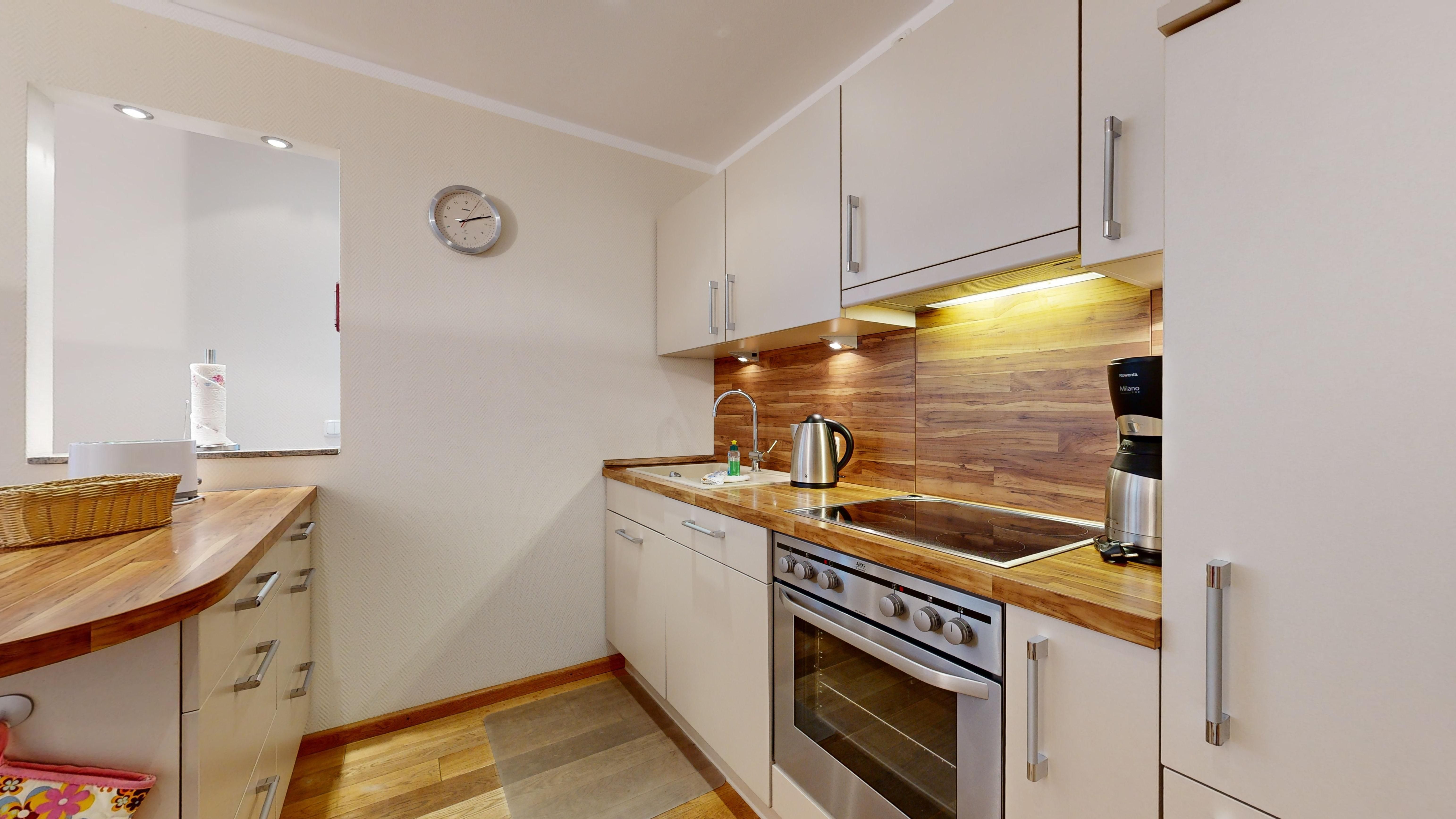 Küche: Moderne Küchenzeile, E-Herd mit Backofen, Spülmaschine, Mikrowelle, Kaffeemaschine, Toaster und Wasserkocher