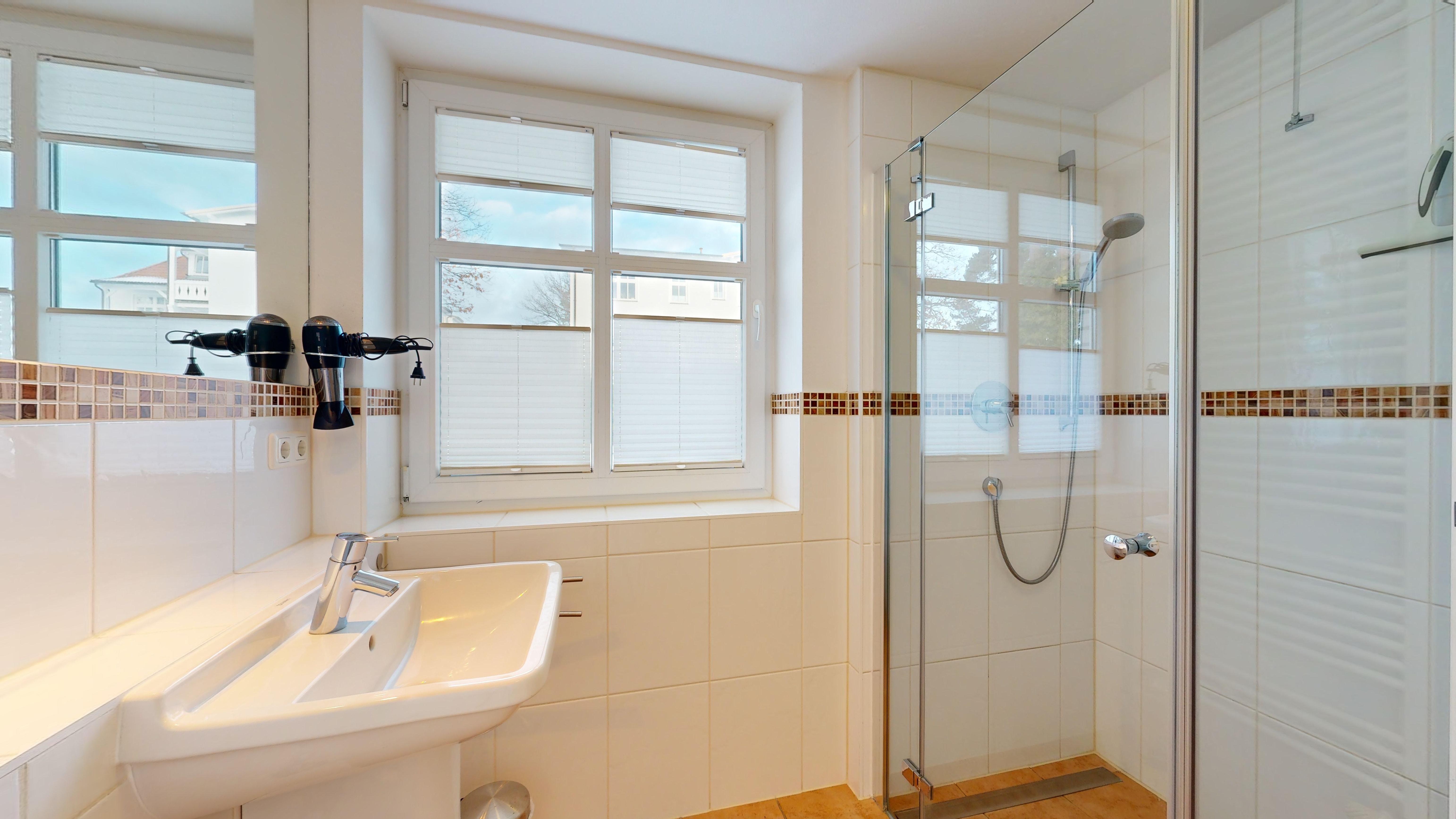 1 Badezimmer mit Dusche, WC, Föhn und Fußbodenheizung