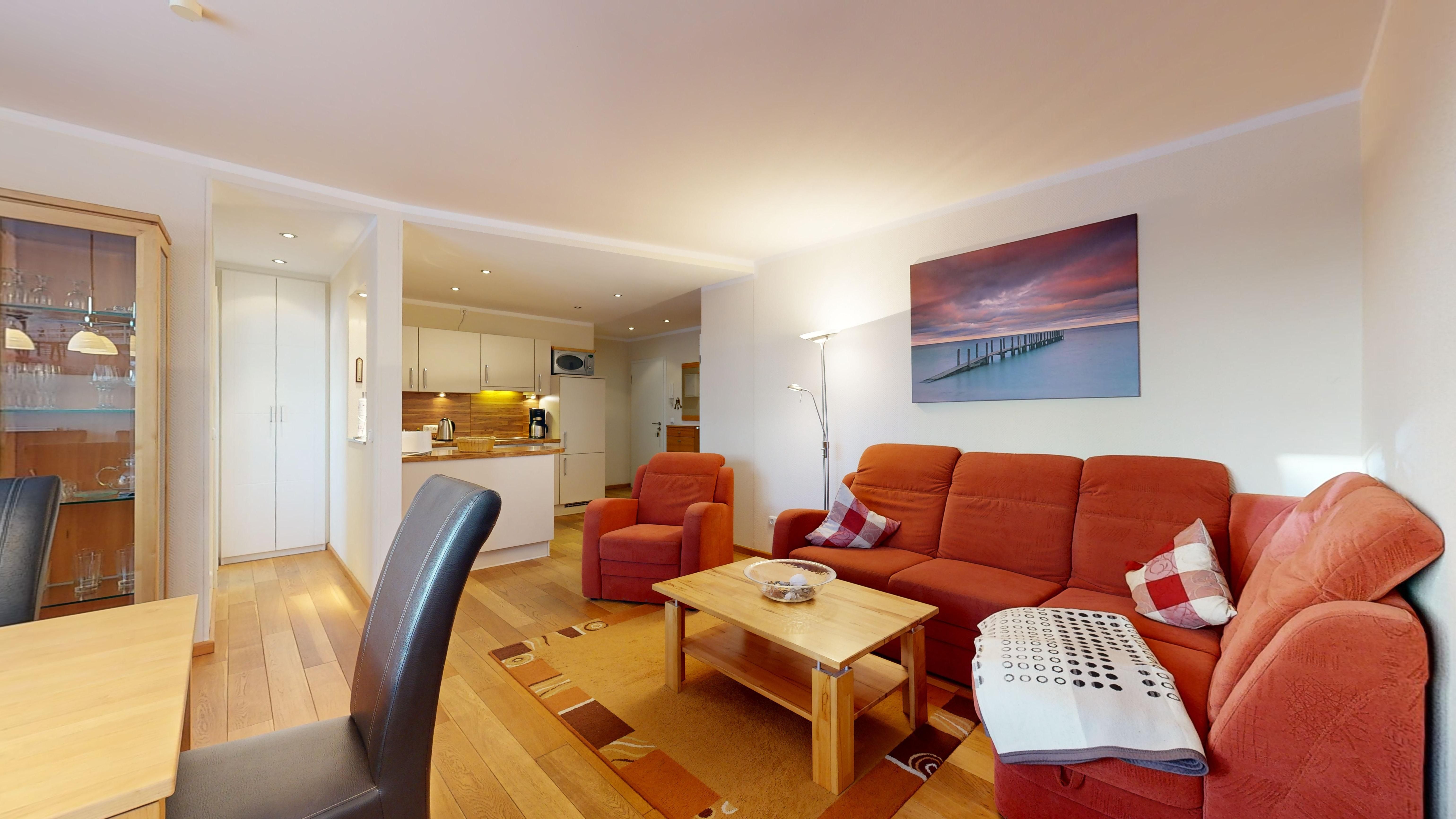 Eine hochwertig ausgestattete Ferienwohnung mit 2 Schlafzimmern, Fußbodenheizung, W-LAN-Internetanschluss, Tiefgaragenstellplatz und Strandkorb am Strand inklusive.