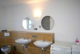 * Bad mit Dusche, Doppelwaschbecken, gefliest, Waschmaschine,