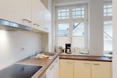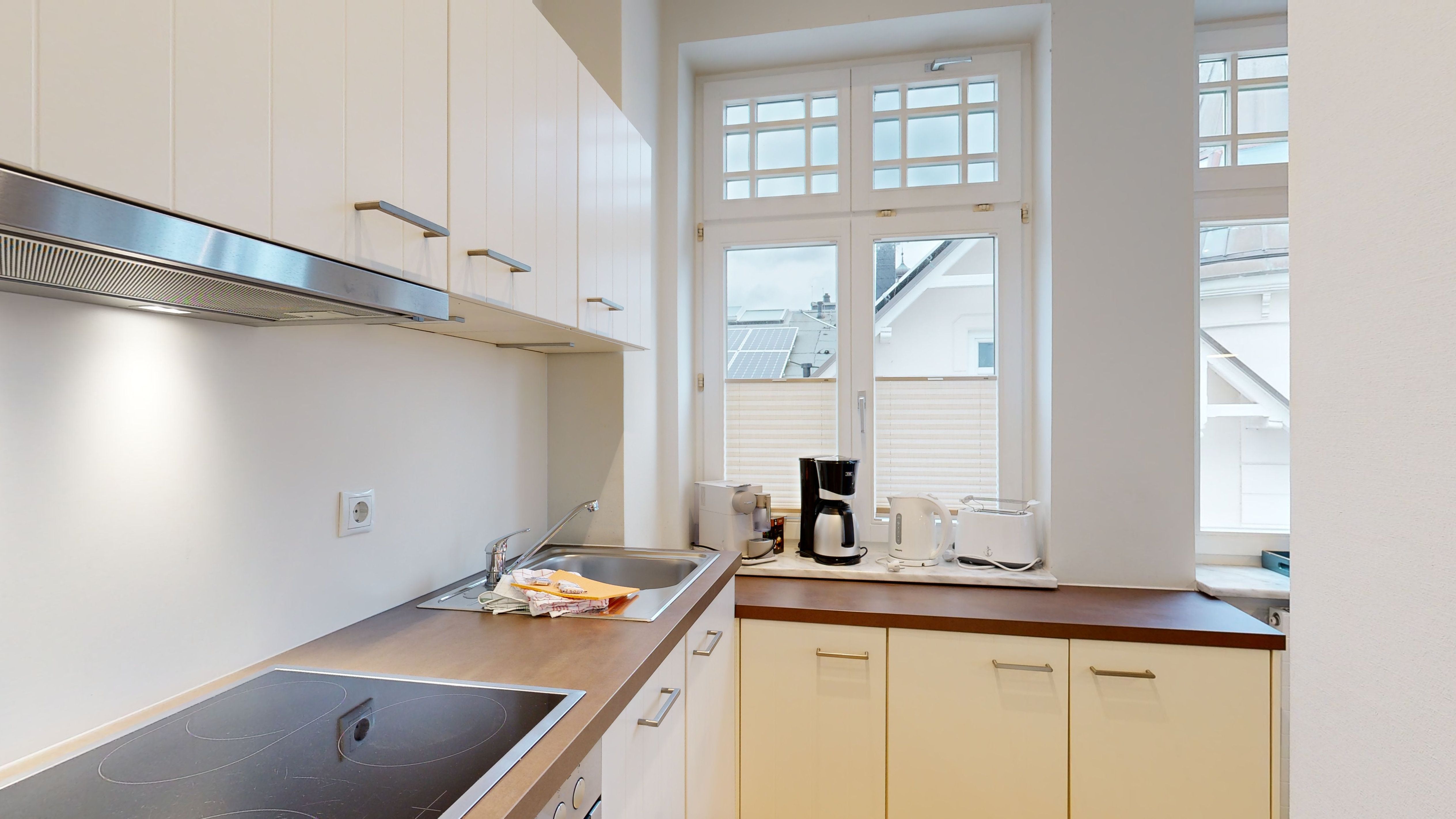 komfortable Küchenzeile: Ceran-Herd mit Backofen, Spülmaschine, Mikrowelle, Nespresso-Kaffeemaschine, Wasserkocher, Toaster, Bügelbrett und Bügeleisen