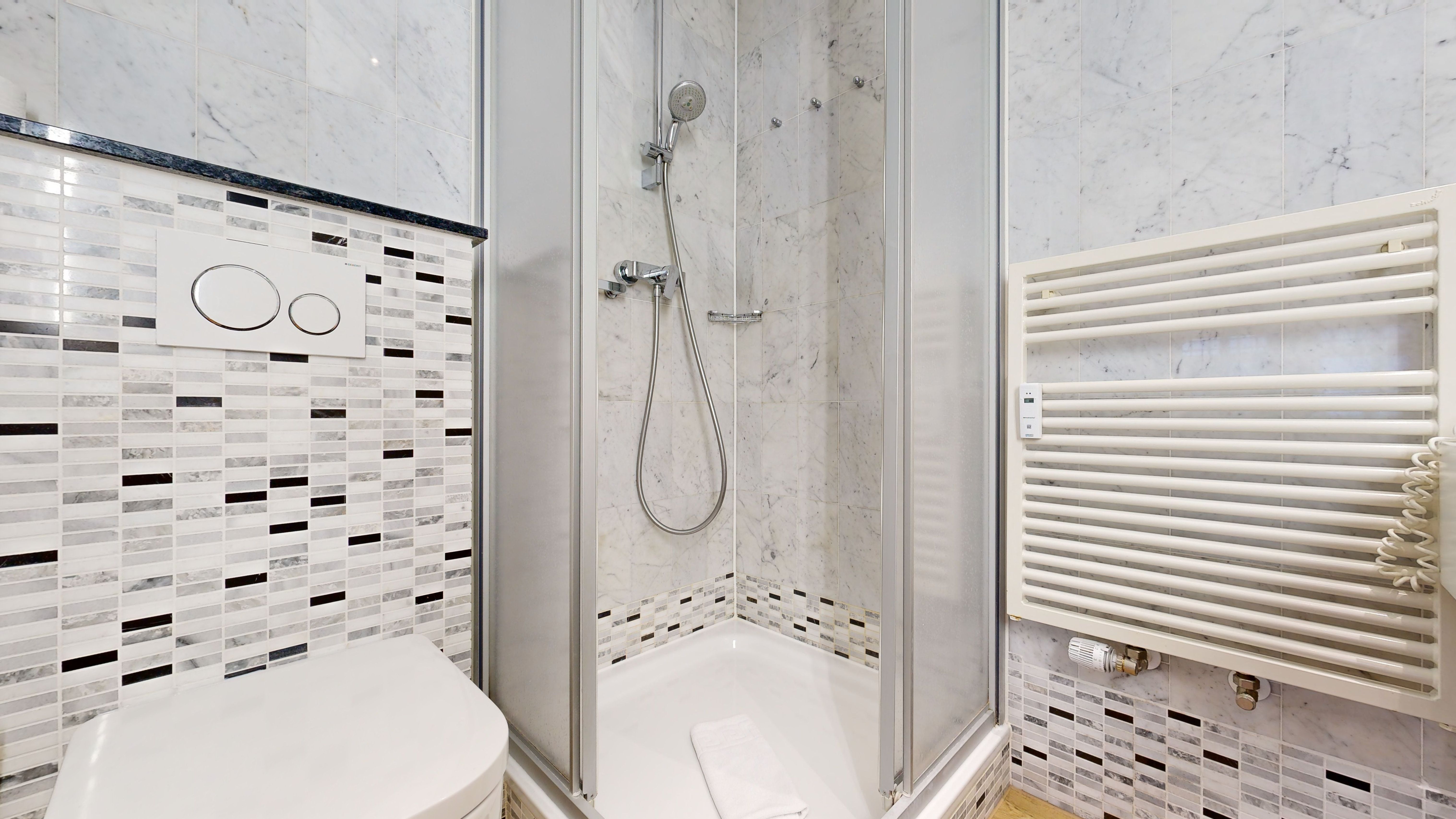 1 Badezimmer mit Dusche, WC und Föhn; Halterung für Behinderte am WC und in der Dusche.