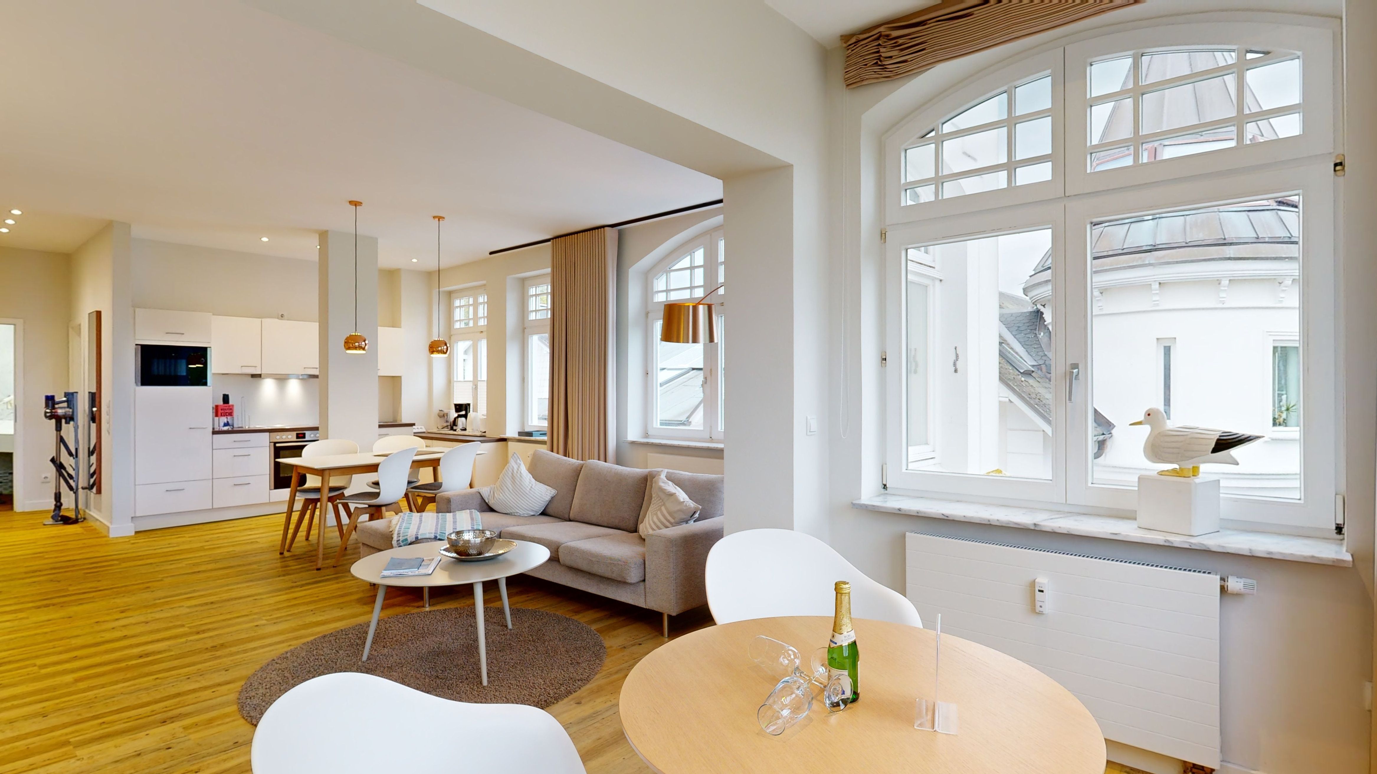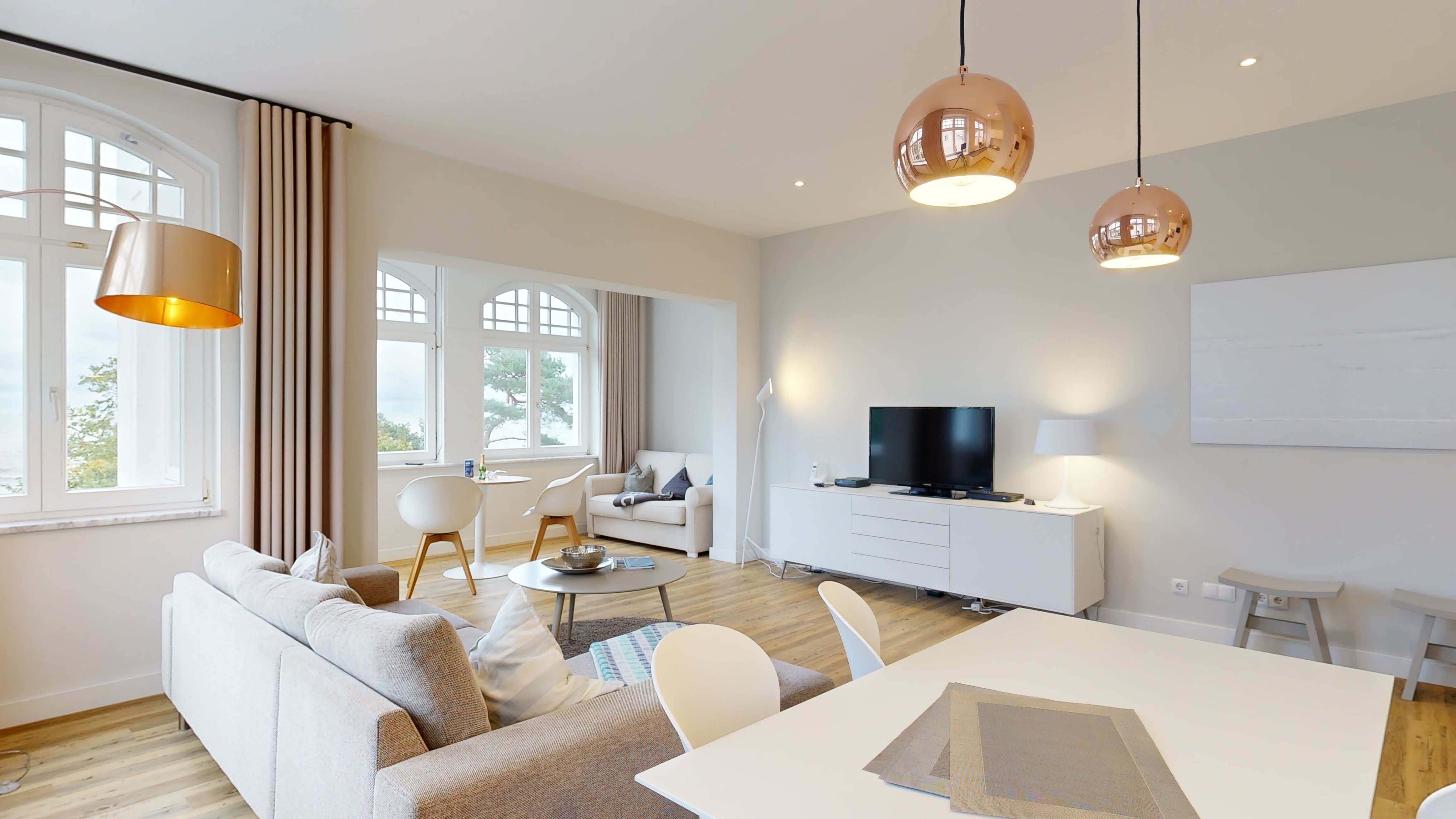 Wohnzimmer: Großes und helles Wohnzimmer mit Meerblick; gemütliche Couchgarnitur, Kabel-TV mit vollständigem Fernsehprogramm von Telekom Entertain TV inkl. aller Sportübertragungen inkl. Sky Bundesliga, Sky Sport, Sky Cinema und Sky Entertainment, WLAN-Internetanschluss und Essplatz für 4 Personen