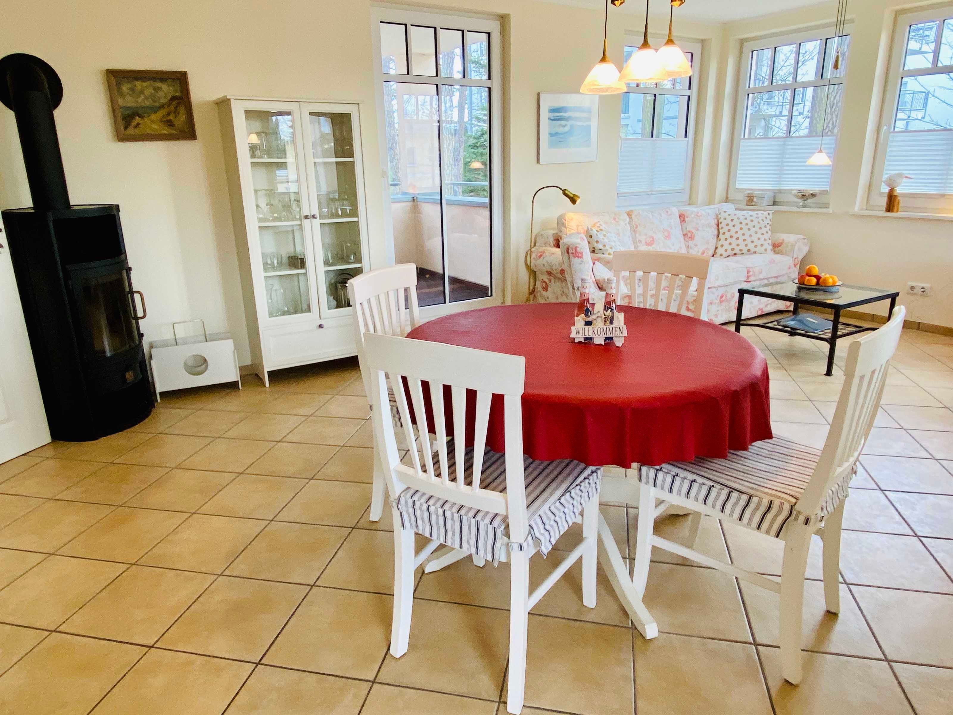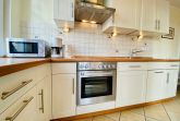 Sie hat einen großen lichtdurchfluteten Wohn-Esszimmer mit Couchecke, Esstisch und ist mit einem Kaminofen für die Gemütlichkeit ausgestattet. Die Komplettküche rundet das ganze ab.