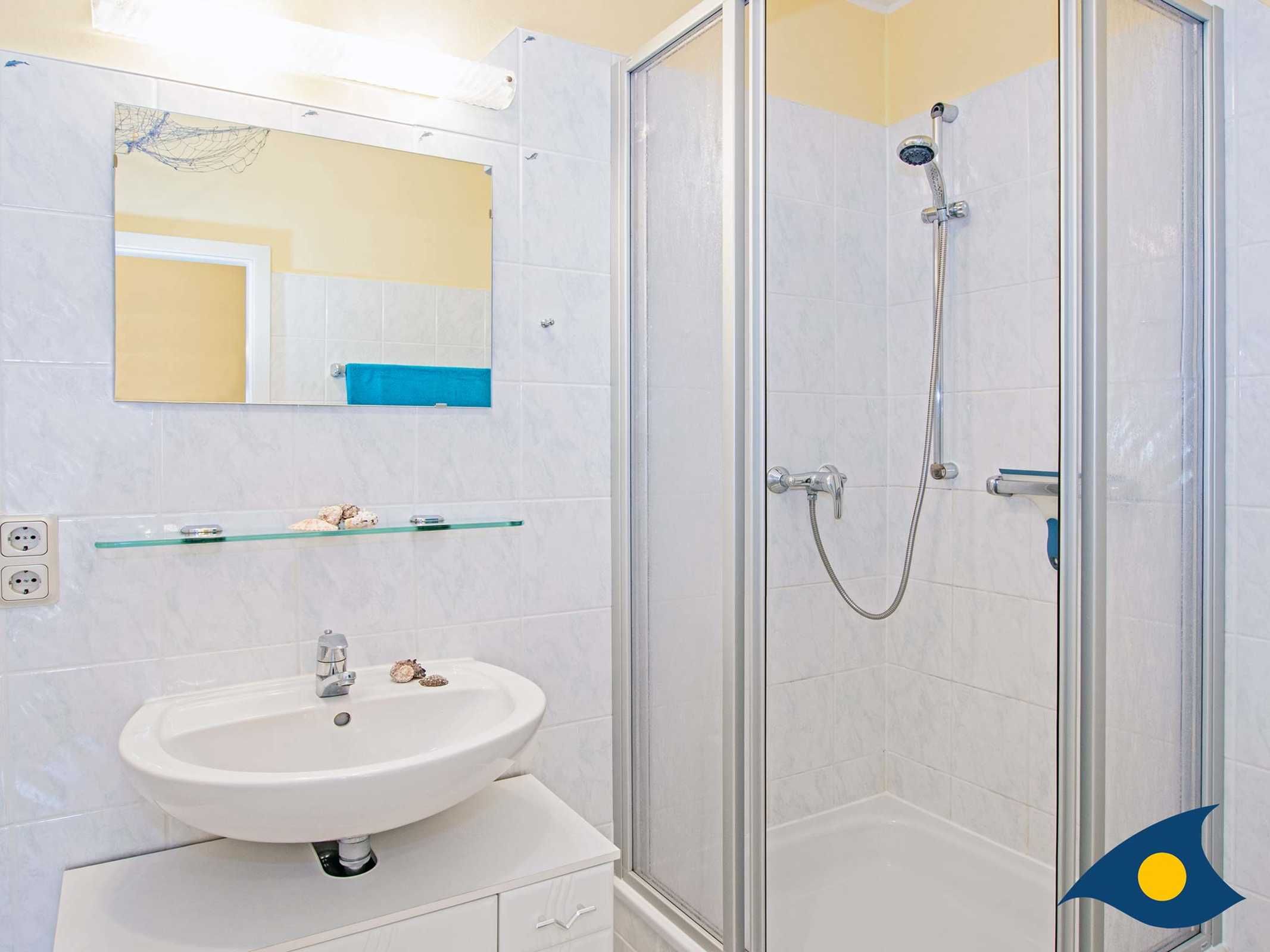 Das Badezimmer ist mit einer Dusche ausgestattet. Die vielen großen Fenster lassen viel Licht in das Appartement. Hier buchen Sie ein traumhaftes Appartement samt Platz an der Sonne.