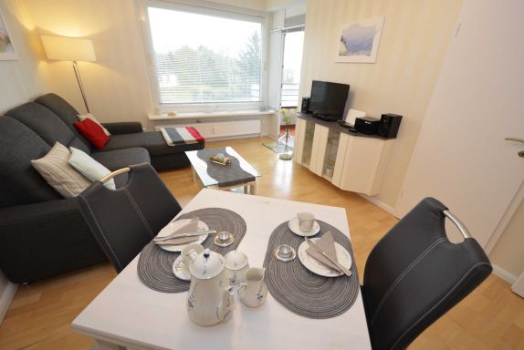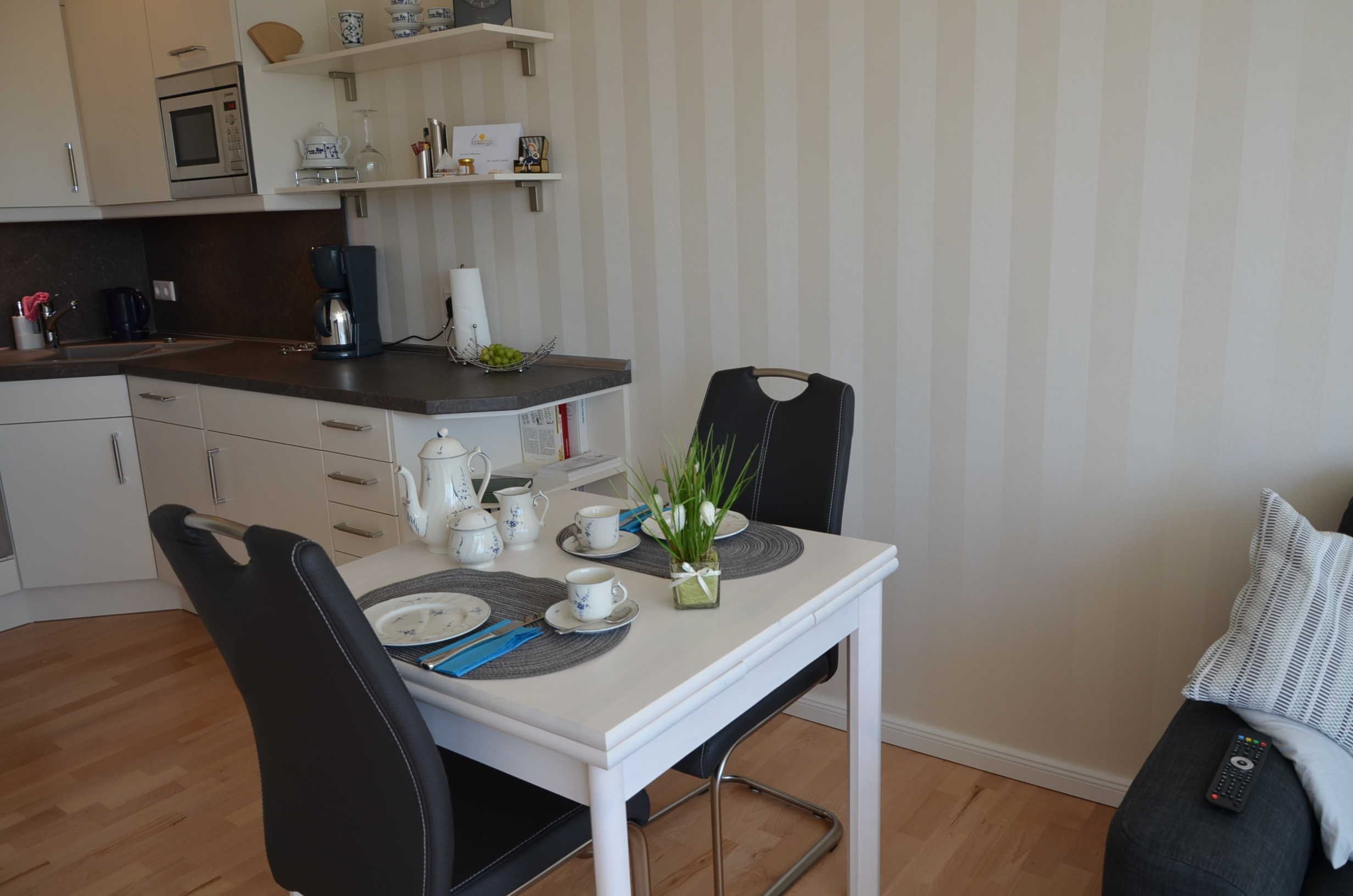 Das Appartement zur Selbstverpflegung mit seitlichem Meerblick (dafür Sonne vom Frühstück bis Nachmittagskaffee) ist ausgestattet mit: