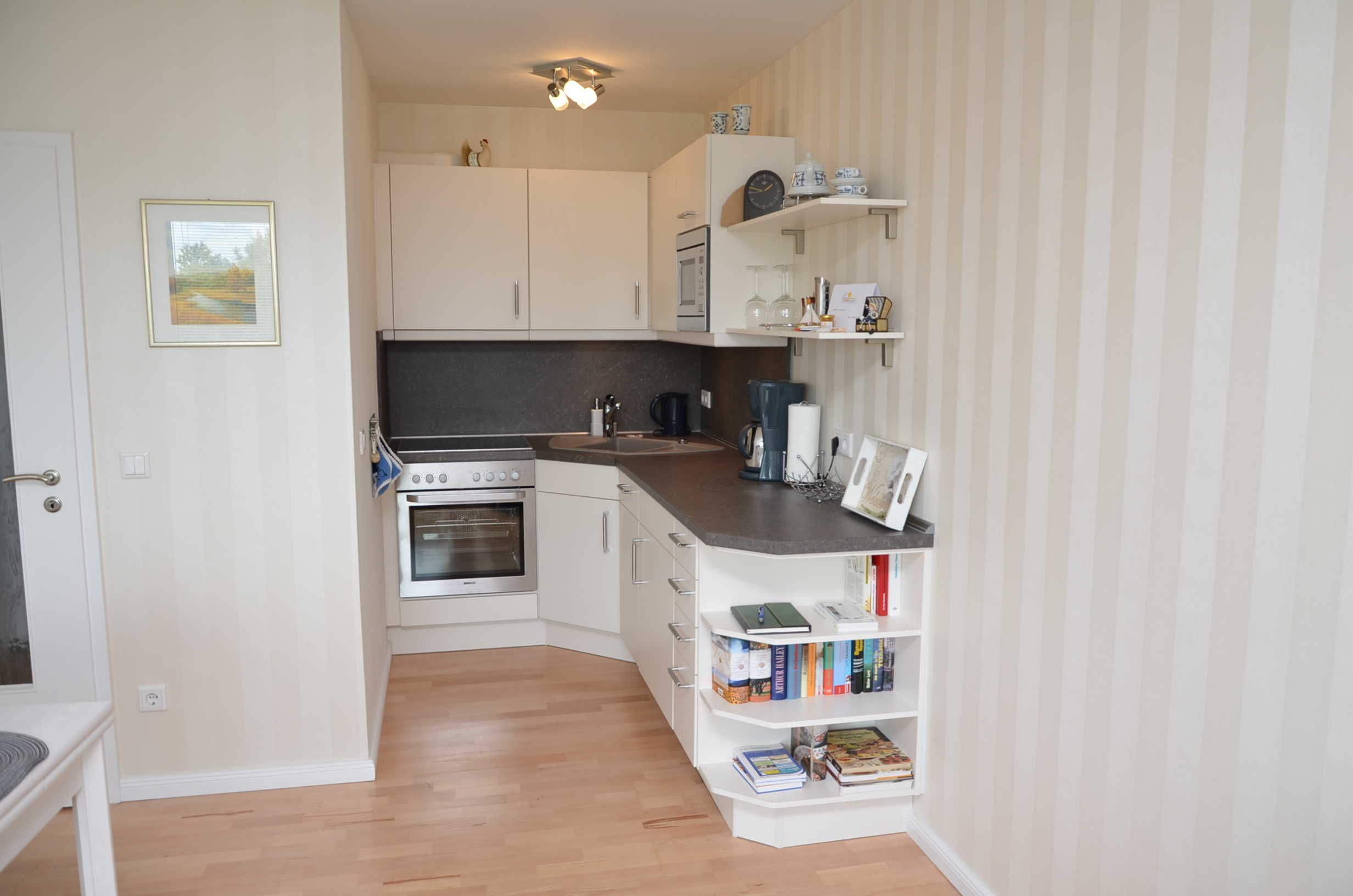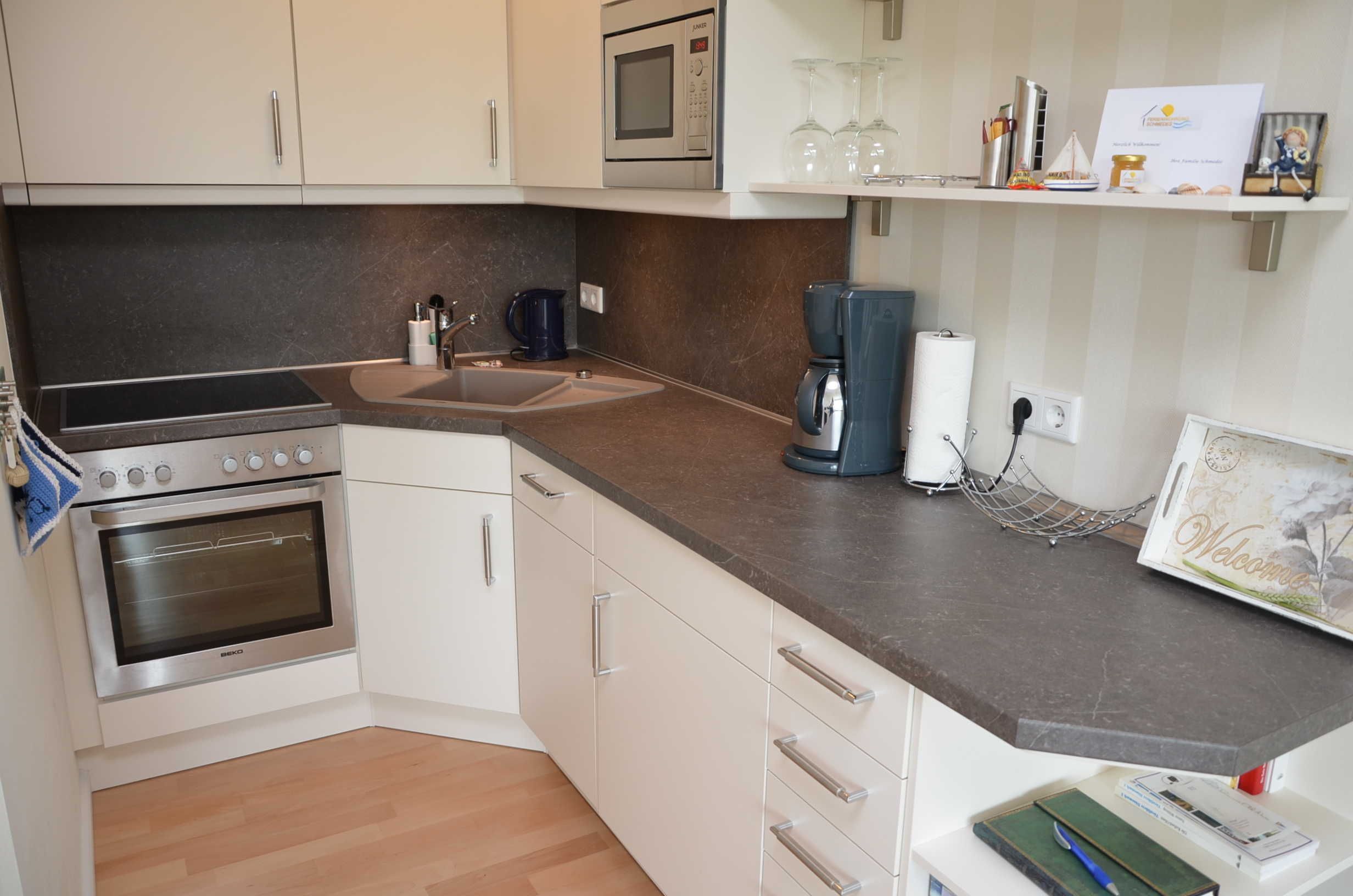 • Küche mit Kühlschrank/Gefrierfach, Ceranfeld, Backofen, Mikrowelle, Geschirrspüler, Wasserkocher, Kaffeemaschine, Toaster, hochwertigem Geschirr