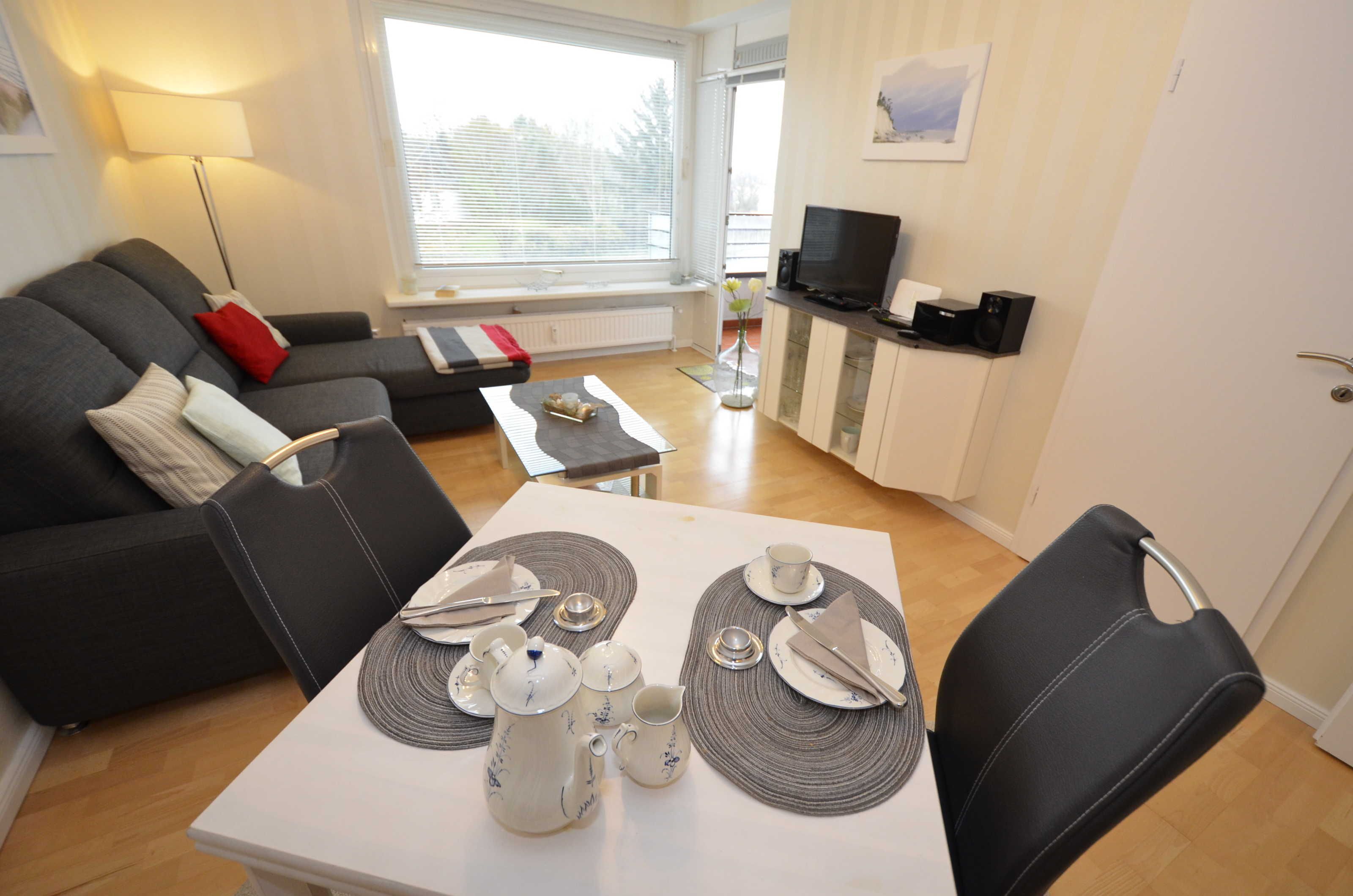 • offen gestaltetem Wohnraum mit gemütlicher Couch, Satelliten-TV, DVD, CD-Player und Radio, Tisch und Stühlen