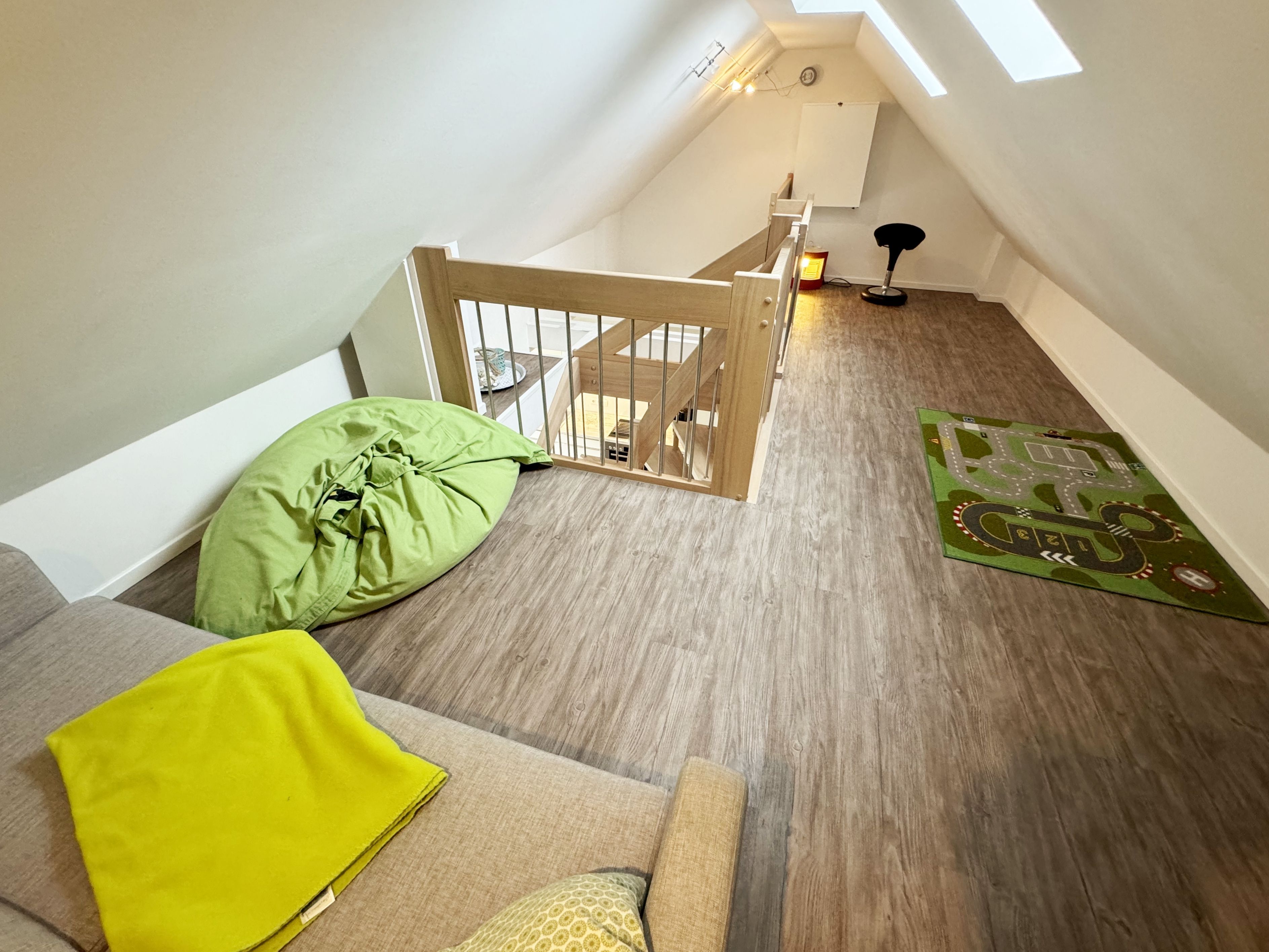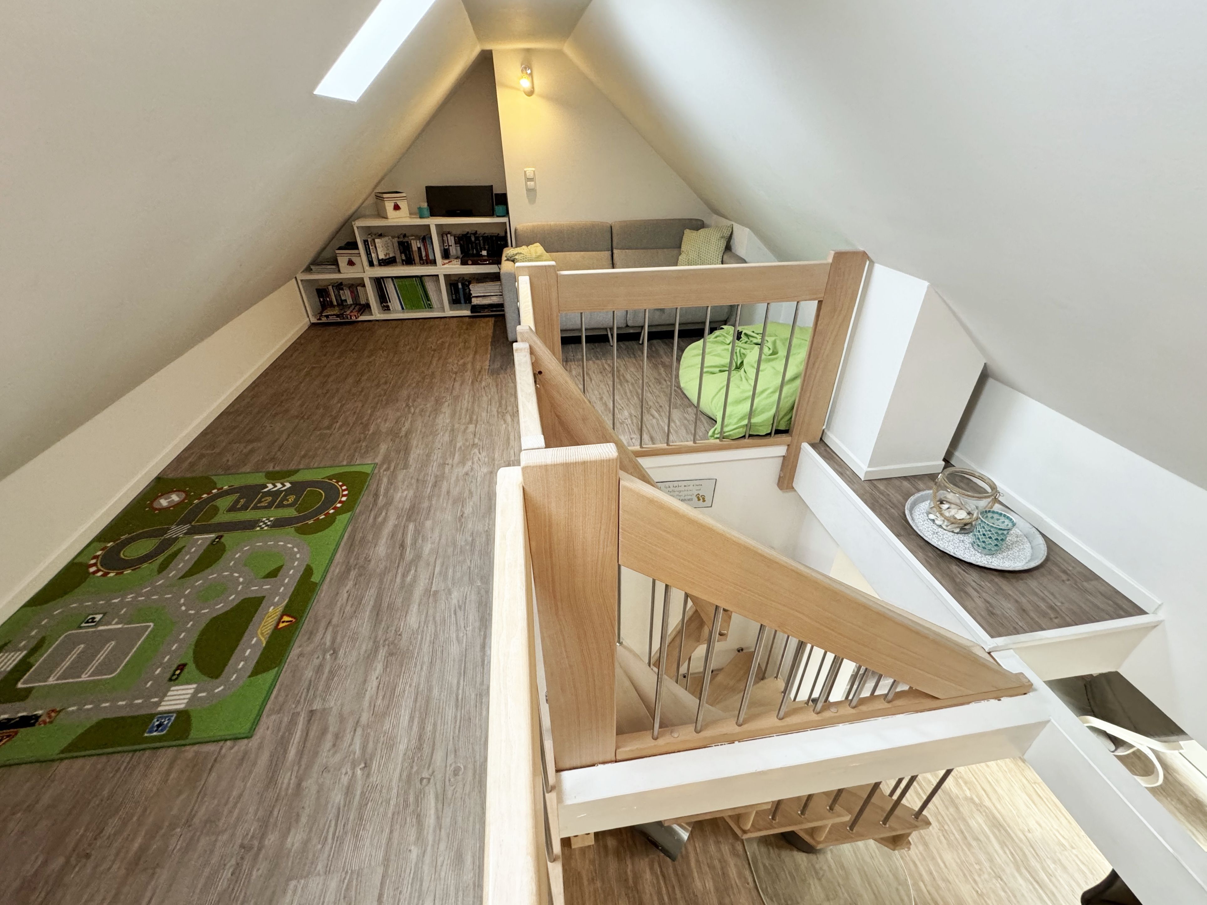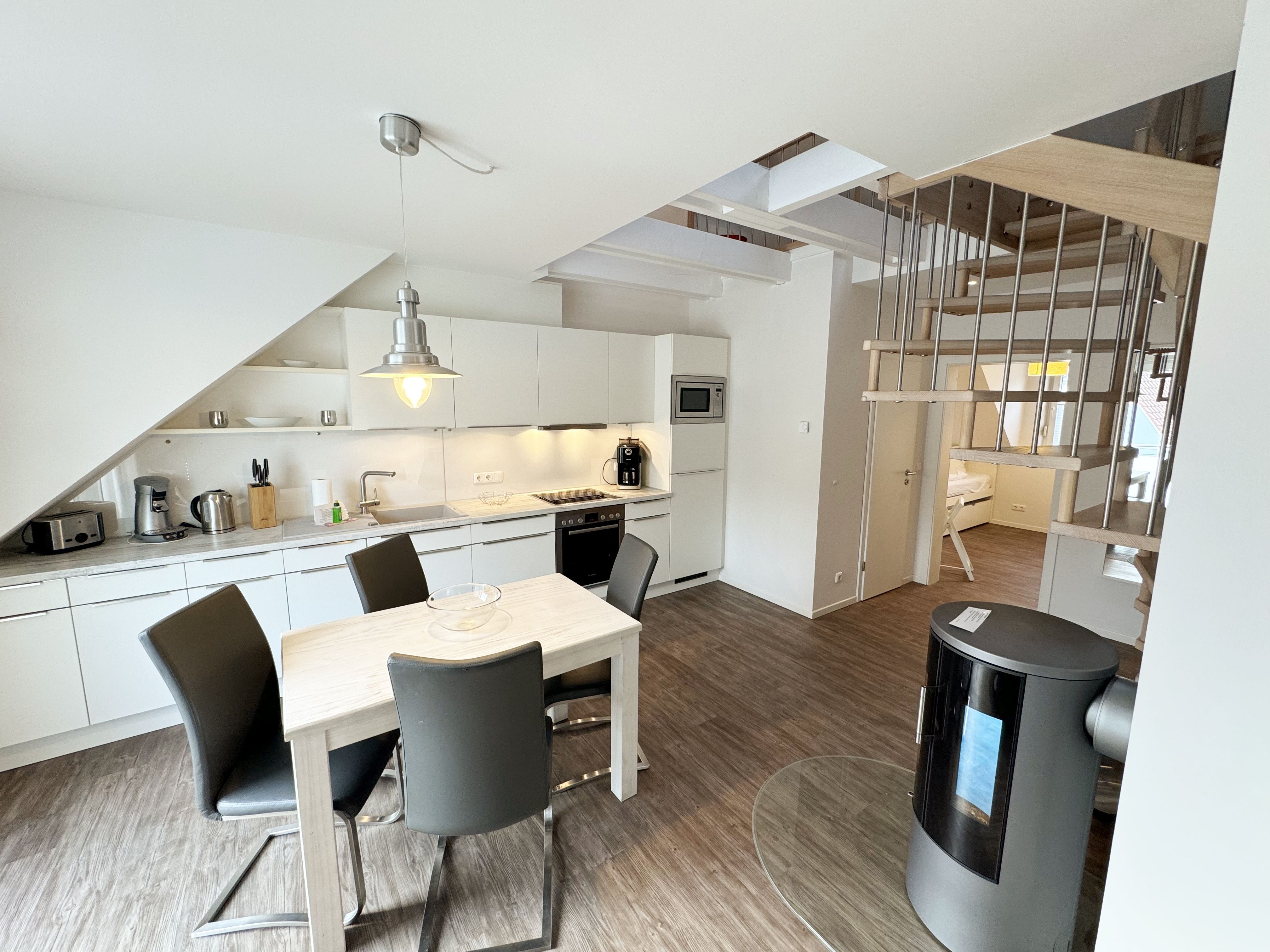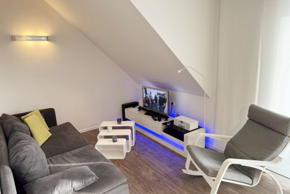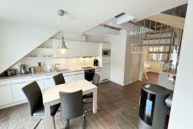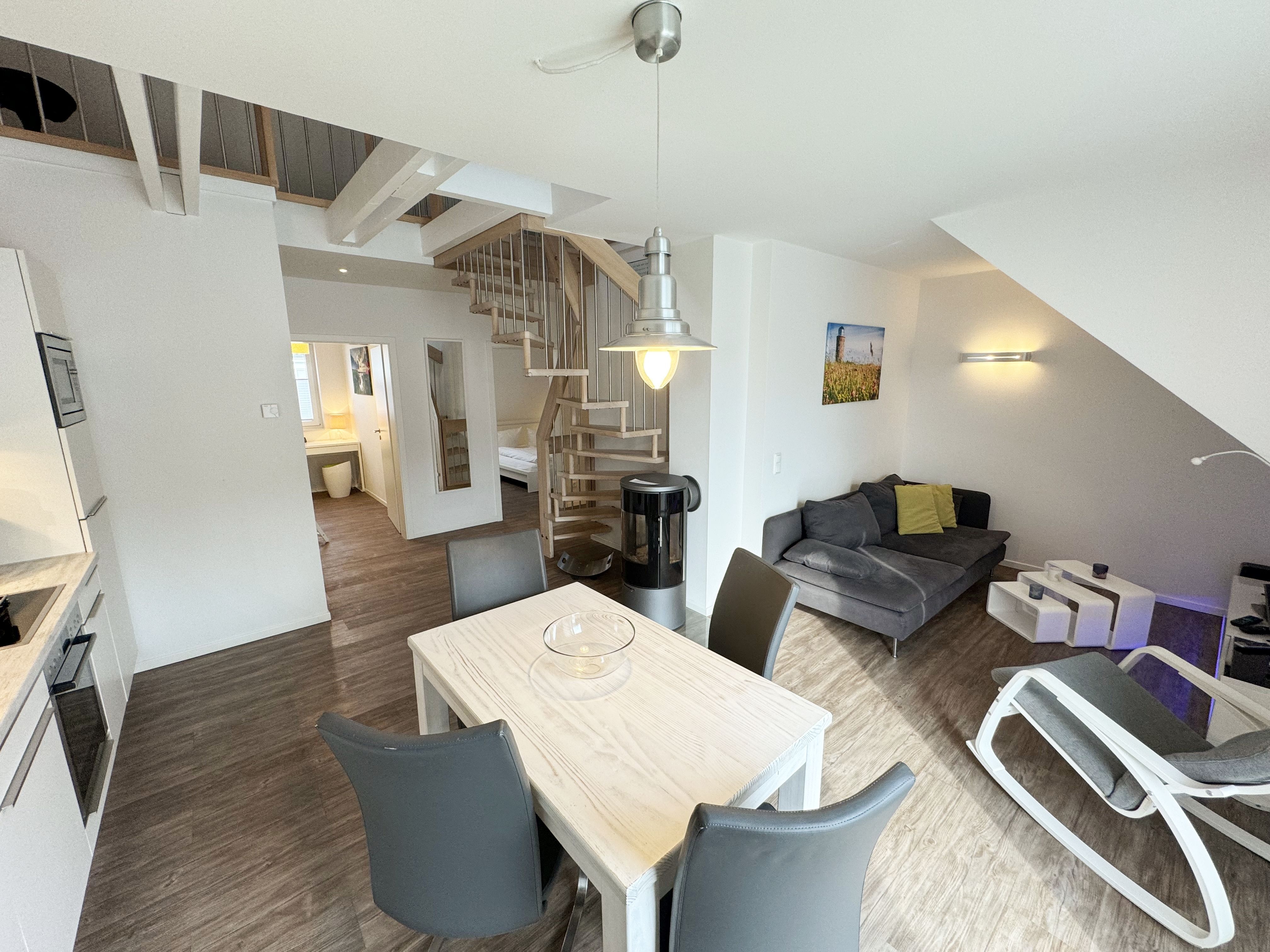 Zwei zum Garten gelegene Schlafzimmer, ein heller Wohnbereich mit Balkon in südwestlicher Ausrichtung und eine über eine Treppe erreichbare Galerie (max. Deckenhöhe ca. 1,85m) verteilen sich auf einer großzügigen Grundfläche von über 75 m² (die Wohnfläche beträgt nach anteiligem Abzug des Balkons, der Galerie und der Dachschrägen ca. 62 m²). 2-4 Personen finden hier komfortable Betten (ein Doppelbett mit einer durchgehenden Matratze von 2,00m x1,60m und ein Kojenbett mit 2 separaten Liegeflächen von jeweils 2,00m x 0,90m) sowie geräumige Kleiderschränke. Das kleinere Schlafzimmer verfügt über einen Safe im Kleiderschrank. Der Wohnbereich wird durch eine Couch, einen Kaminofen, einen Smart-TV, Blu-ray-Player u.a. mit CD- und Radiofunktion und Gesellschaftsspiele abgerundet. Ein Internetanschluss W-Lan sowie die Nutzung vom Festnetztelefon (inländische Gespräche) stehen Ihnen kostenfrei zur Verfügung. Eine umfangreiche ausgestattete und hochwertige Einbauküche mit Markengeräten wie ein Geschirrspüler, Induktionsfeld mit Backofen, Kühlschrank mit Gefrierfach und Mikrowelle lassen keine Wünsche offen. Kleine Küchenhelfer wie Kaffeemaschine, Toaster, Wasserkocher etc. sind ebenfalls vorhanden. Wenn die Galerie nicht schon von Ihren Kindern als Spielreich in Beschlag genommen ist, können Sie sich hier nach einem erlebnisreichen Tag zum entspannten Lesen zurückziehen. Auch ein Klappschreibtisch zum Schreiben für die Urlaubspost an die Daheimgebliebenen befindet sich auf der Galerie. Für unsere kleinen Gäste haben wir die Treppe kindersicher gestaltet und bieten 1x Hochstuhl sowie 1x Reisebett (ohne Matratze und Bett Inlett) inklusive zur Nutzung an. Das moderne Bad mit Lüftung wurde mit einer bodengleicher Regendusche, WC, Handtuchtrocknerheizung, Waschmaschine, Fön und Waschtisch versehen. Alle Räumlichkeiten werden durch eine Fußbodenheizung erwärmt. Zur Wohnung gehört ein PKW -Stellplatz Nr. 07 und ein abschließbarer Schuppen zur sicheren Unterbringung Ihrer Fahrräder und Surfbretter. Wir bitten um Verständnis dafür, dass das Rauchen und der Aufenthalt von Haustieren in dieser Ferienwohnung mit Rücksicht auf die Belange anderer Gäste nicht gestattet sind. Die Erstausstattung von Bettwäsche ist pro Person inklusive. Handtücher (1 Duschhandtuch, 2 kleine Händehandtücher sowie einmalig 1 Duschvorleger und 1 Geschirrhandtuch) sind entweder selbst mitzubringen oder Sie buchen Sie bis 14 Tage vor Ihrer Anreise gegen einen Aufpreis dazu.