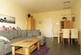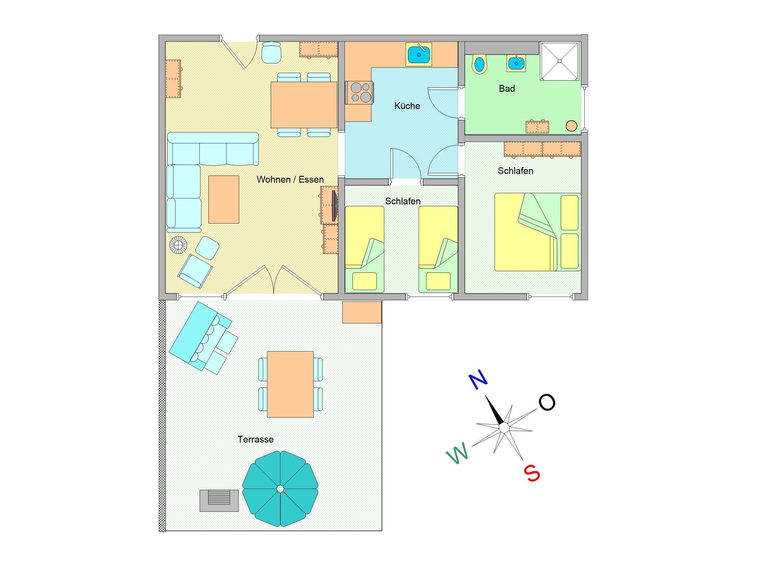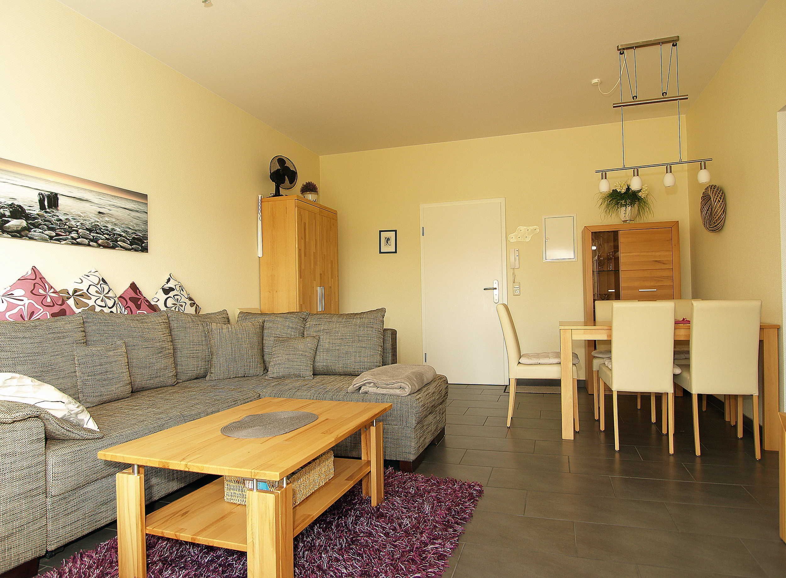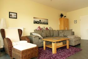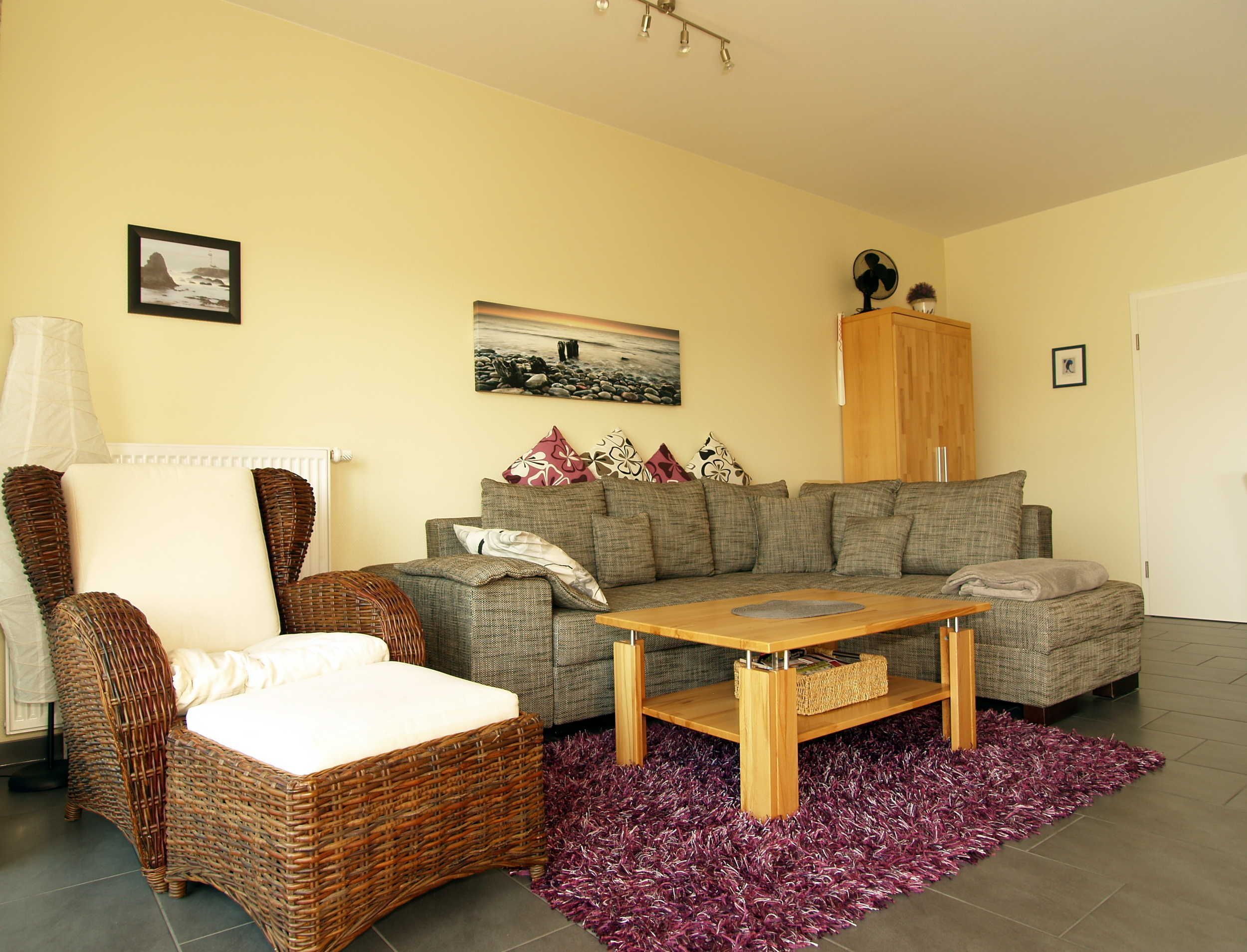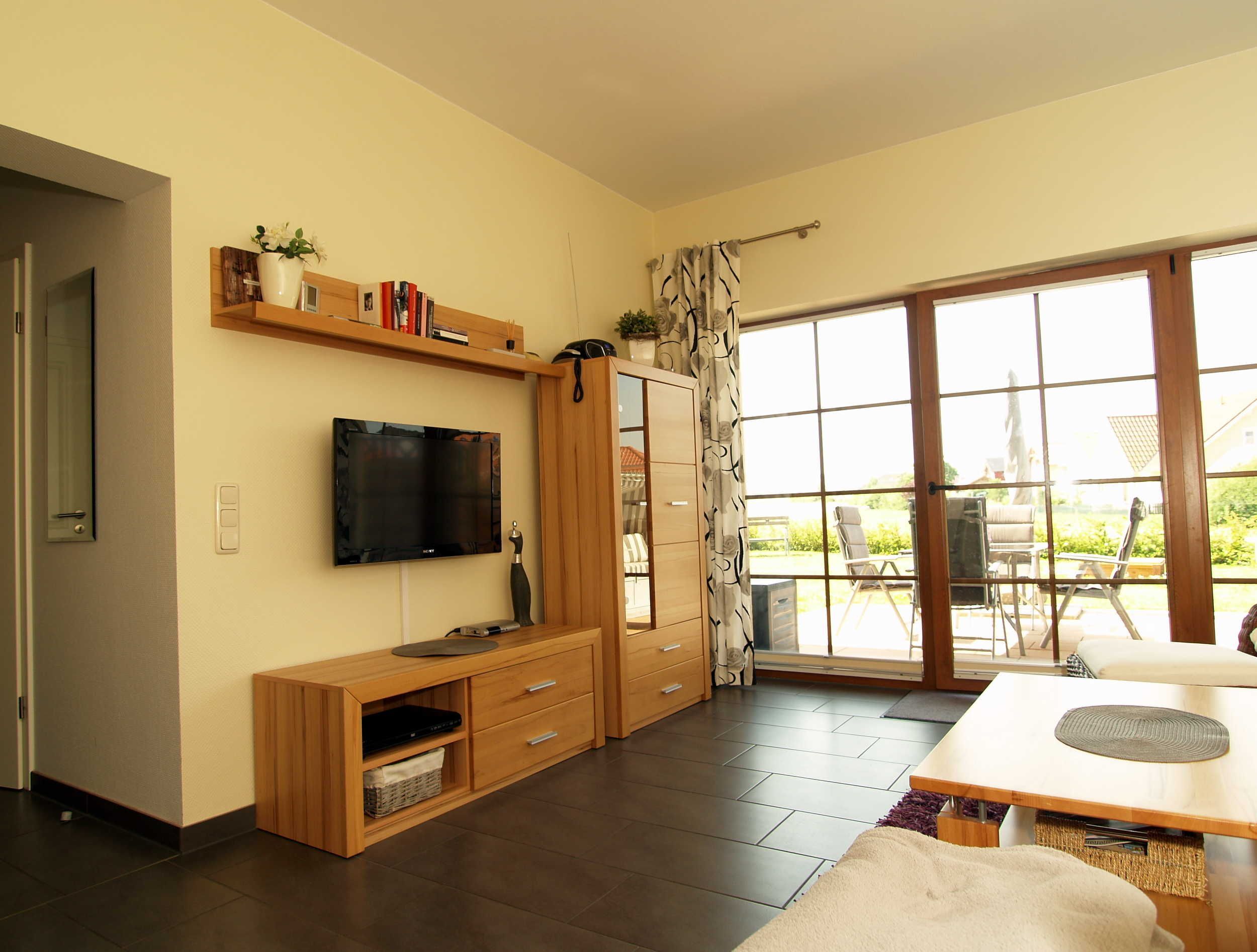 Sie wohnen in einer ca. 58 m² grossen 3-Raum-Wohnung, die sich im EG befindet. Der Wohnraum ist ausgestattet mit Couch, Flat-TV, Esstisch mit 4 Stühlen, die Küche mit Herd (Ceran u. Backofen), Geschirrspüler und Kühlschrank. Ein Schlafraum mit Doppelbett, ein Schlafraum mit zwei Einzelbetten sowie das Bad mit Dusche und WC vervollständigen das Gesamtbild dieser Wohnung. Die große möblierte Südterrasse mit Strandkorb, Sitzgarnitur und Grill sowie einer anschließenden Rasenfläche erreichen Sie über das Wohnzimmer.