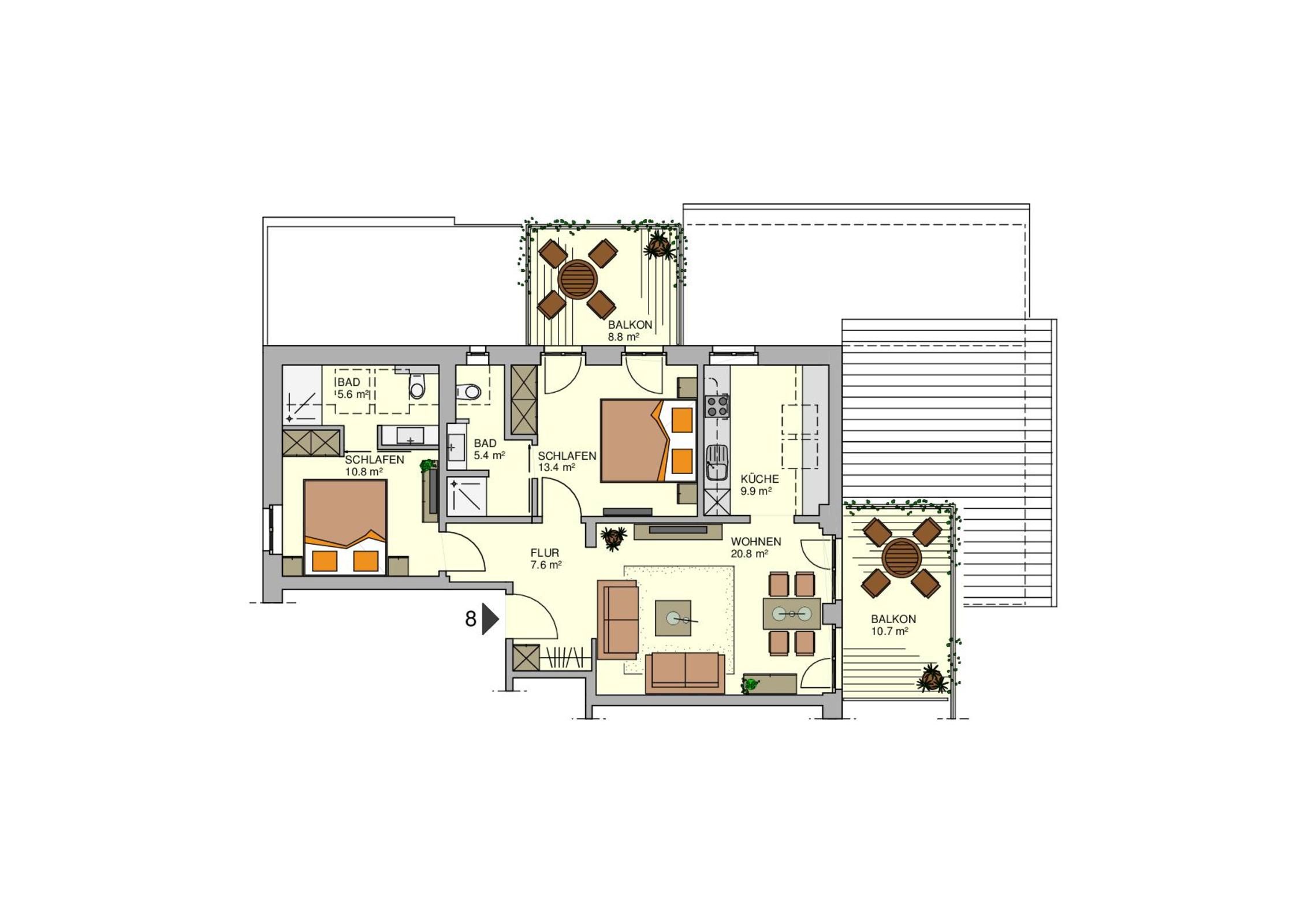 Bei der Ferienwohnung 08 handelt es sich um eine 3-Raum-Ferienwohnung, bestehend aus einem großzügigen Wohn-/Essbereich mit offen gestalteter Küche, zwei Schlafzimmern mit Doppelbett und je einem Duschbad.
