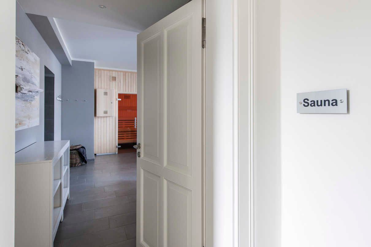 Zum Relaxen lädt der hochwertige Sauna- und Wellnessbereich ein, der sich im neuen Anbau der Villa befindet. Nach dem Saunagang können Sie sich im großzügigen Ruheraum erholen.