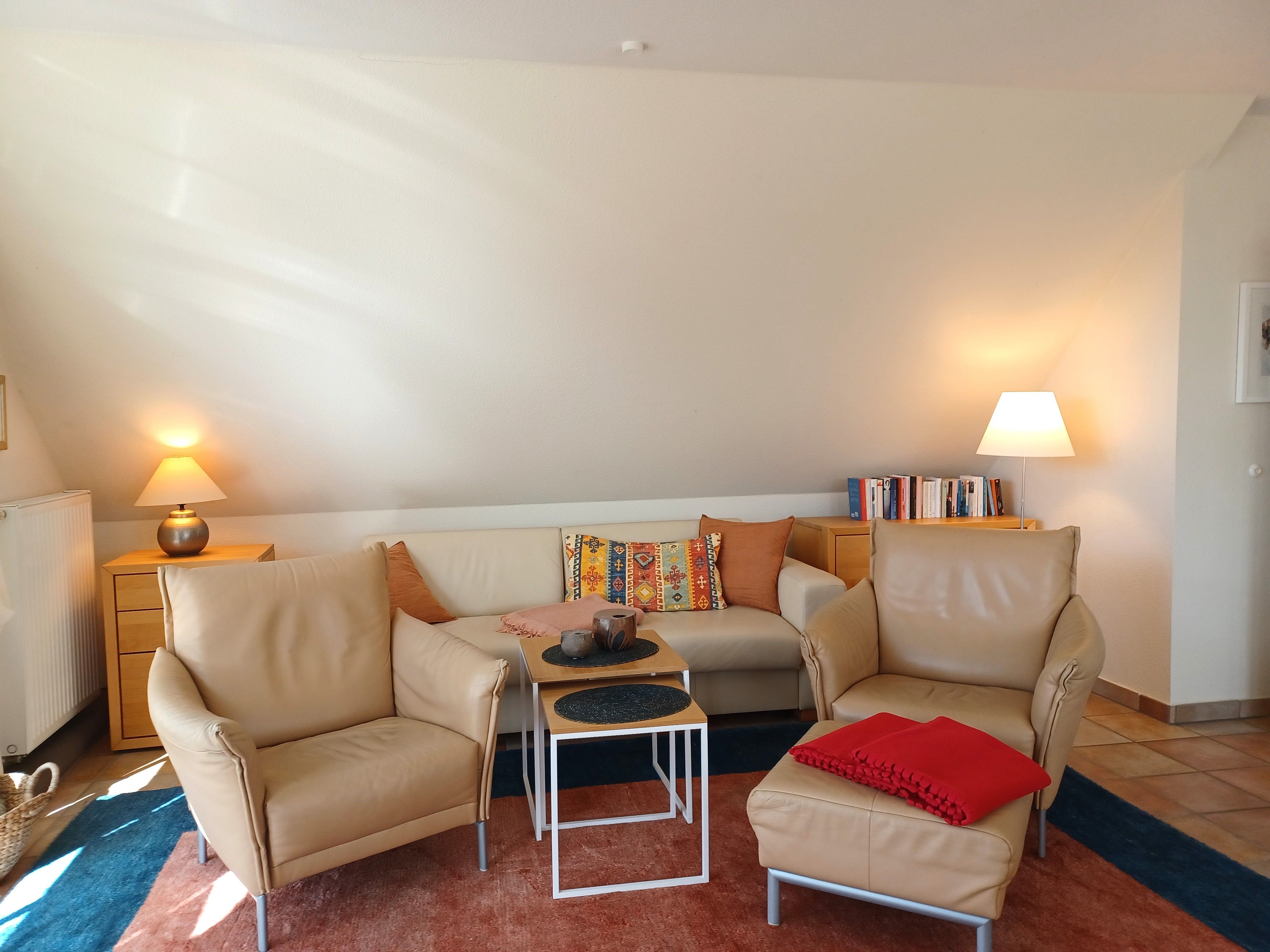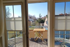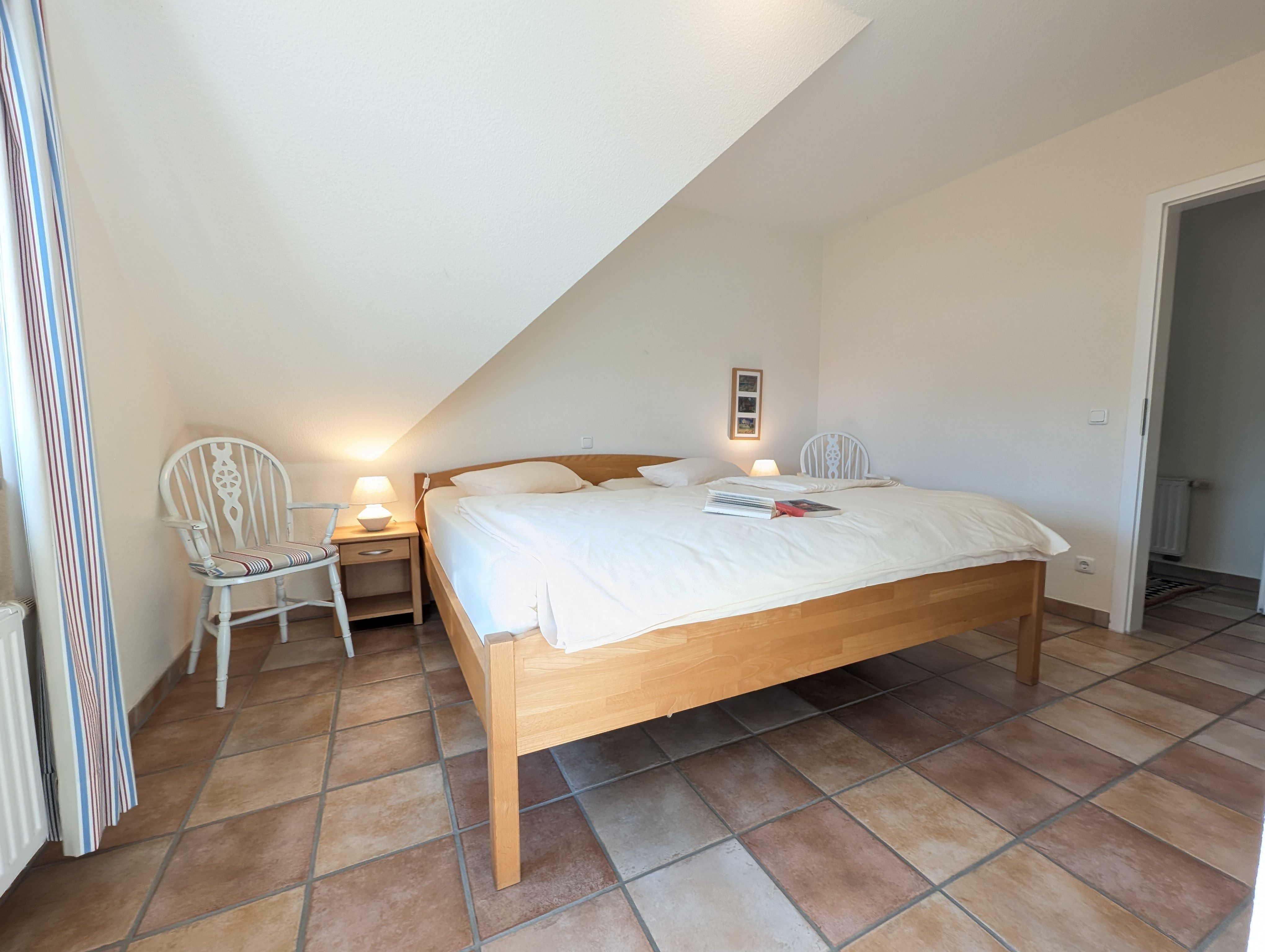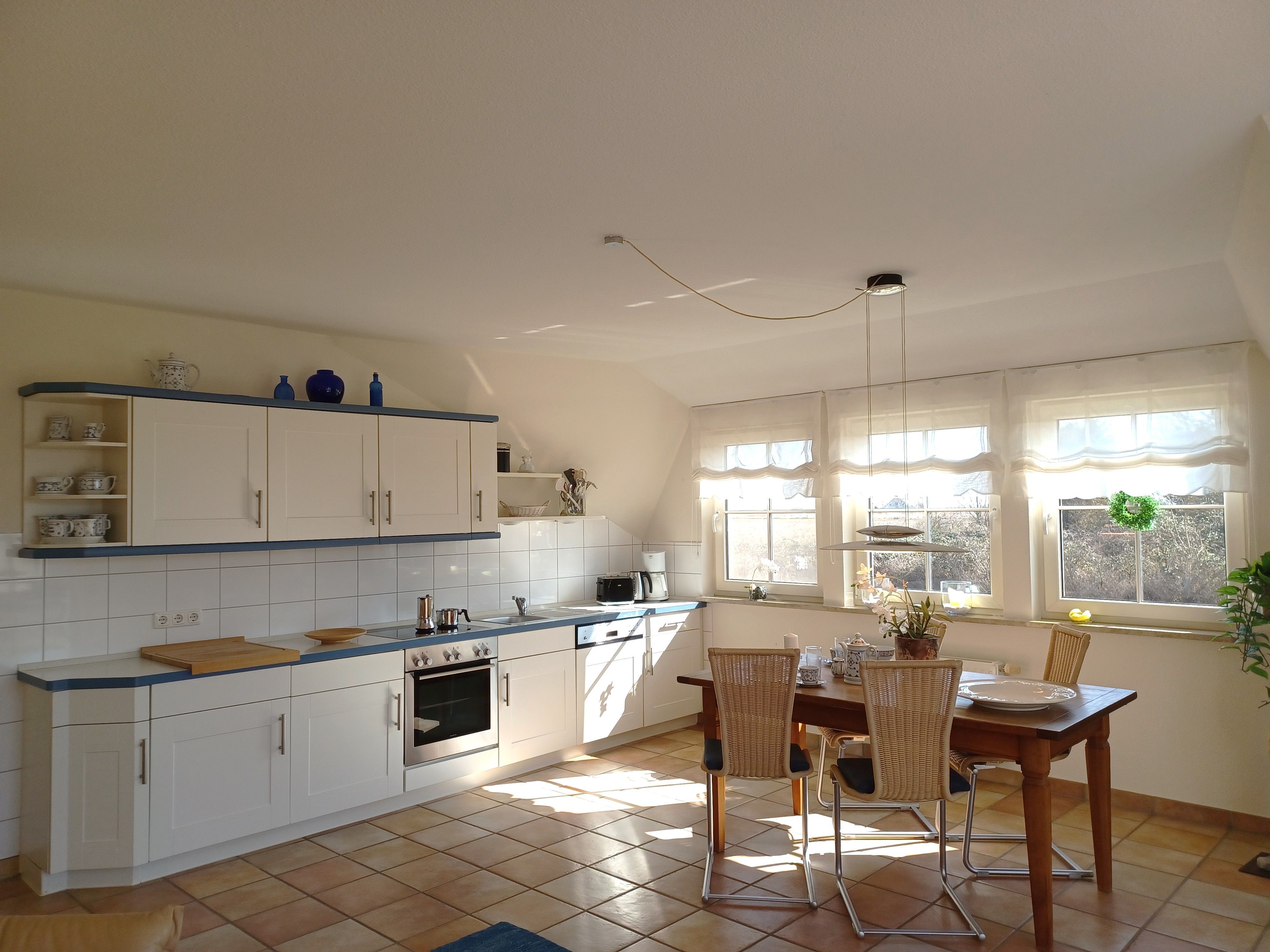 in der Wunderschönen, lichtdurchfluteten Vollkomfortwohnung im Obergeschoss mit Balkon (Süd- West- Ausrichtung) und Boddenblick. Die Ferienwohnung liegt in sehr ruhiger Lage am Ortsrand. Der großzügige Wohnraum ist mit viel Liebe zum Detail ausgestattet worden. Die offene Küchenzeile verfügt über einen Essbereich, einen Geschirrspüler, Cerankochfeld, Backofen, Kaffeemaschine, Toaster und einer weiteren umfangreichen Ausstattung. Im Bad finden Sie eine Dusche und eine Waschmaschine. Das Schlafzimmer wurde mit einem Doppelbett 2,00 x 2,00 m ( getrennte Matratzen ) und einem Kleiderschrank mit viel Stauraum ausgestattet. Der Strand liegt in ca. 10 min. Entfernung.. Für unsere Gäste steht auf dem Grundstück ein abschließbarer Fahrradschuppen zur Verfügung. Die Wohnung wird inclusive Bettwäsche übergeben, Handtücher können Sie in der Zimmervermittlung für 7,00 € pro Person (1 Badetuch, 1 Handtuch) zubuchen. Der Parkplatz befindet sich direkt am Grundstück.