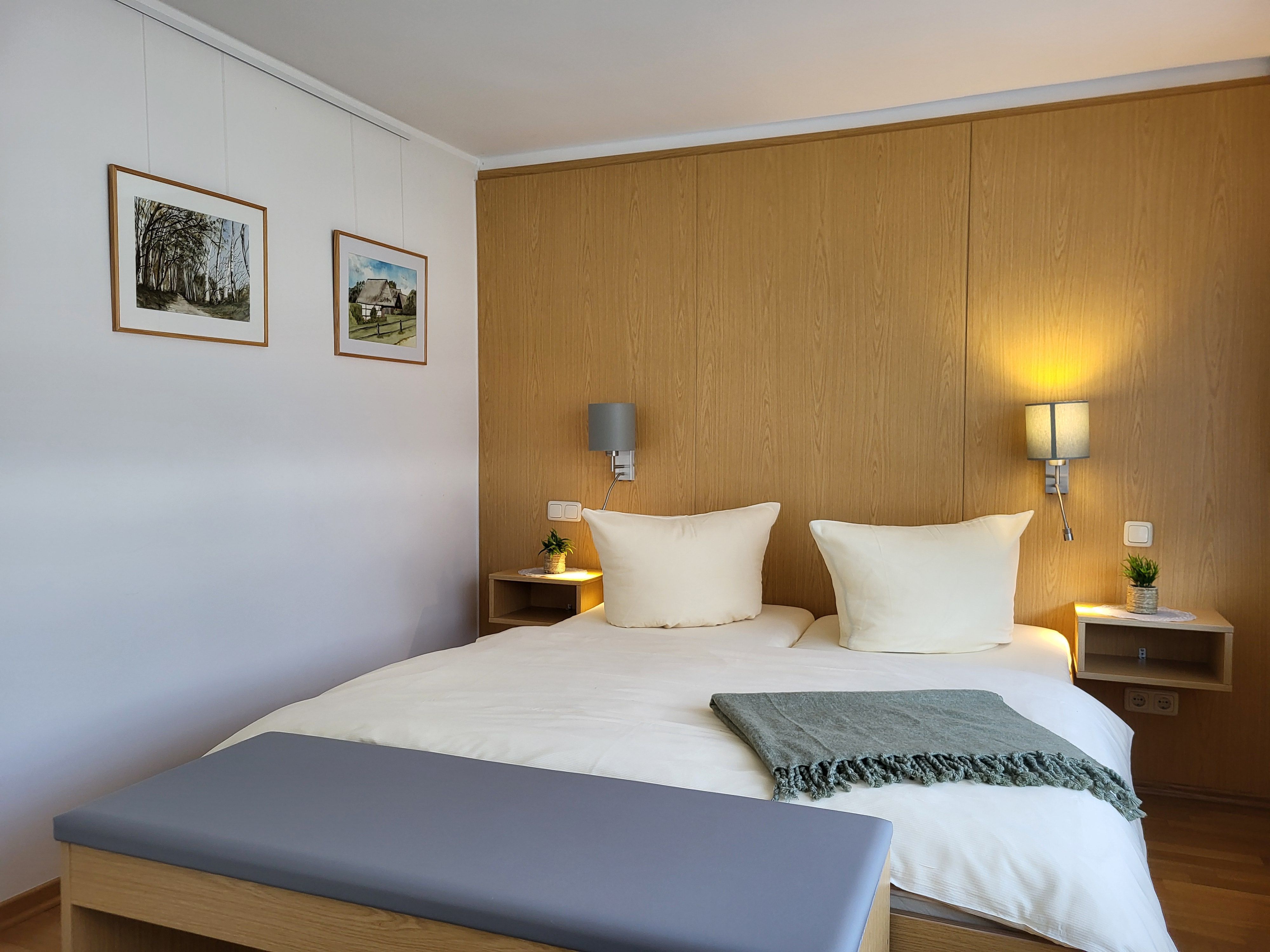 Das Schlafzimmer verfügt über ein Doppelbett 1,60 x 2,00 m (getrennte Matratzen). Die Bettwäsche ist inclusive, Handtücher können in der Zimmervermittlung für 7,00 € pro Person (1 Badetuch, 1 Handtuch) dazugebucht werden.Das Bad verfügt über eine ebenerdige Dusche.
