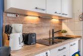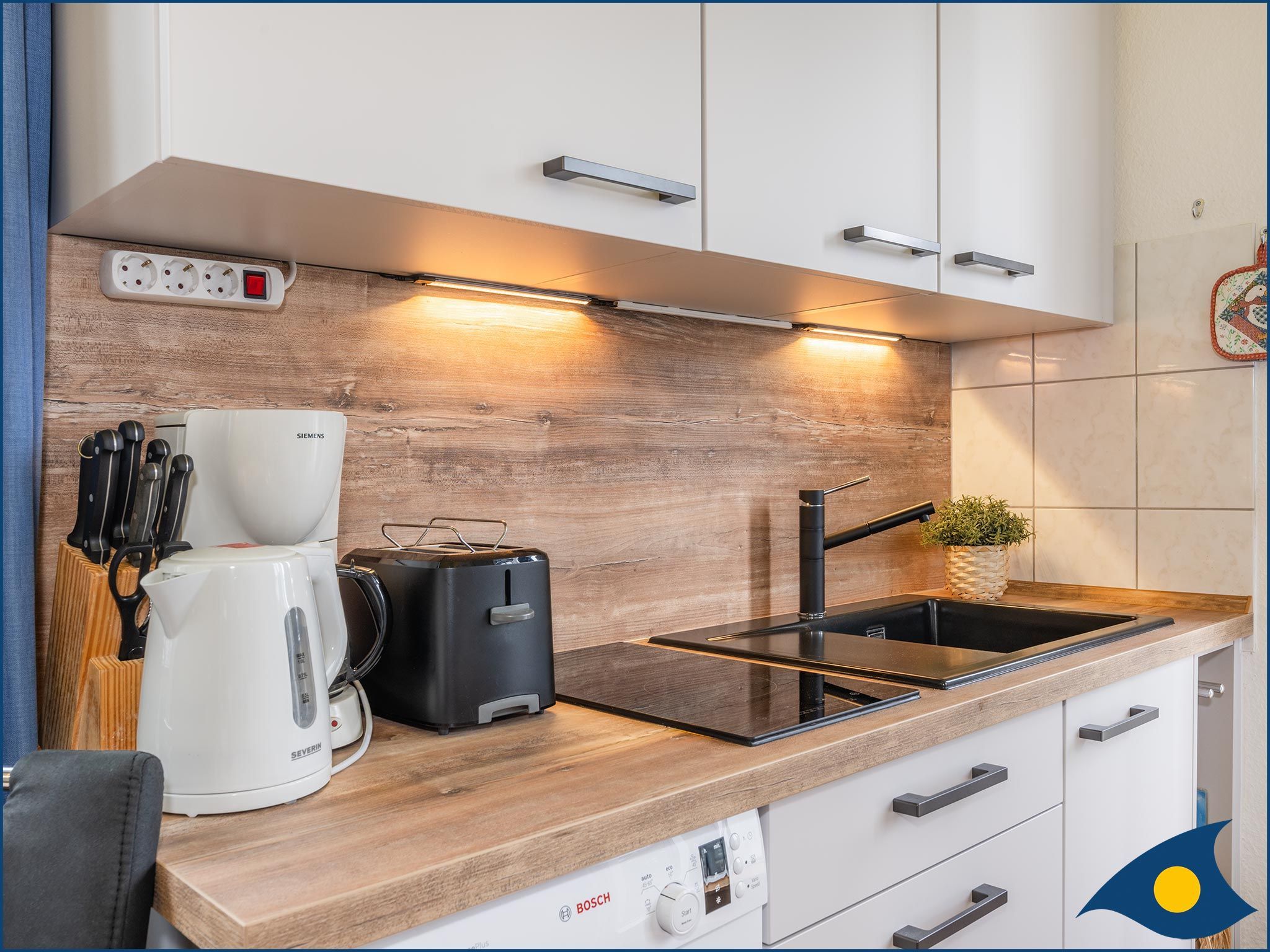 Die Küchenzeile lädt zum gemeinsamen Kochen ein und ist mit einem Induktionskochfeld, Mini-Backofen, Spüle, Gefrierkombination, Geschirrspüler, Kaffeemaschine, Toaster und Wasserkocher ausgestattet.