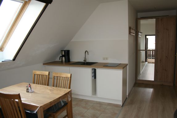 nicht für kleine Kinder geeignet. In der offenen Küchenzeile finden Sie einen Essbereich, und eine gute Küchenausstattung mit Kühlschrank und 2- Platten Herd. Das Bad wurde mit einer Fußbodenheizung und Dusche ausgestattet. das Appartement verfügt über einen WLAN- Anschluss.Die Bettwäsche und Handtücher sind inclusive,
