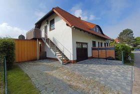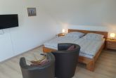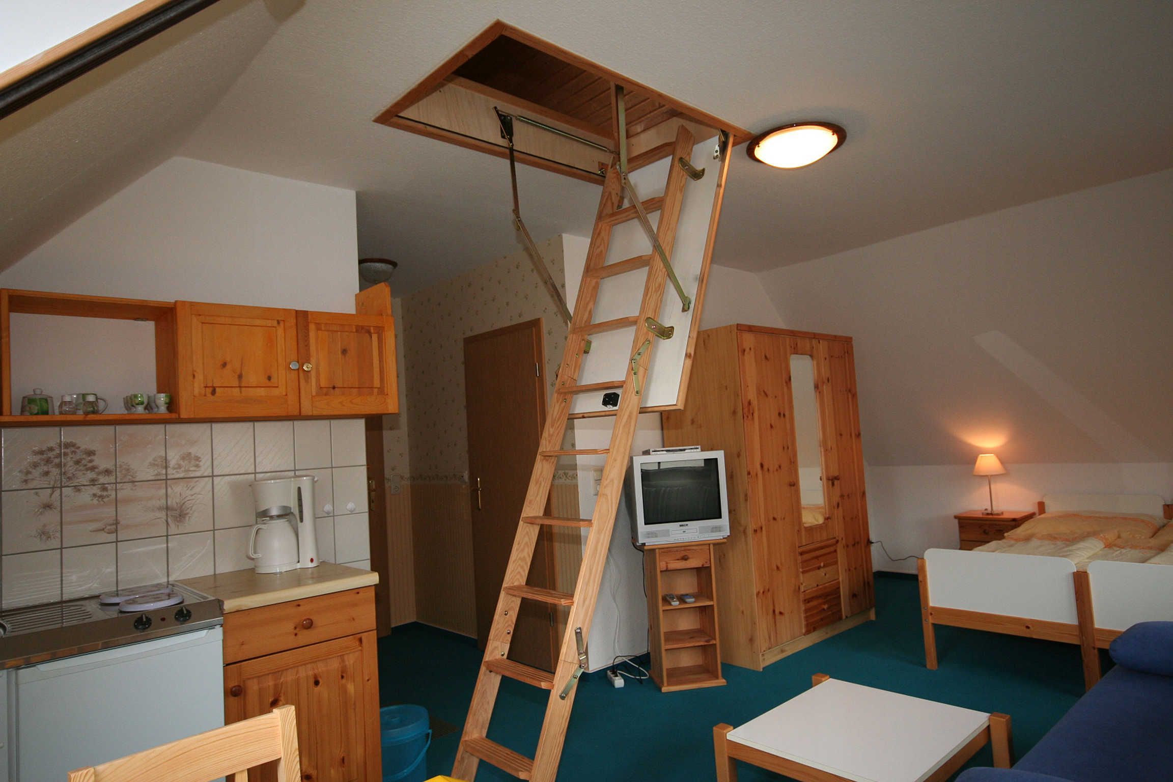 schönes Appartement in der 1. Etage für 2 Personen mit separatem Eingang über die Außentreppe erreichbar. Hier befindet sich auch der kleine Balkon Westausrichtung mit einer Sitzgelegenheit. Das Wohn- Schlafzimmer ist ausgestattet mit einem Doppelbett 1,80 x 2,00 m (getrennte Matratze). 2 Aufbettungen im Schlafboden/ Dachgeschoss (genannt Nest - 6 qm) sind möglich, erreichbar mittels einer Klappleiter, daher