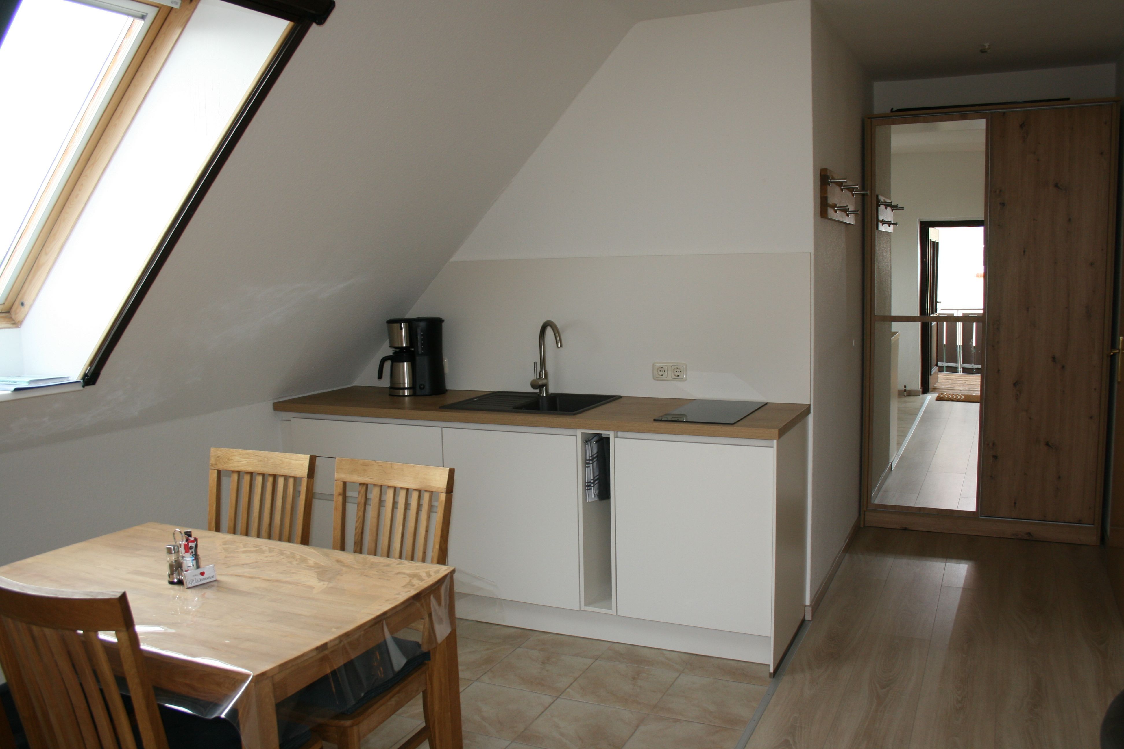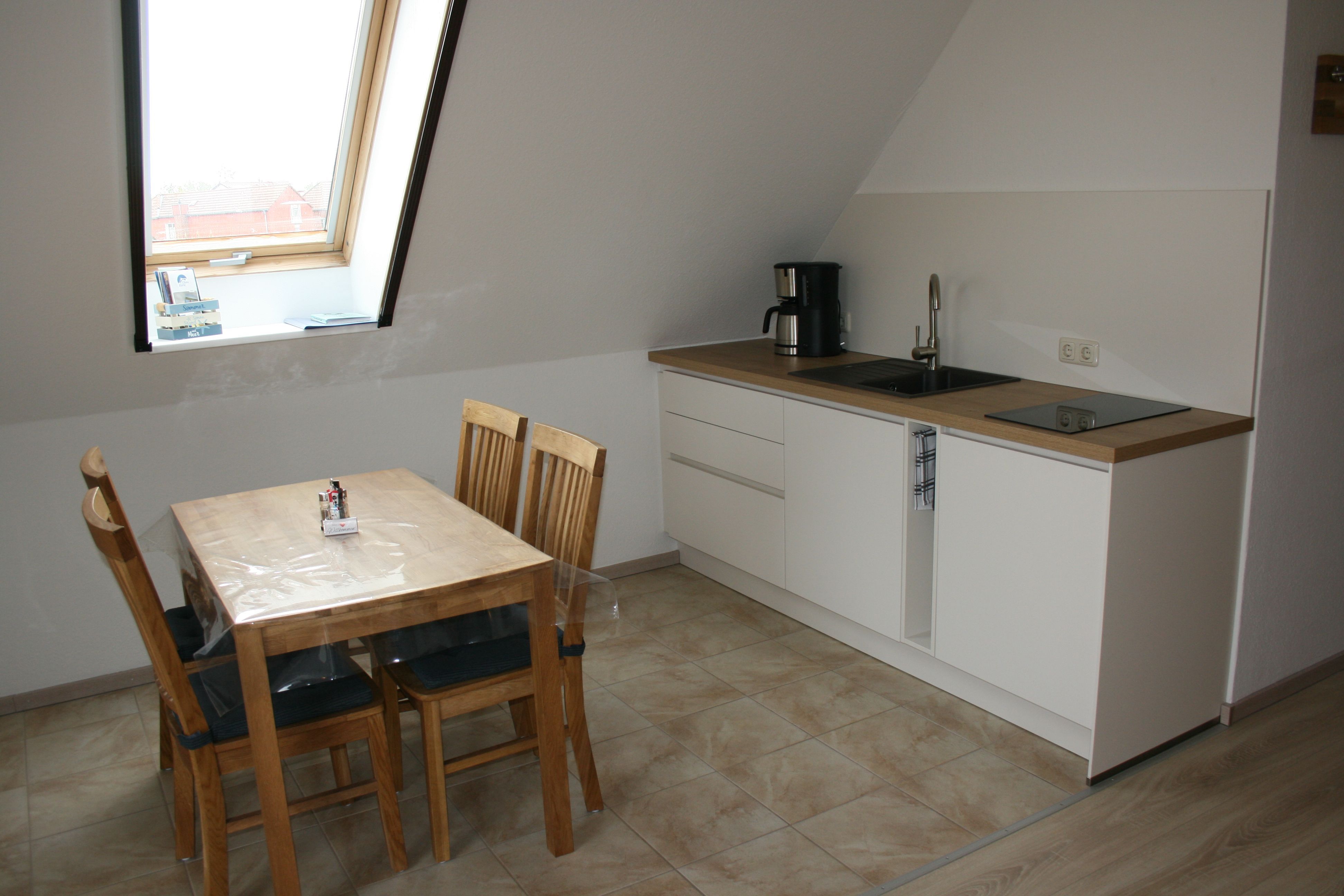nicht für kleine Kinder geeignet. In der offenen Küchenzeile finden Sie einen Essbereich, und eine gute Küchenausstattung mit Kühlschrank und 2- Platten Herd. Das Bad wurde mit einer Fußbodenheizung und Dusche ausgestattet. das Appartement verfügt über einen WLAN- Anschluss. Die Bettwäsche und Handtücher sind inclusive,