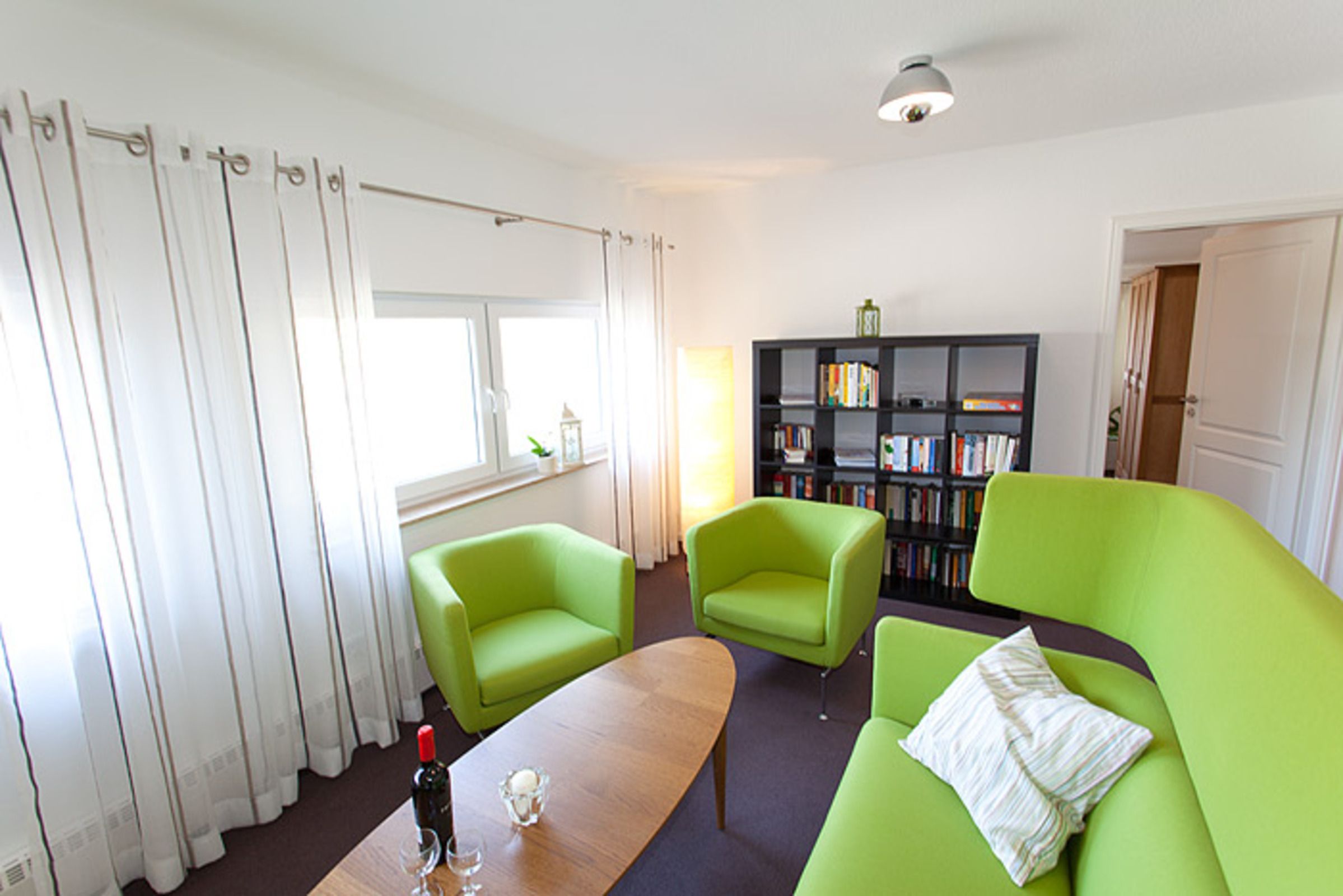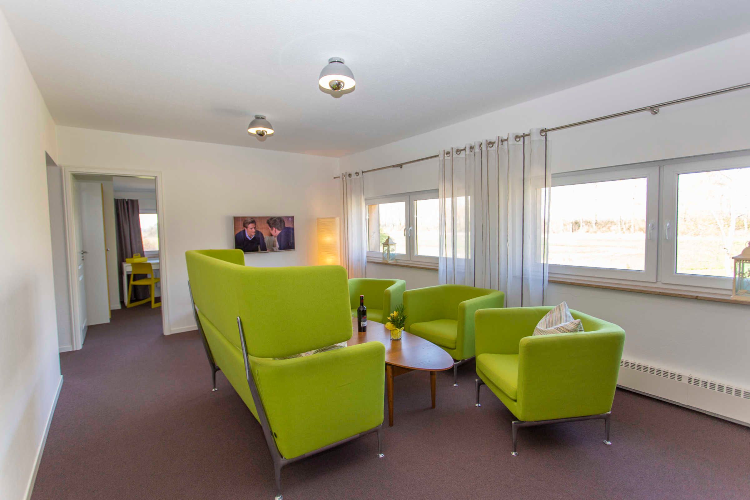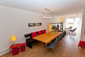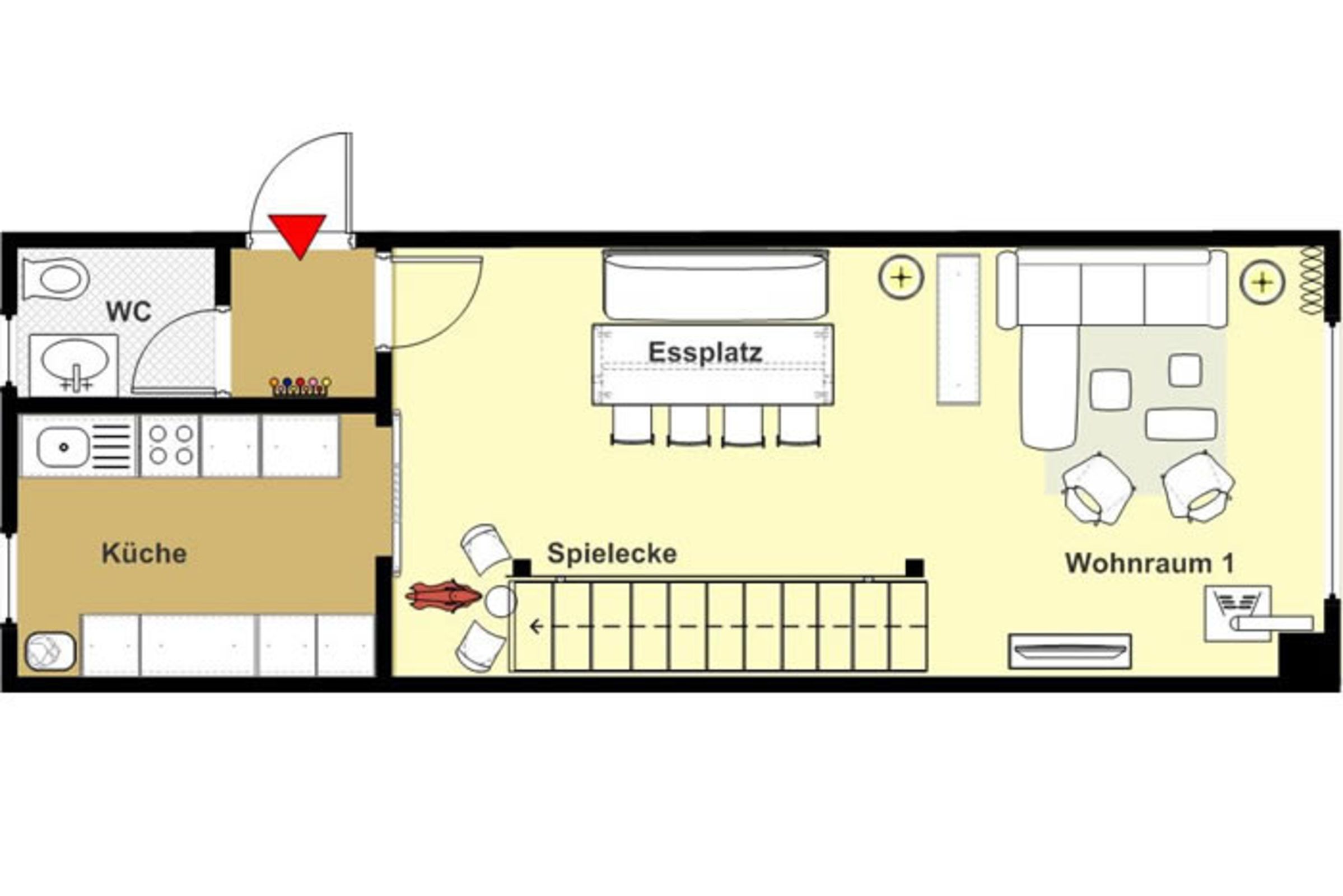 Die Ferienwohnung verfügt in der unteren Etage über ein geraümiges Wohnzimmer mit TV und dem großem Esstisch, der separaten Küche sowie dem Gäste WC.