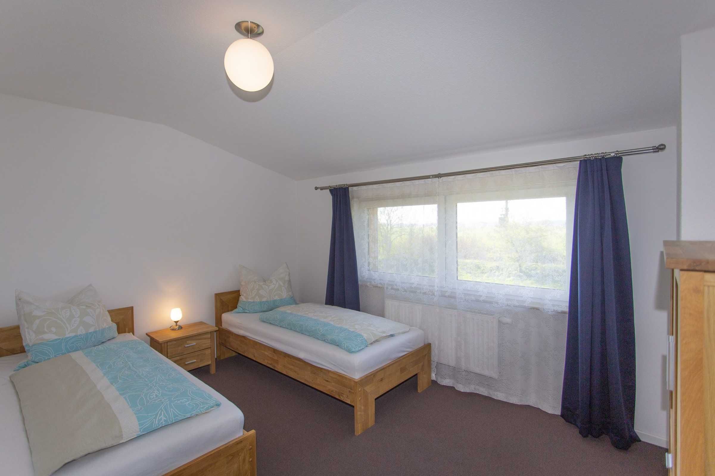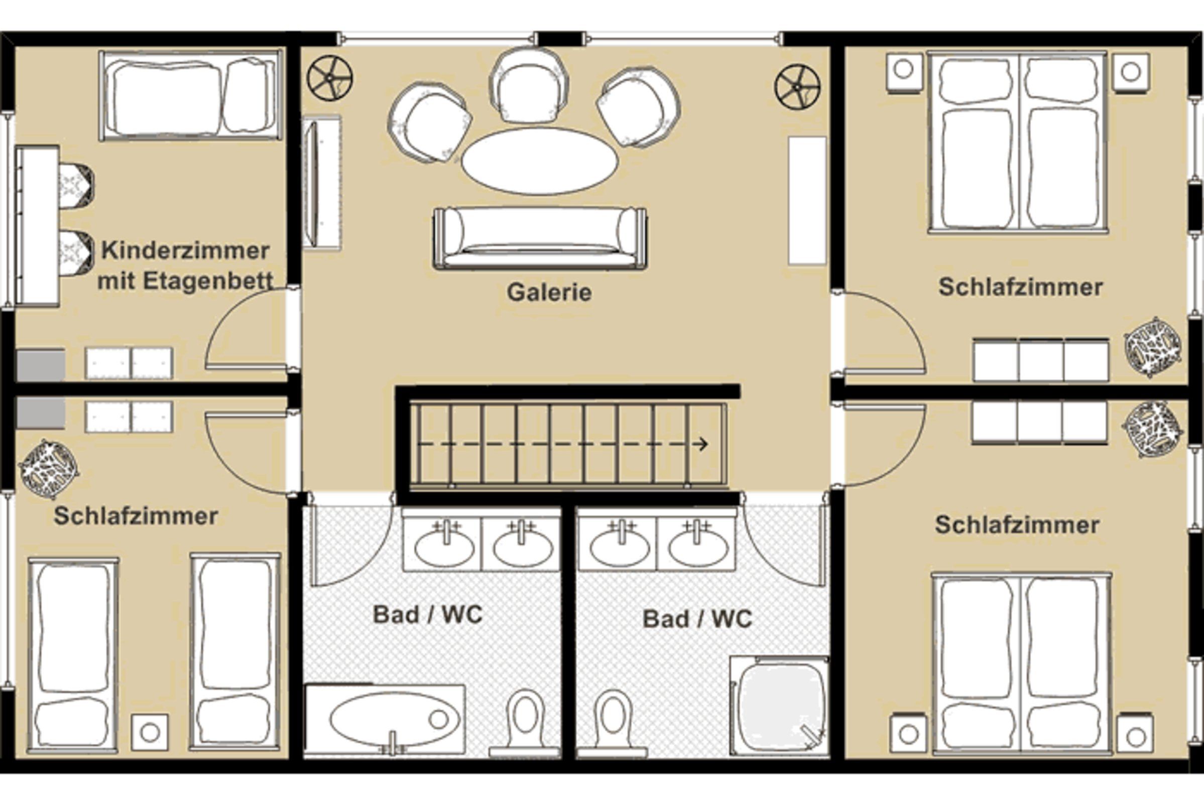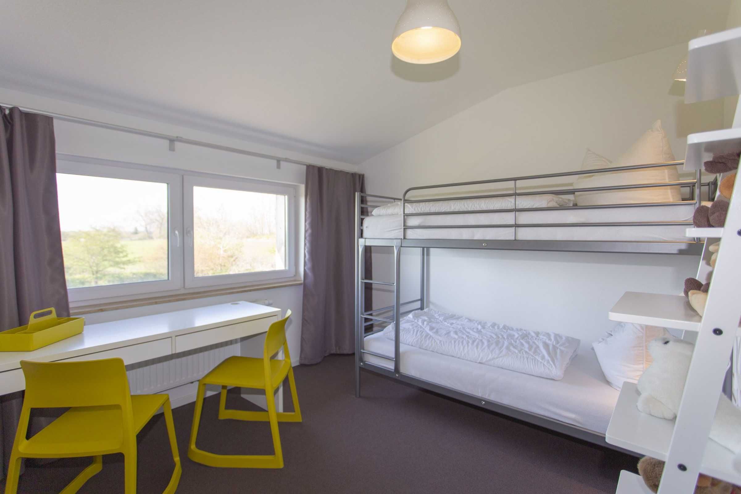 In der oberen Etage finden Sie 2 Schlafzimmer mit Doppelbetten, 1 Schlafzimmer mit Einzelbetten (die auch zusammen gestellt werden können) und 1 Kinderzimmer mit einem Etagenbett.