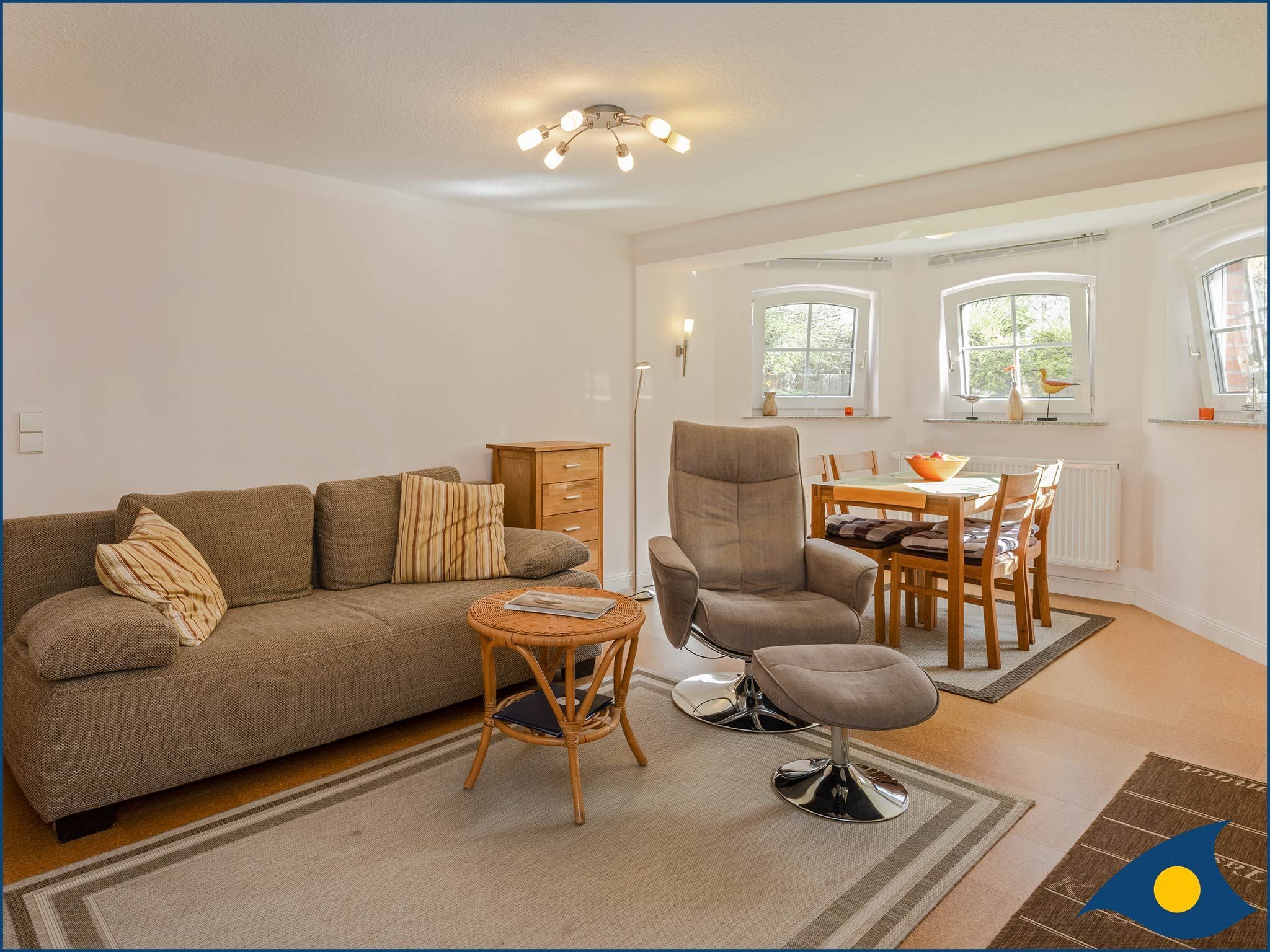 Der freundlich und hell eingerichtete Wohnraum lädt mit seiner Küchenzeile zum gemeinsamen Kochen und einem entspannten Abend auf dem gemütlichen Sofa ein.