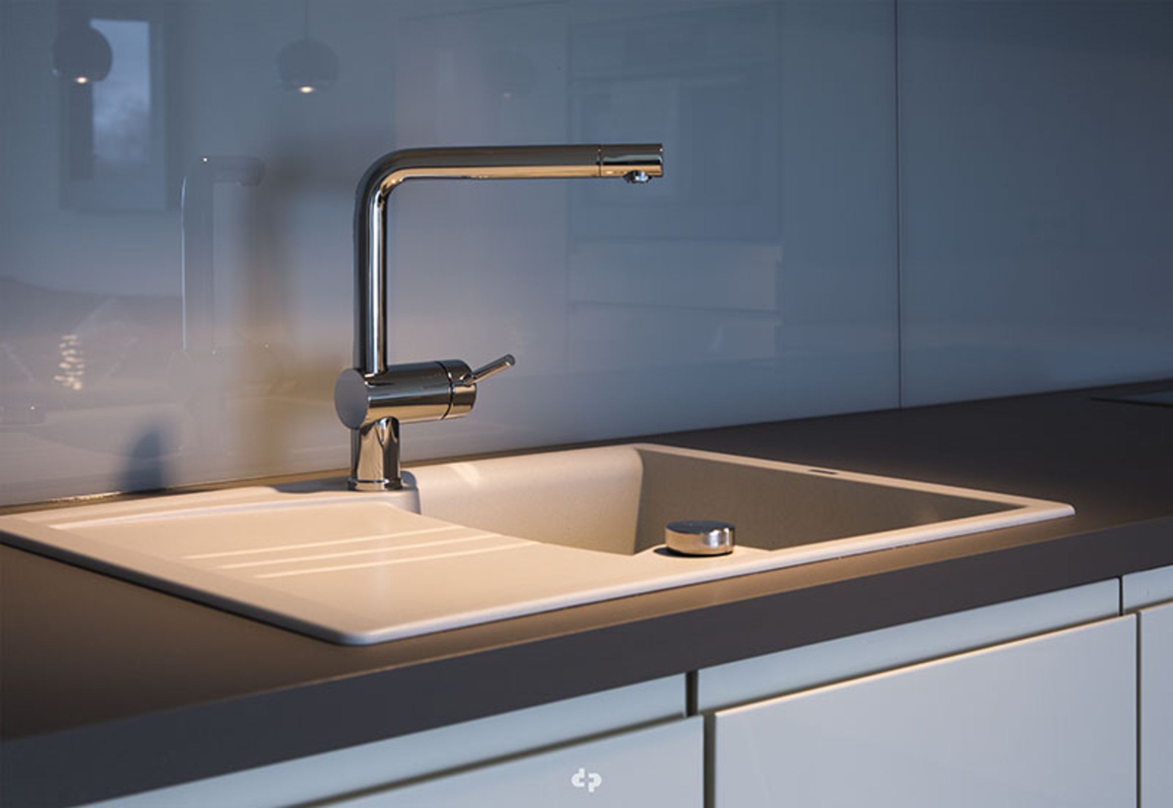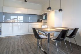 Vom großzügigen Eingangsbereich betreten Sie den Wohnbereich, mit integrierter und voll ausgestatteter Einbauküche. Die hochwertige Küche ist ausgestattet mit Ceranfeld, Backofen, Geschirrspüler, Kühlschrank mit Gefrierfach, Kaffeemaschine, Wasserkocher, Toaster und selbstverständlich ausreichend Geschirr und Besteck.