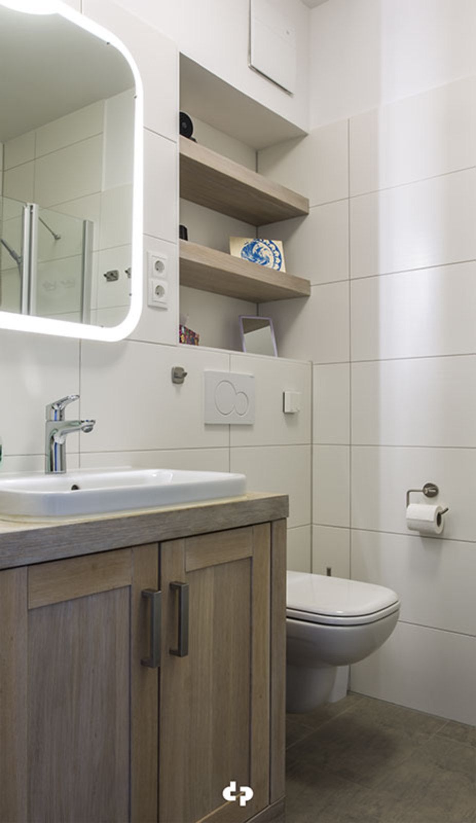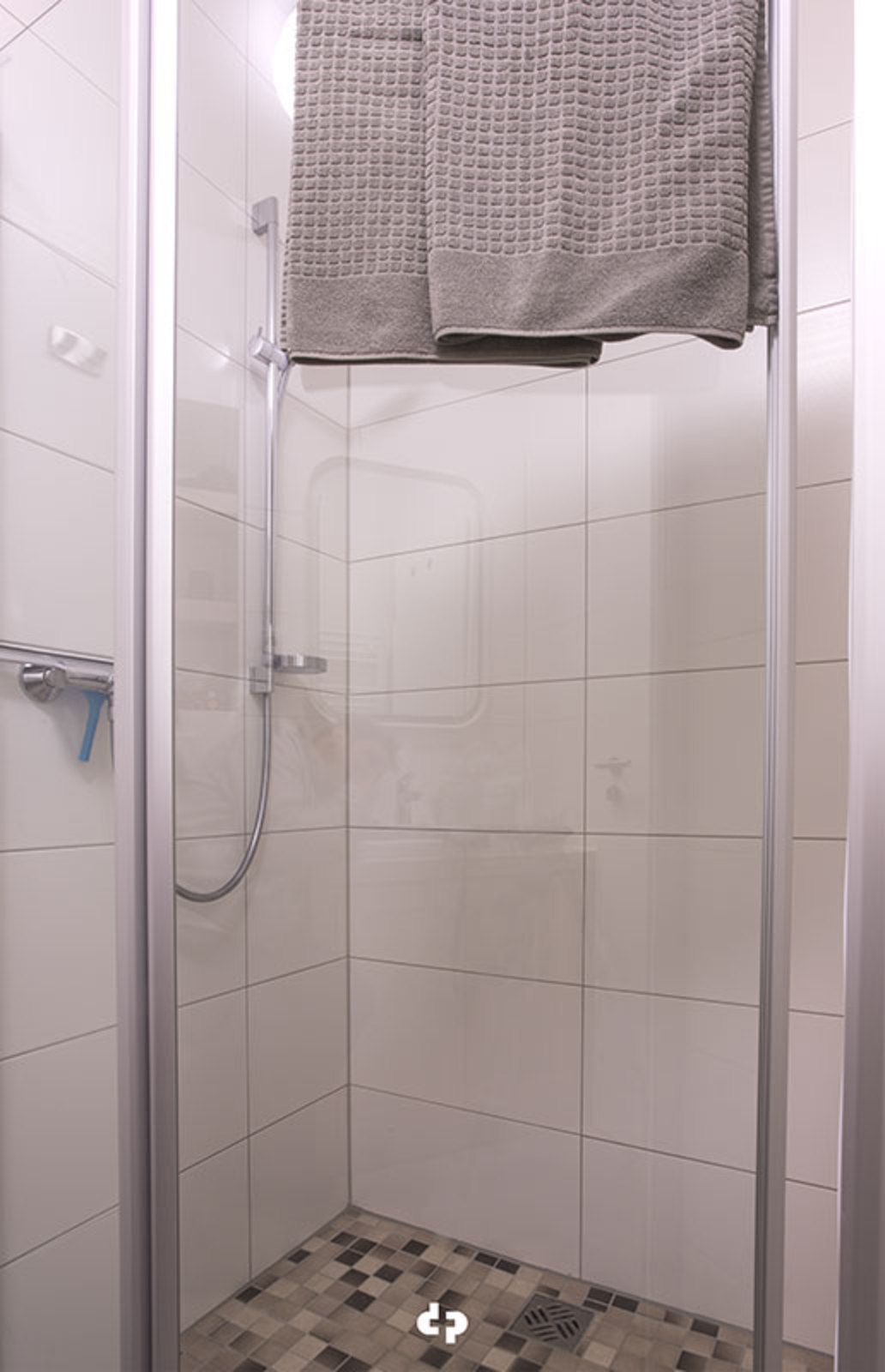 Das Bad verfügt über eine großzügige Dusche, einem Waschplatz, einem WC und Handtuchheizkörper.
