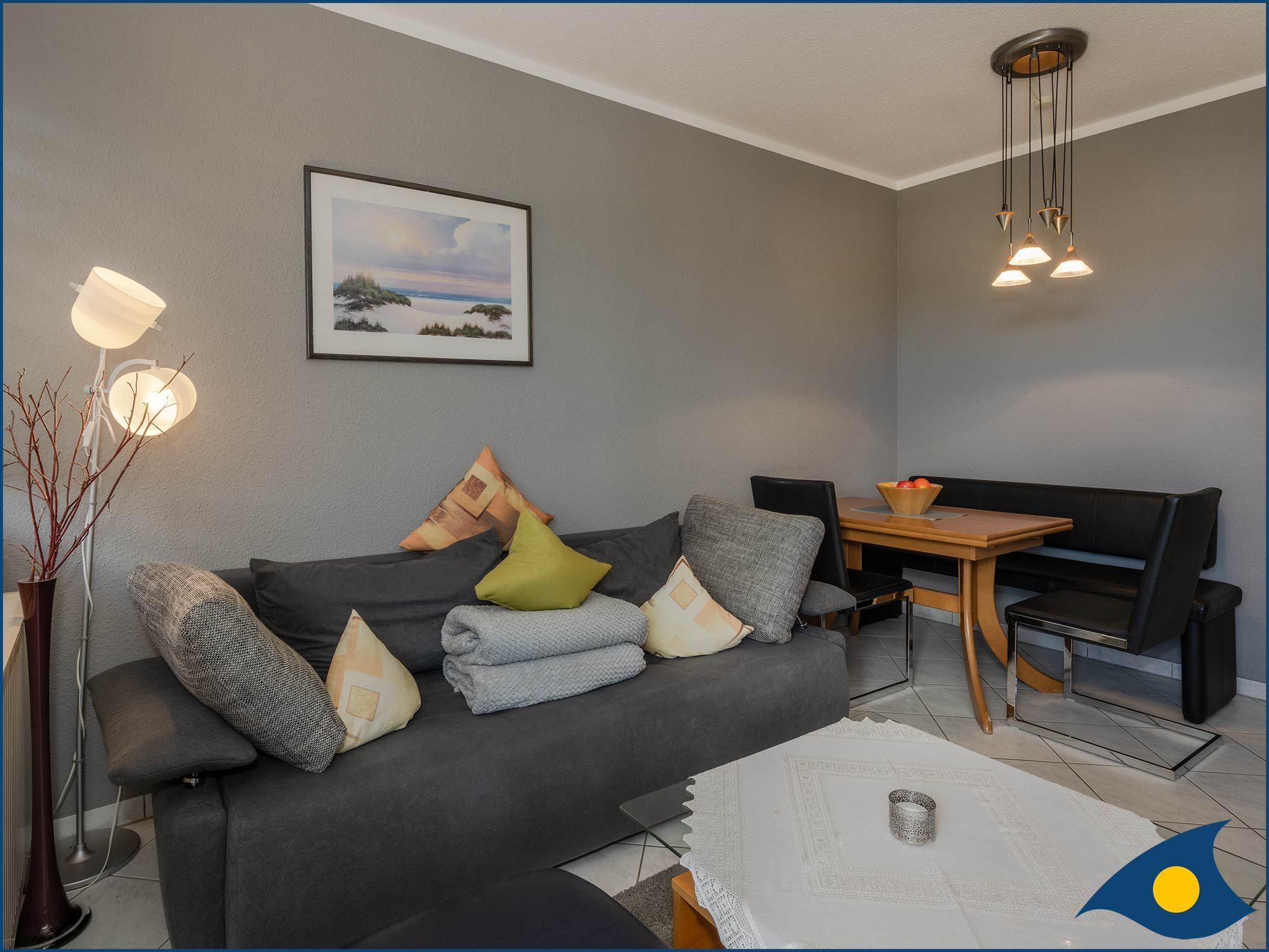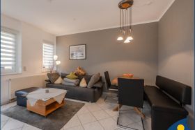 Die separate, voll ausgestattete Küche lädt zum gemeinsamen Kochen ein. Ihre kulinarischen Kreationen können Sie an dem großen Esstisch im Wohnzimmer genießen. Das bequeme Sofa im Wohnbereich kann als Aufbettung für 2 Kinder bis 9 Jahre genutzt werden. Das Wohnzimmer dient zudem als Zugang zum sonnigen Balkon.