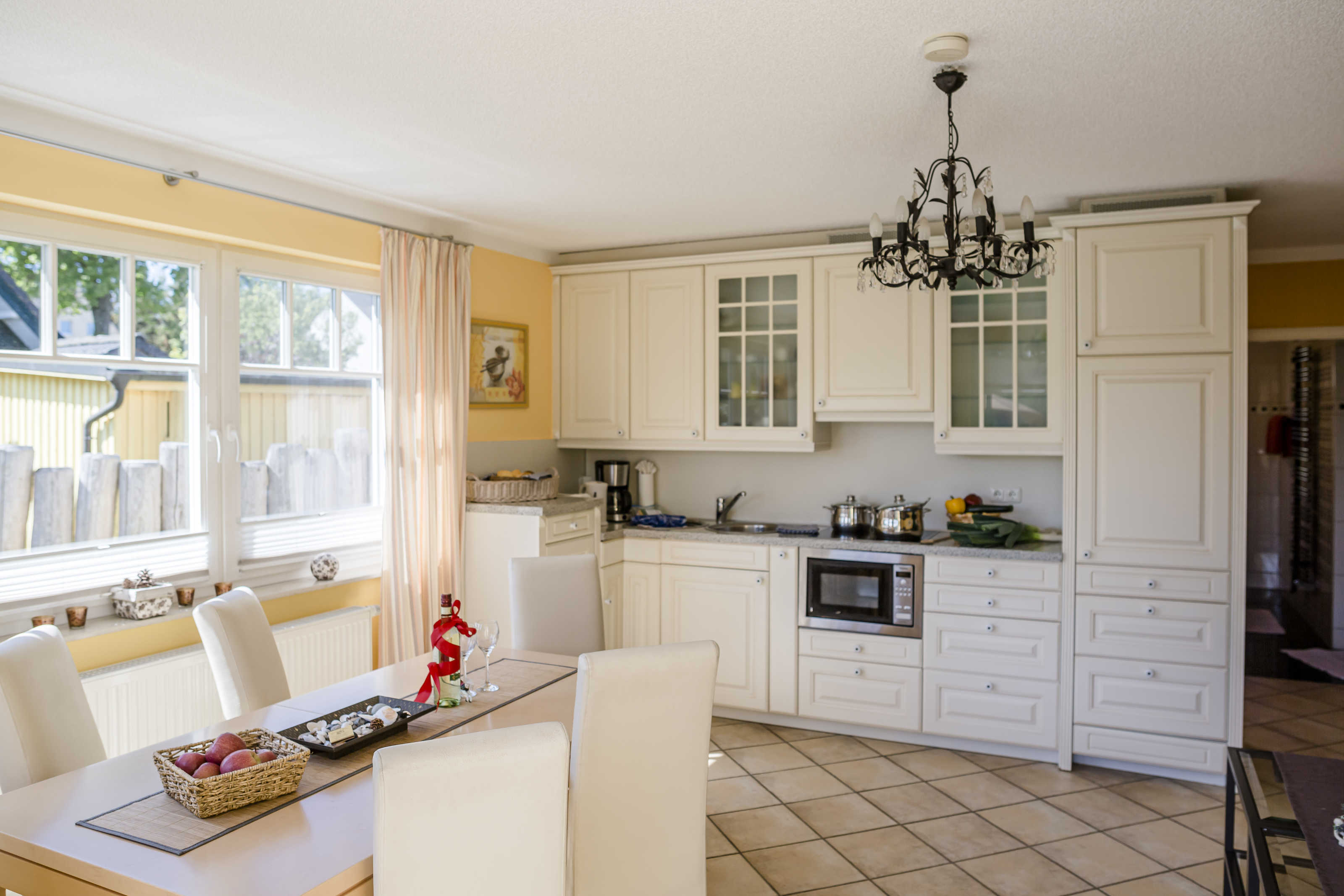 komplett eingerichtete Küche mit Herd, Geschirrspüler und Mikrowelle, Toaster und Kaffeemaschine