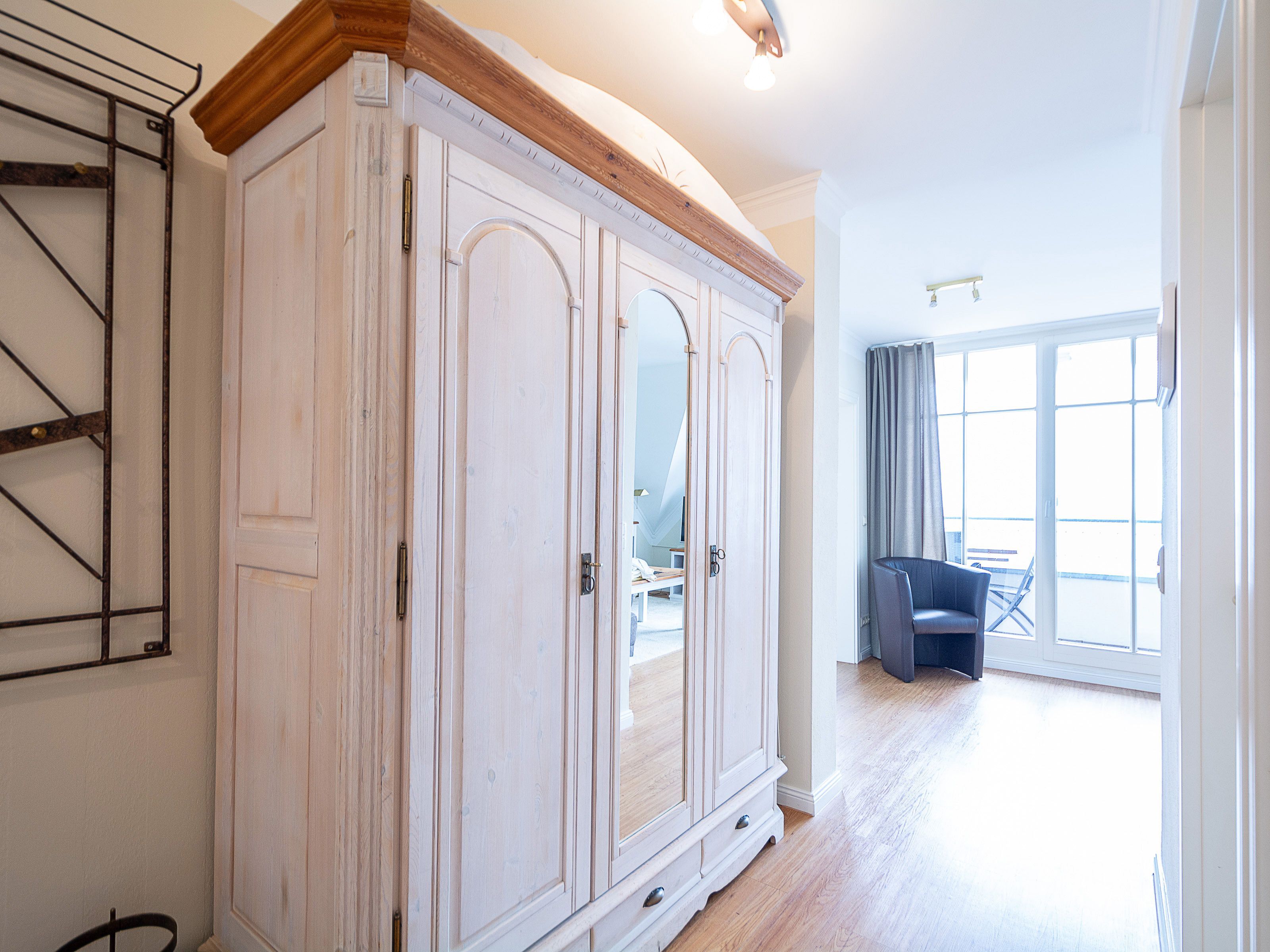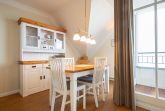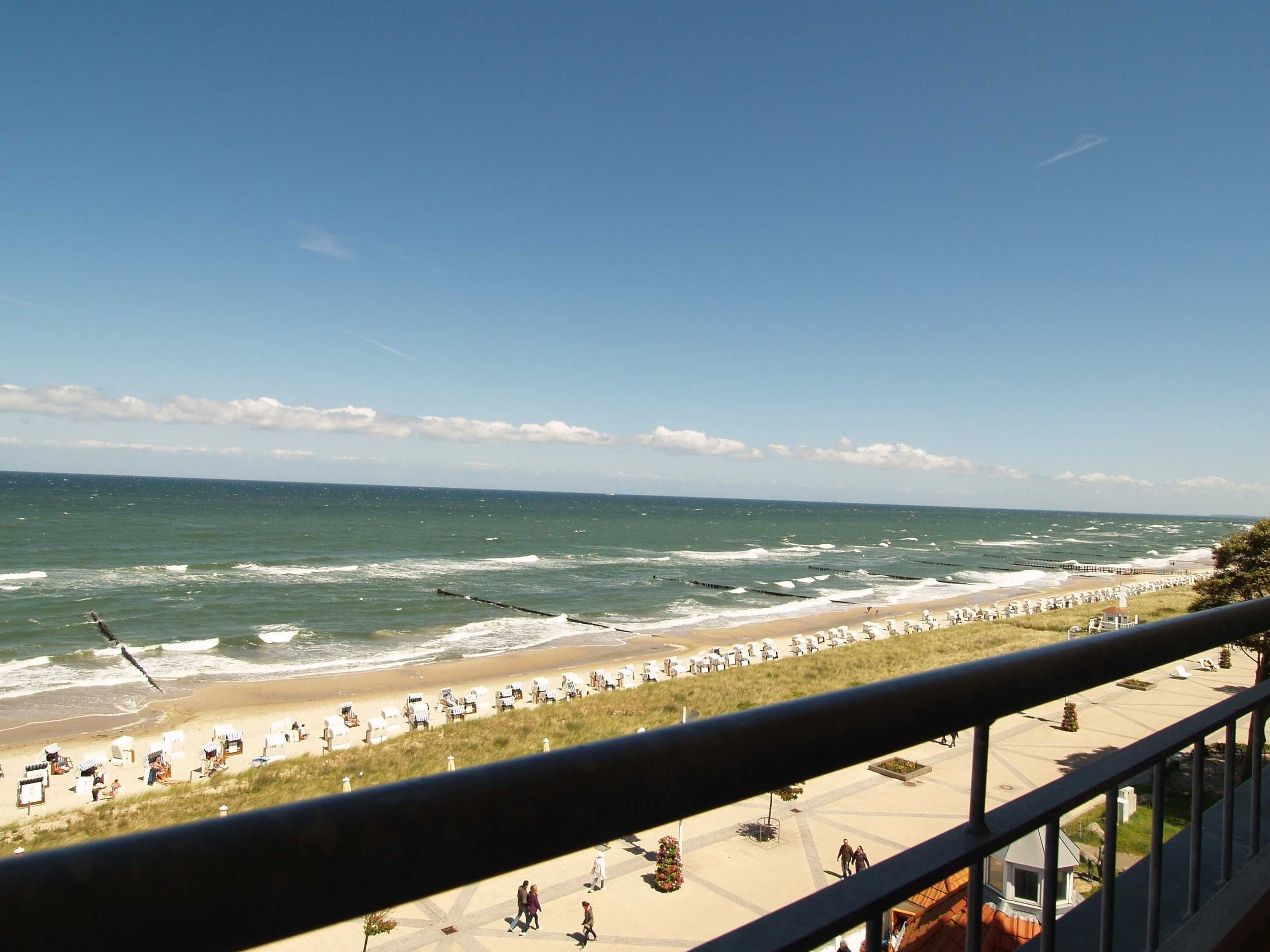 Vom Wohnbereich aus betreten Sie den möblierten Balkon, der nach Norden ausgerichtet ist und einen fantastischen Blick auf die Ostsee un die Promenade bereithält. Hier können Sie Sonne tanken, relaxen und den Abend nach einem schönen Tag am Meer ausklingen lassen.