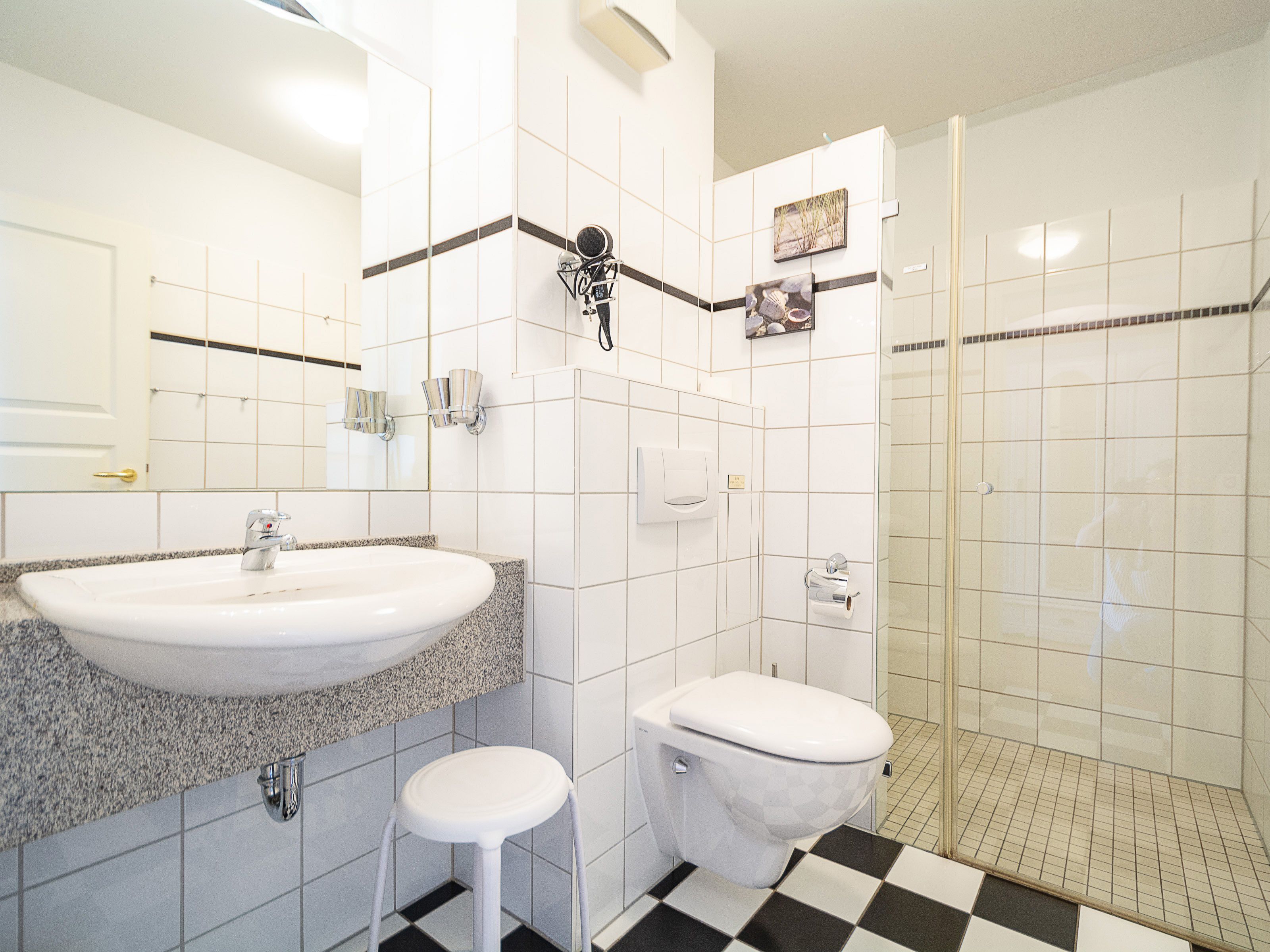 Des Weiteren verfügt die Wohnung über zwei großzügige Bäder. Das erste Bad ist ausgestattet mit einer bodengleichen Dusche sowie einem Duschstuhl, Waschbecken und WC sowie einem Föhn. Im zweiten Bad können Sie entspannte Stunden in der einladenden Badewanne genießen, perfekt für erholsame Momente nach einem ereignisreichen Tag am Meer. Ein WC, ein Föhn und ein Kosmetikspiegel komplettieren die Badeinrichtung.