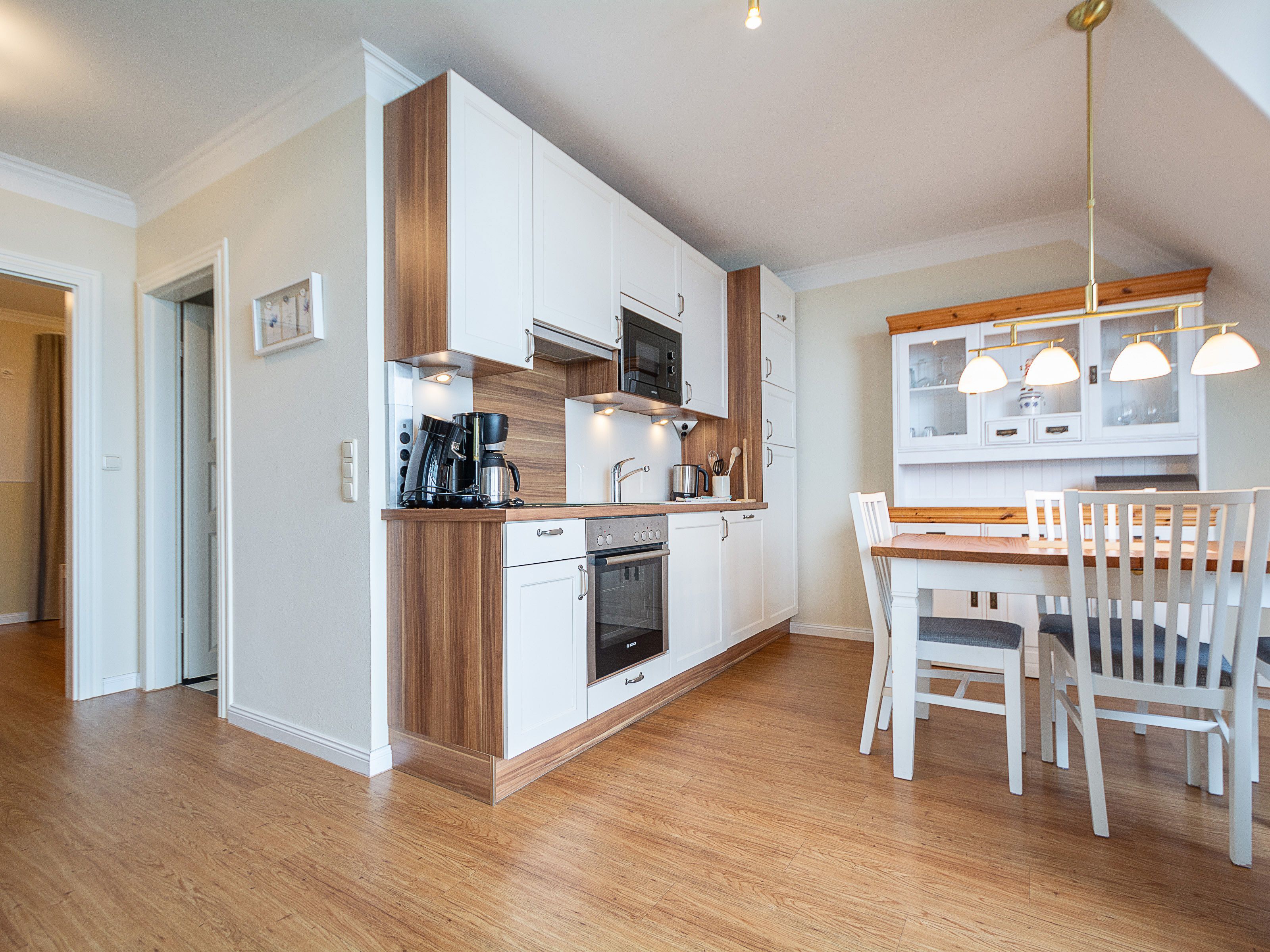 Die anschließende moderne Küchenzeile bietet alle wichtigen Küchengeräte und -utensilien, die Sie für Ihr perfektes Dinner benötigen. Ein 4-Zonen-Ceranfeld mit Backofen und Dunstabzug, eine Mikrowelle in bequemer Stehhöhe, eine große Kühl-Gefrier-Kombination sowie ein Geschirrspüler befinden sich in der Küche. Eine Kaffeemaschine und eine Senseo Pad Kaffemaschine, ein Wasserkocher und ein Toaster sowie genügend Koch- und Essgeschirr vervollständigen die Kücheneinrichtung.
