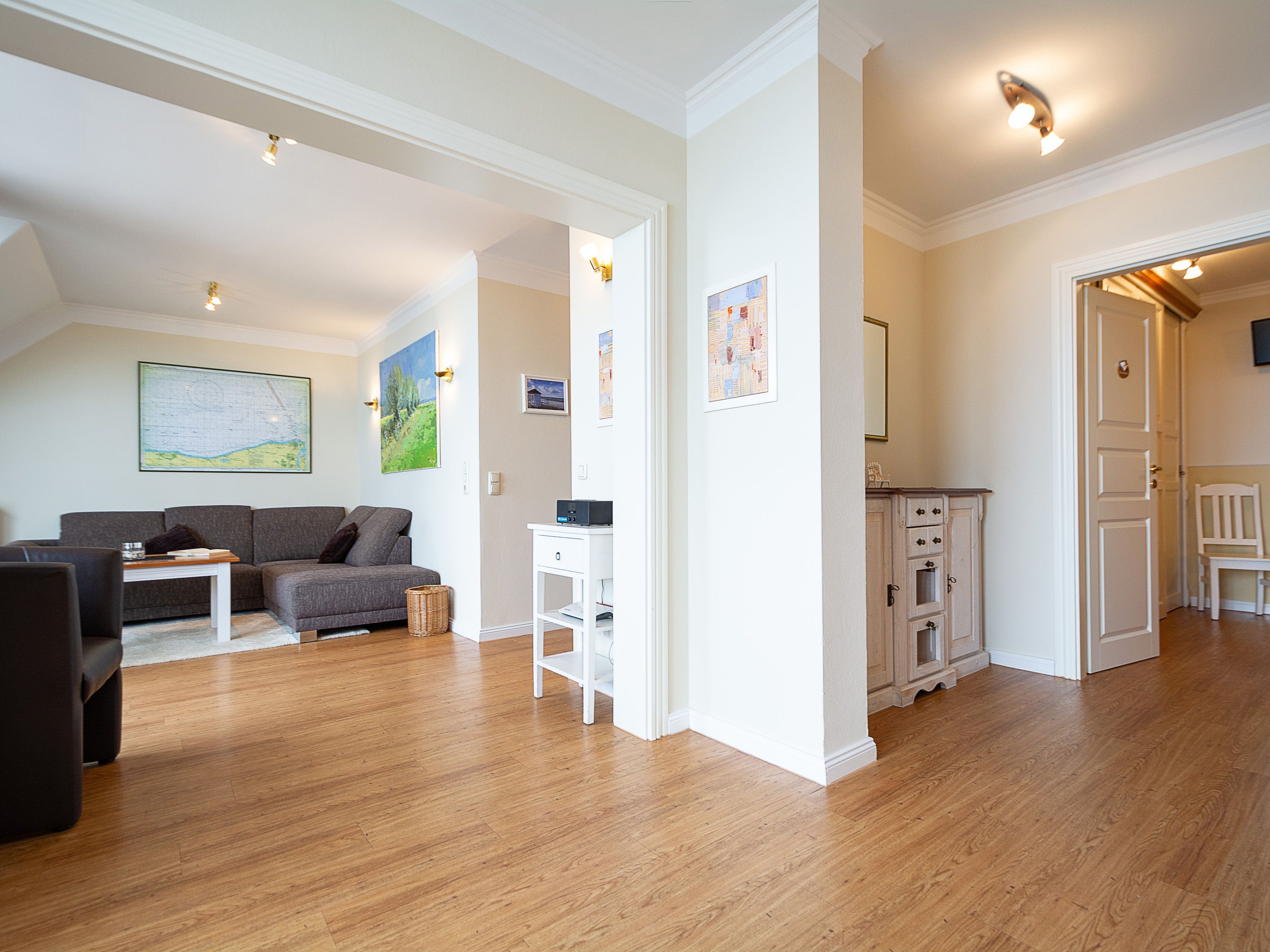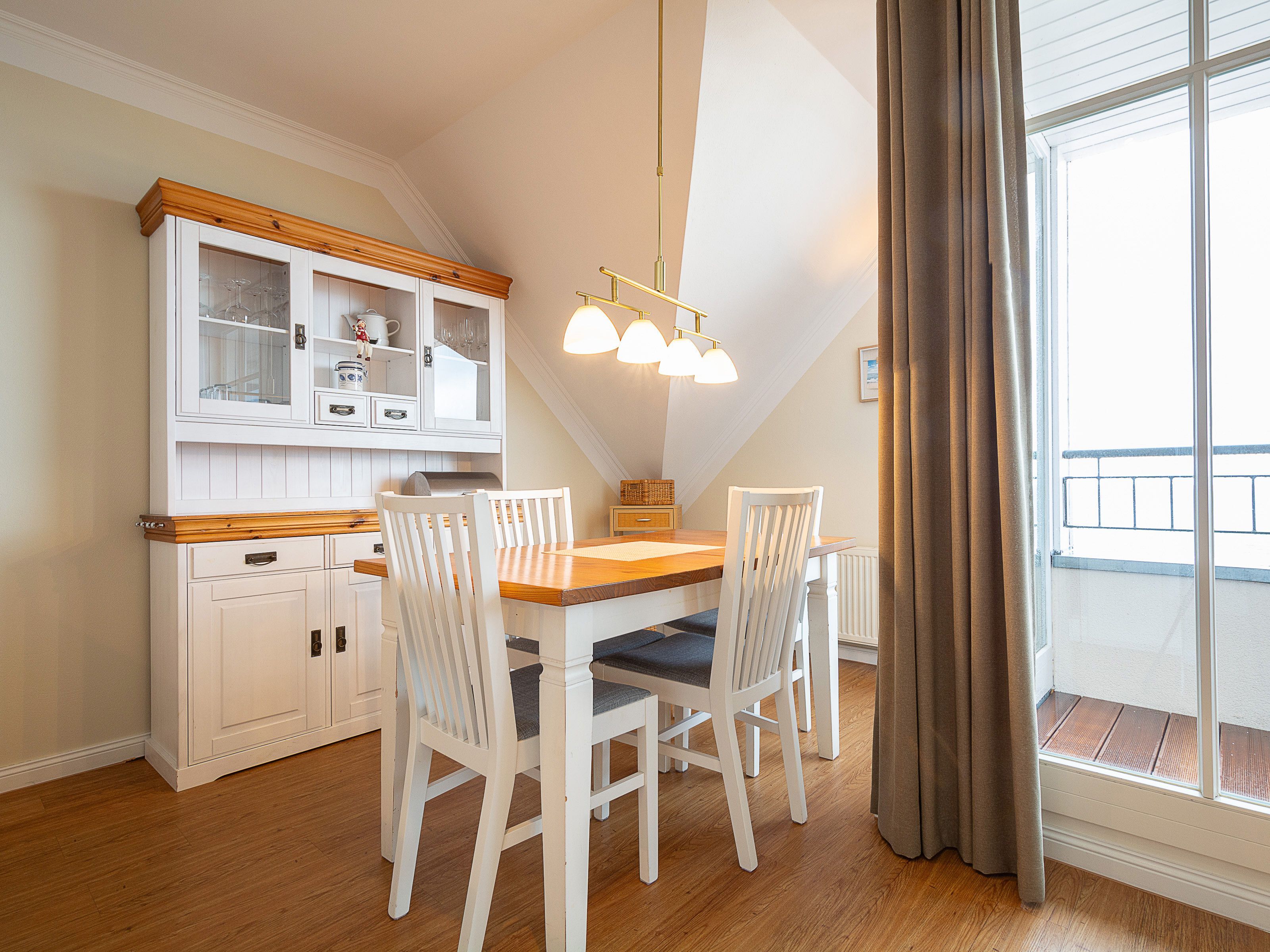 Die im mediterranen Landhausstil gestaltete 3-Raum-Ferienwohnung befindet sich im 5. Obergeschoss des Hauses Meeresblick. Auf 75 qm Wohnfläche können hier bis zu 4 Personen erholsame Urlaubstage genießen. Es begrüßt Sie ein heller lichtdurchfluteteter Wohnraum, dessen Herzstück ist die Fensterfront mit Blick auf die Ostsee. Der Wohnbereich ist mit einer gemütlichen Sitzecke mit bequemer Couch, Flatscreen-TV, DVD-Player und einer Musikanlage eingerichtet. Ein Esstisch mit 4 Stühlen bietet reichlich Platz für gemeinsame Mahlzeiten mit Blick aufs Meer.
