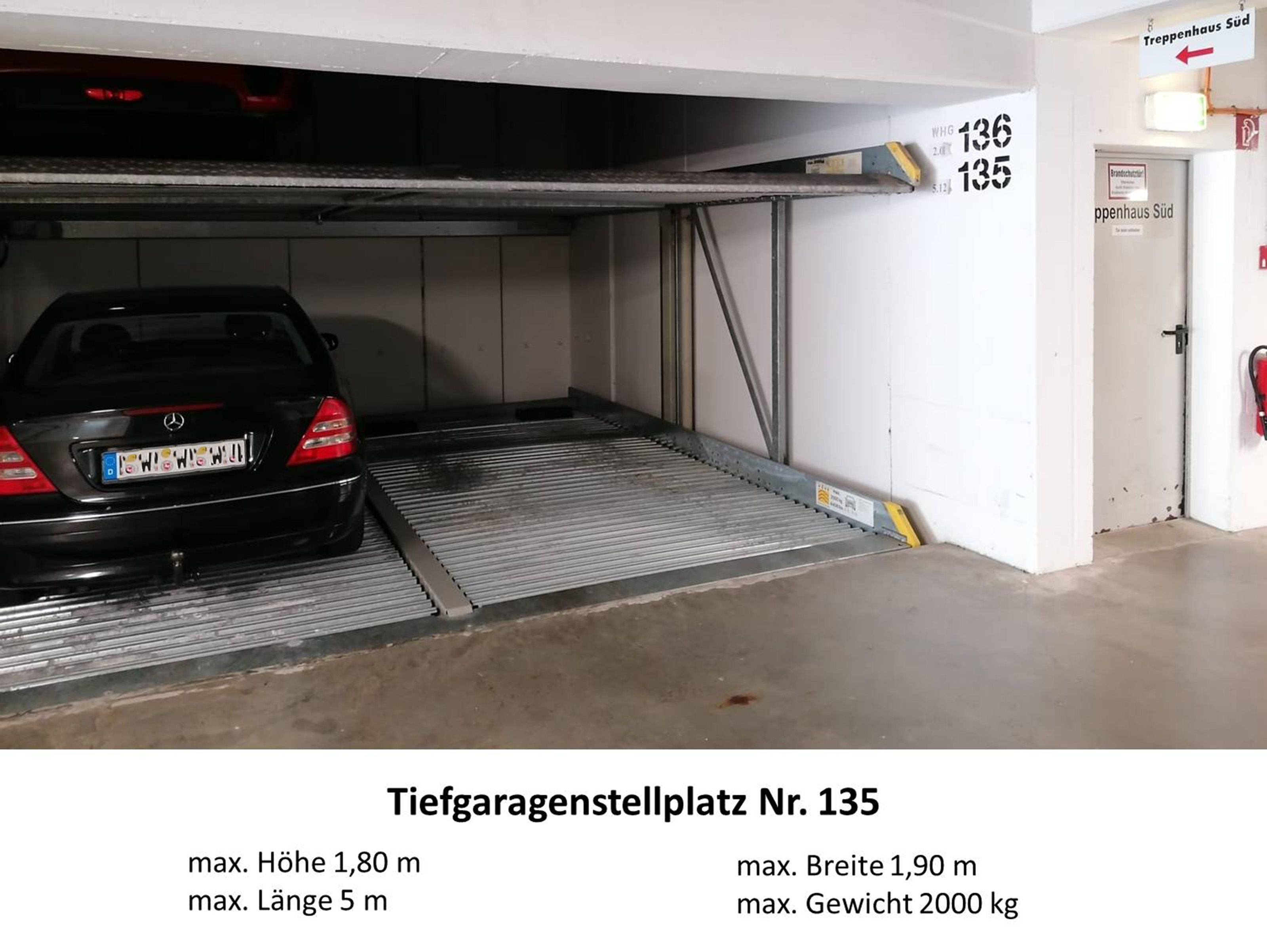 Zur Wohnung gehört ein Tiefgaragenstellplatz mit der Stellplatznummer 135. Dabei handelt es sich um eine Doppelparkanlage (Standardanlage bei Stellplatzbreite 2,30 m). Bitte beachten Sie, dass Ihr Pkw folgende Angaben nicht überschreitet.:
