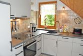 Die moderne Küchenzeile ist mit einem Herd, Abzugshaube, Backofen, Spülmaschine, Wasserkocher, Kaffeemaschine, Toaster und Kühlschrank komplett ausgestattet.
