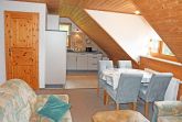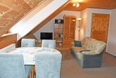 Im Wohnraum befinden sich eine bequeme Sitzcouch mit Tisch und ein modernes Flachbild-TV-Gerät sowie einem CD-Player. Hier steht für Sie auch ein Esstisch mit Sitzgelegenheiten.