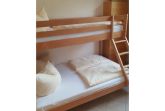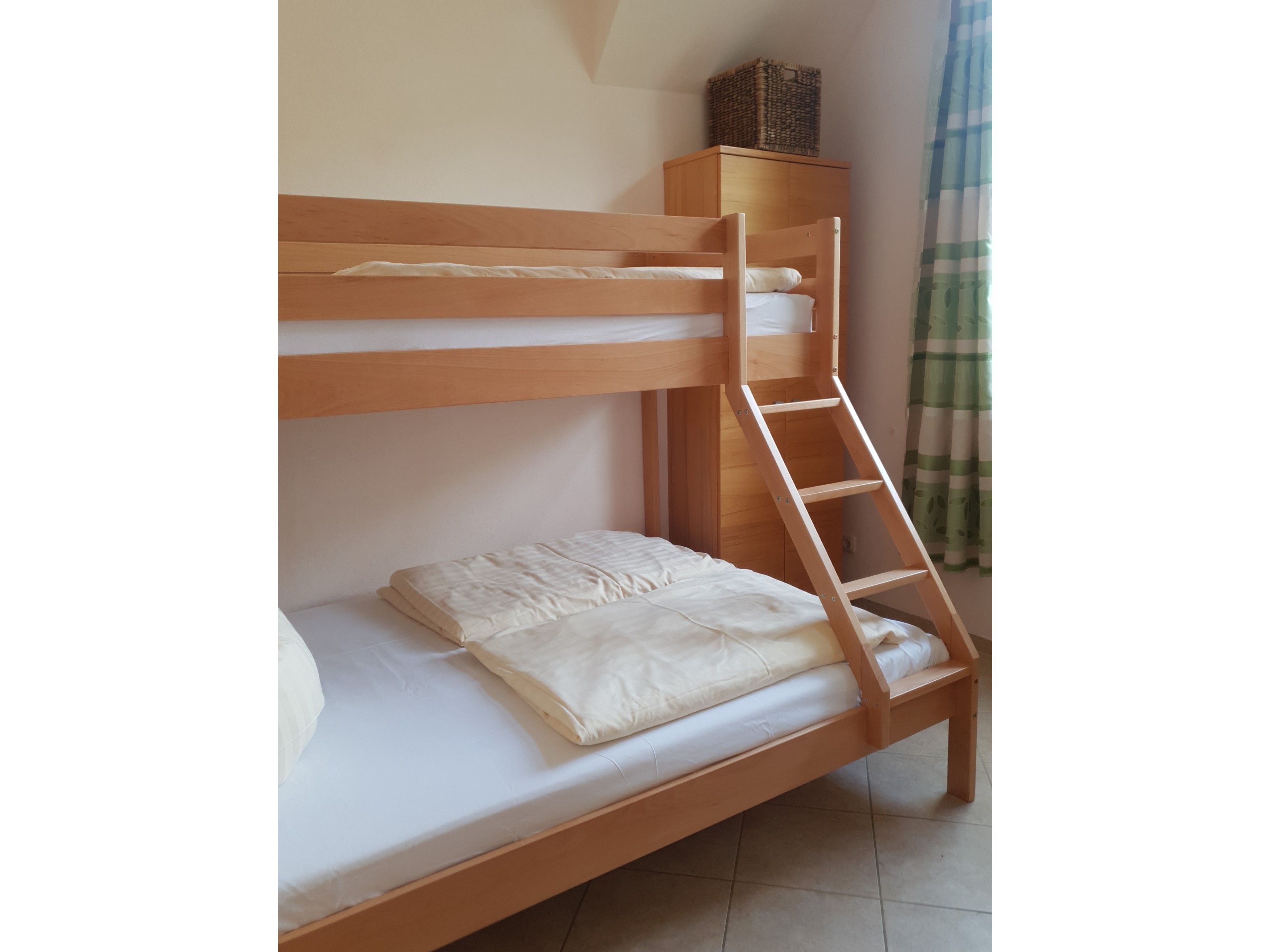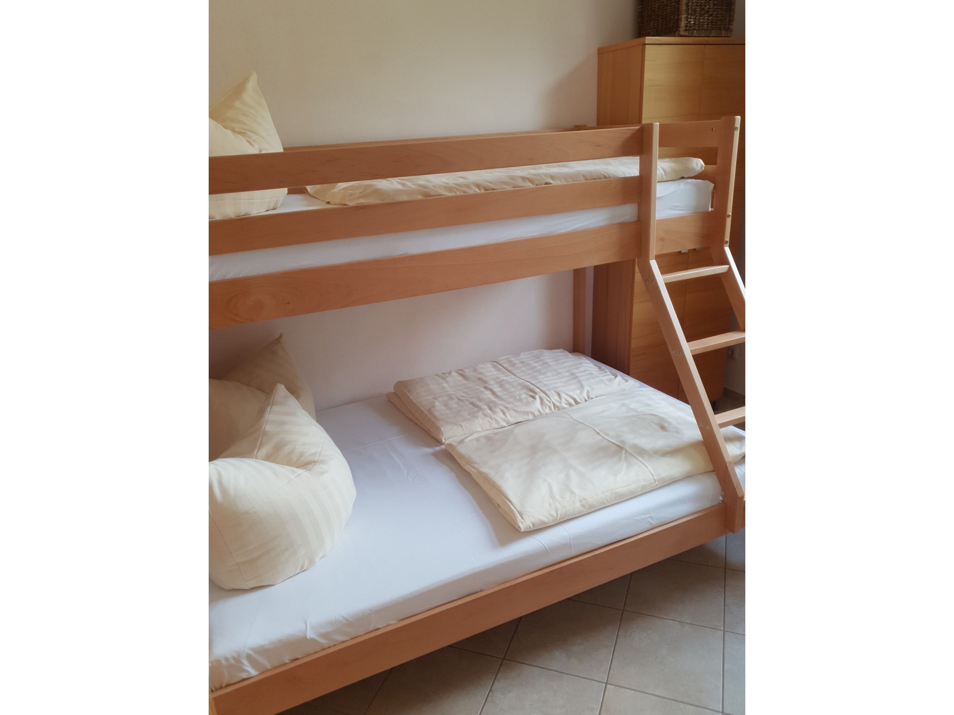 Während das eine mit einem Doppelbett und Kleiderschrank ausgestattet ist, befindet sich in dem anderen ein Doppelstockbett mit zwei verschiedenen Liegeflächen (90 x 200 cm und 140 x 200 cm), so dass dort auch gut 3 Personen schlafen können.Weitere Aufbettungen sind im Wohnzimmer auf der Schlafcouch möglich.