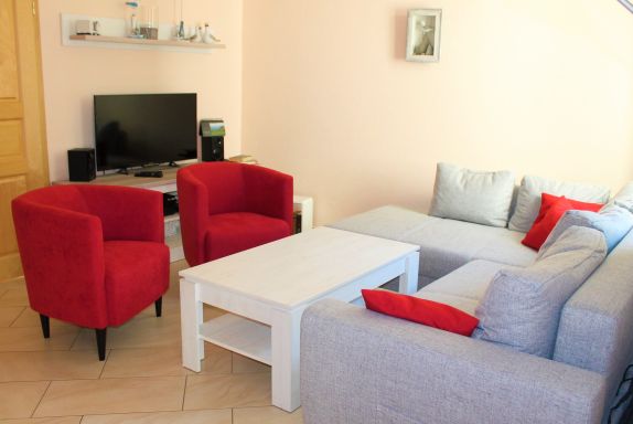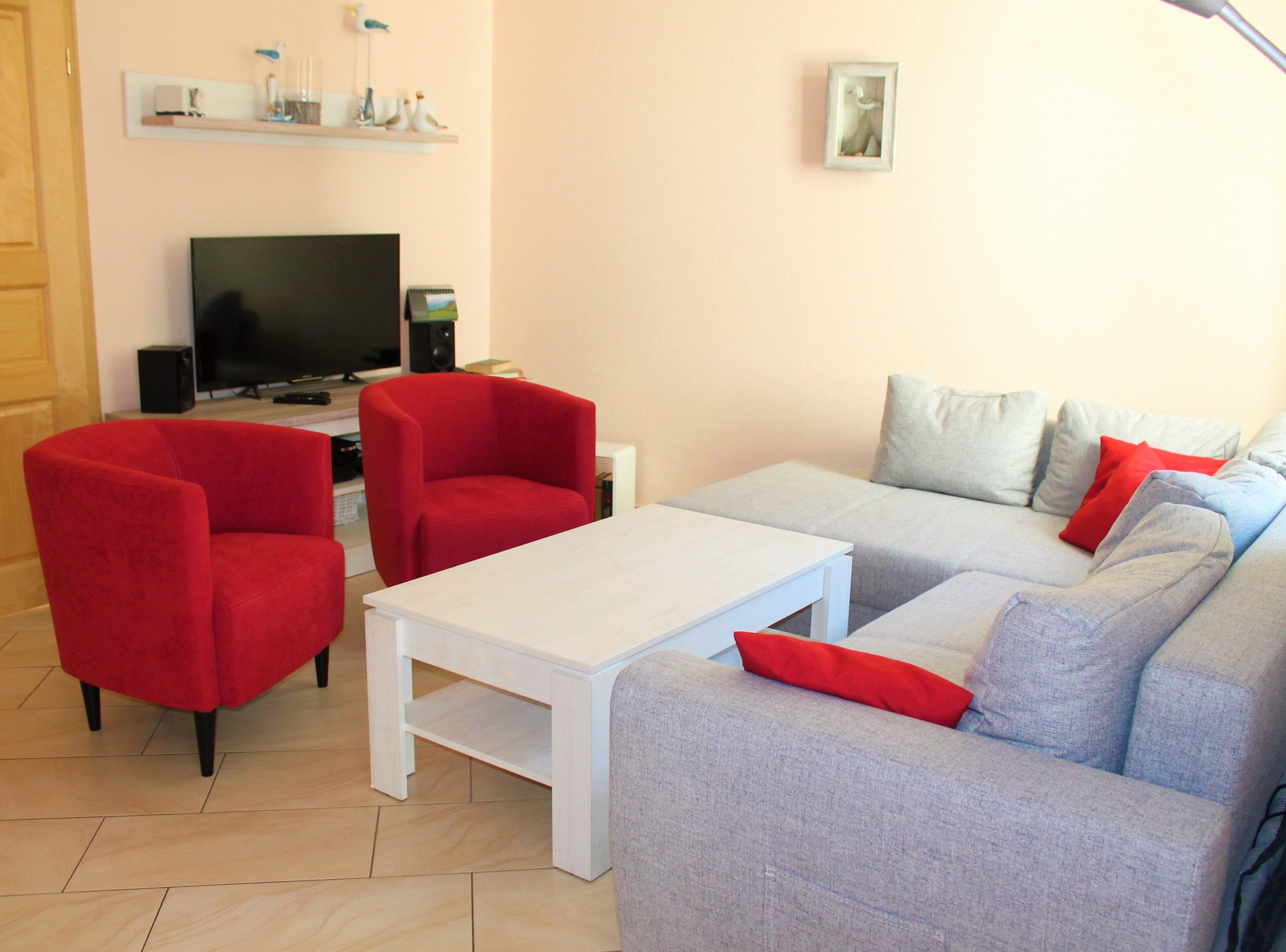 Das modern eingerichtete Wohnzimmer mit großer Couch, Flachbild-TV und DVD-Player hat Wohlfühlcharakter.
